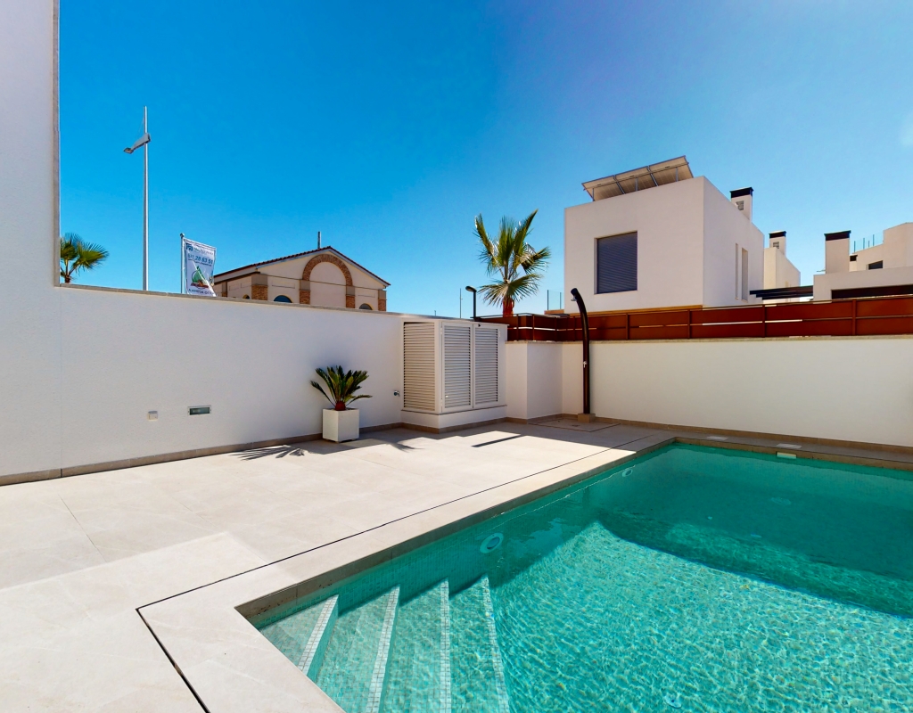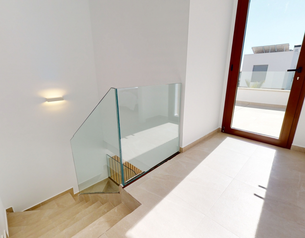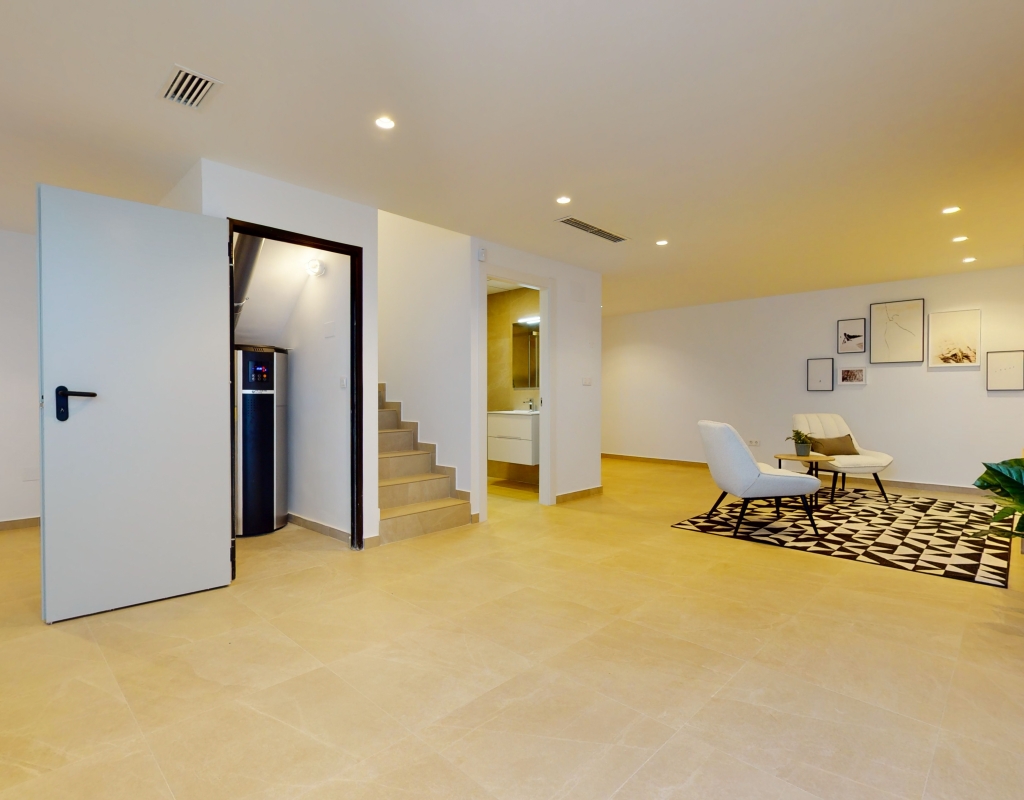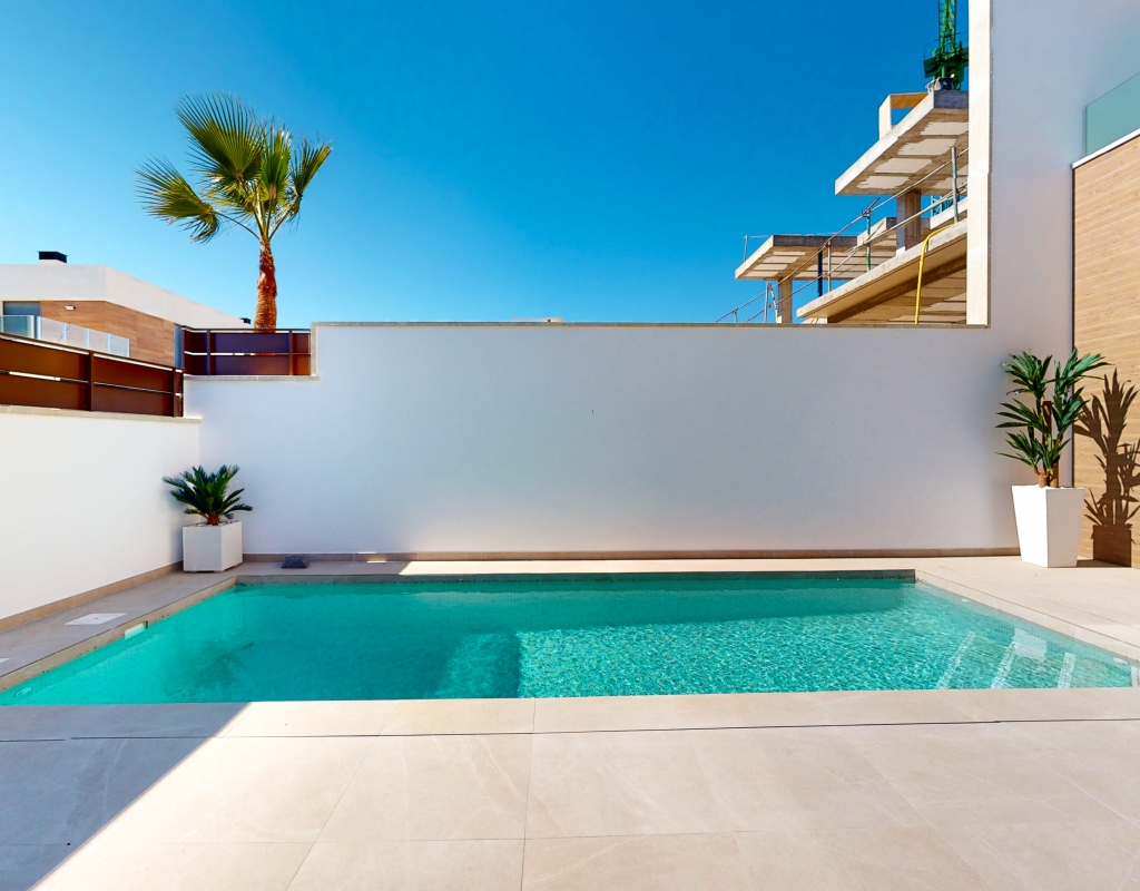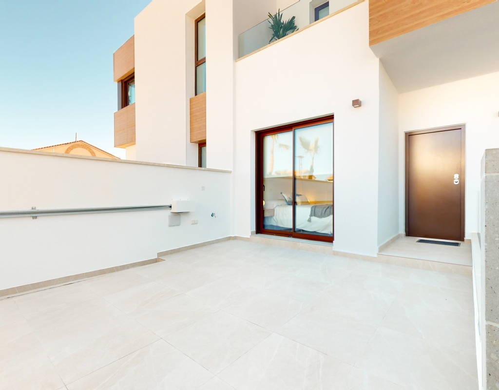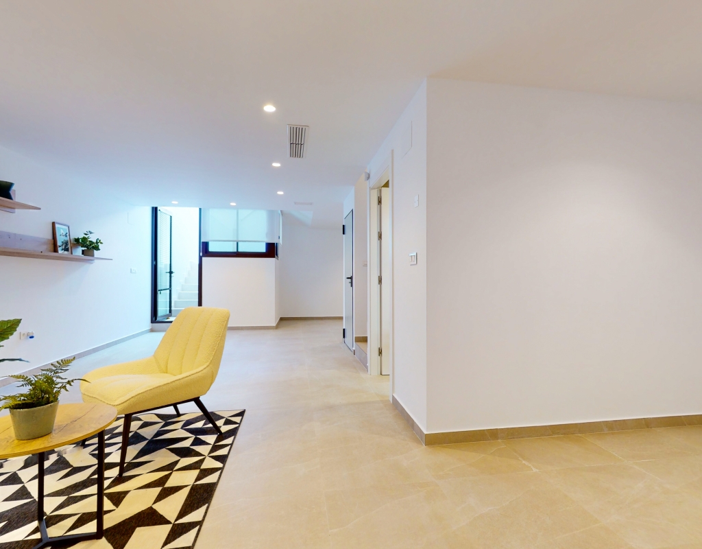 Estas casas adosadas de tres dormitorios con orientación sur en La Finca Golf Resort se están construyendo en un complejo de hotel, golf y spa de 5 * en el área de Algorfa. Las comodidades en el complejo, que incluyen una variedad de cafés, bares, restaurantes, tiendas, etc., están a solo unos minutos a pie y el acceso al campo de golf/hotel/spa está a veinte minutos a pie o a un par de minutos en automóvil... Estos las impresionantes propiedades se componen de una sala de estar de planta abierta, con puertas corredizas casi de pared a pared que inundan la habitación con luz natural, y también tienen una persiana interna decorativa eléctrica, que permite el acceso al jardín de azulejos y la piscina; cocina equipada única y elegante de planta abierta que incluye electrodomésticos; habitación doble; cuarto de baño familiar. En la primera planta hay otros dos dormitorios dobles, ambos con terraza y cuartos de baño con ducha, el principal con acceso al espacioso solárium. El sótano tiene aire acondicionado preinstalado, sala de estar y la opción de un dormitorio adicional, con acceso interno y externo. Los extras incluyen armarios empotrados y persianas eléctricas en los dormitorios, aire acondicionado, interfono, iluminación exterior e interior, caldera de aerotermia, zona ajardinada y aparcamiento exterior.
