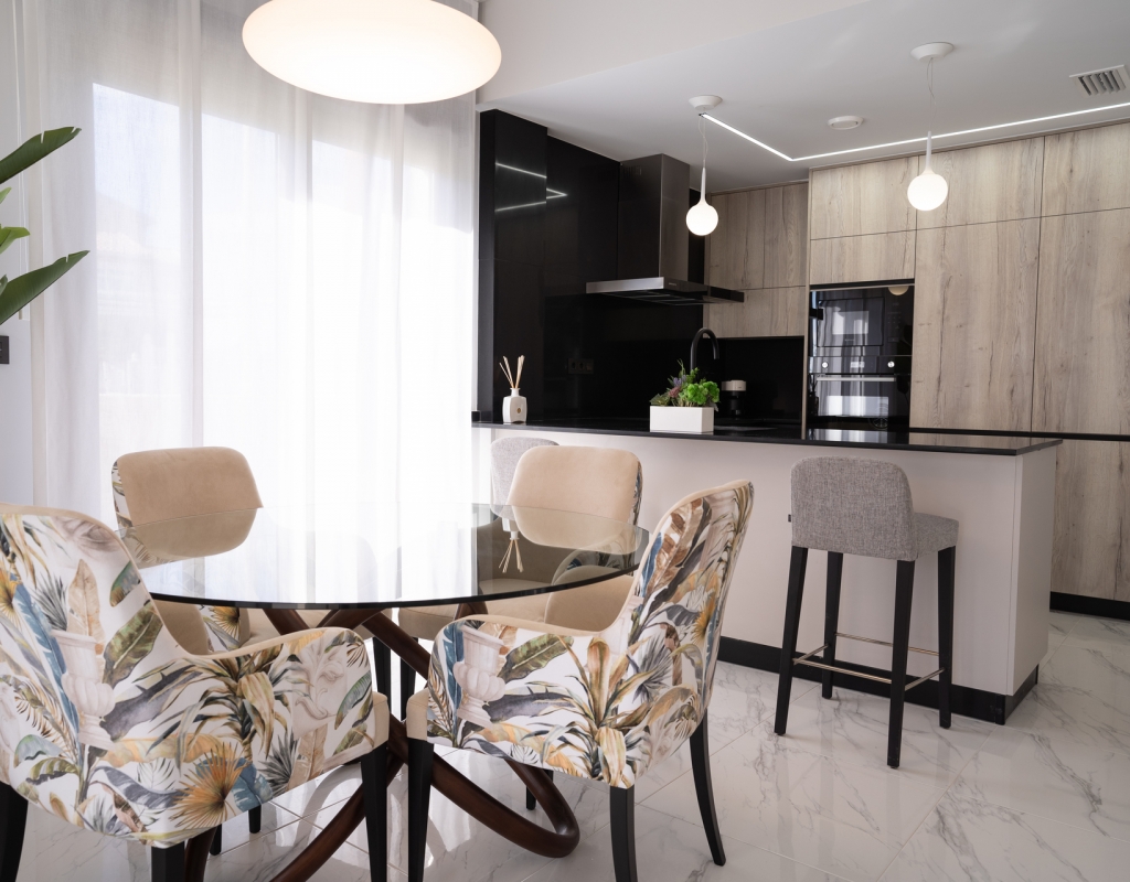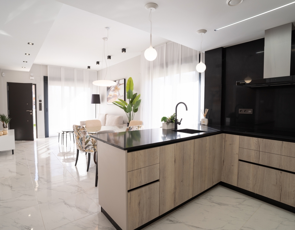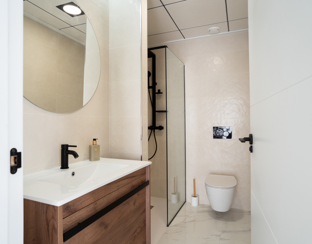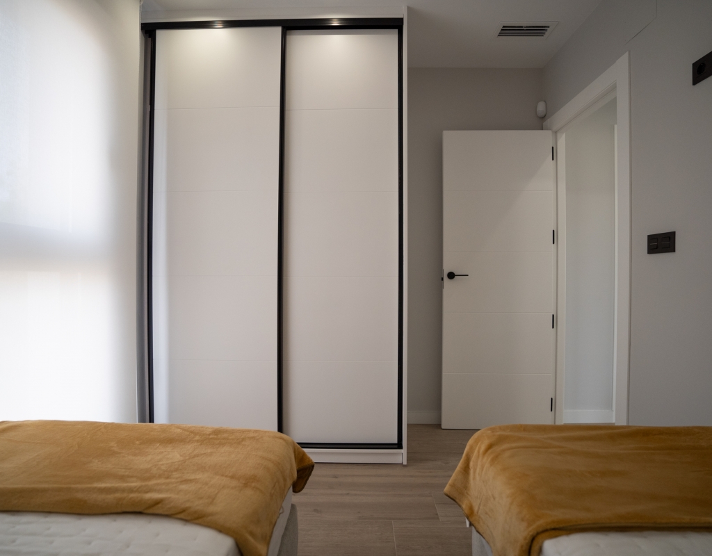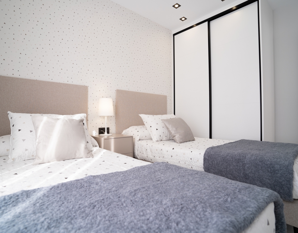 El interior de estas viviendas combina funcionalidad y estilo. Los suelos de gres porcelánico aportan un toque moderno y son fáciles de mantener. Las persianas eléctricas y los armarios empotrados son características estándar que añaden comodidad y espacio de almacenamiento. La preinstalación de aire acondicionado asegura que las viviendas estén preparadas para la instalación de sistemas de climatización, adaptándose a las necesidades de confort de cada propietario. La distribución de las viviendas está pensada para ofrecer espacios amplios y luminosos, con una clara separación entre las áreas de día y de noche.