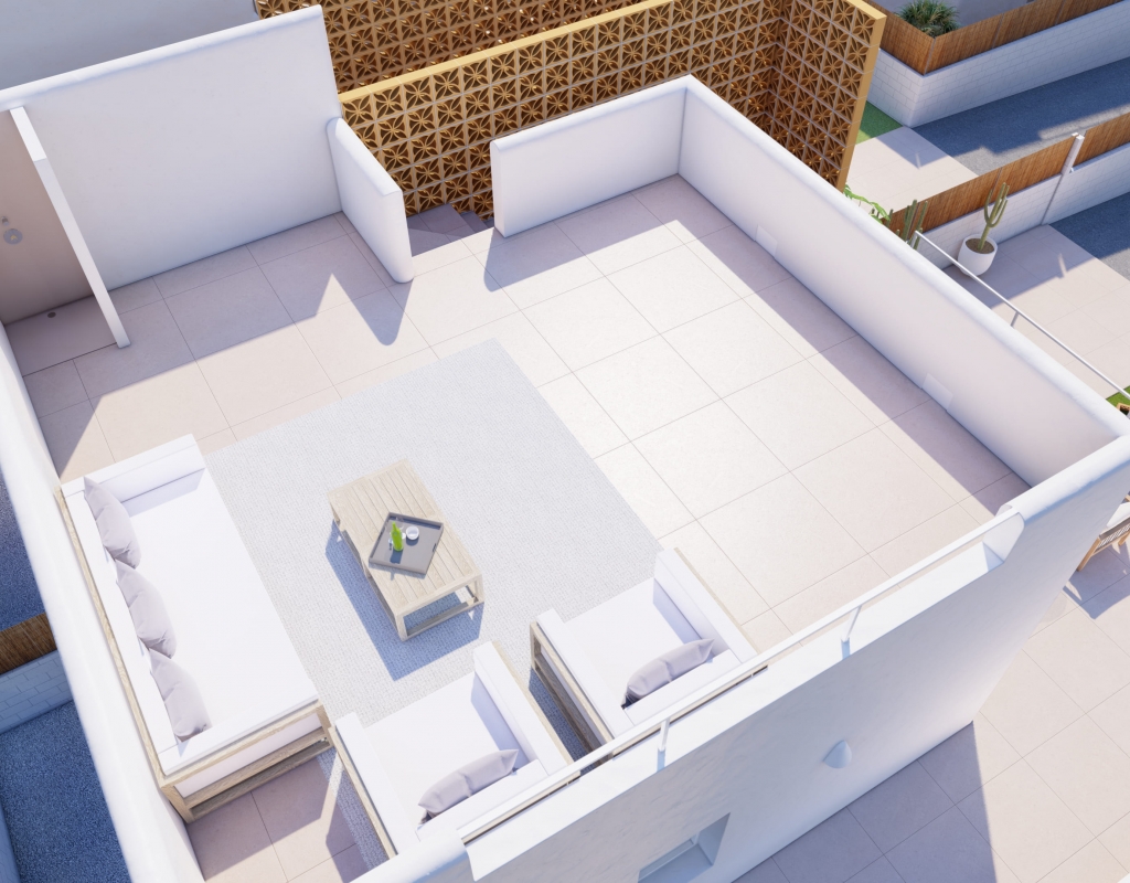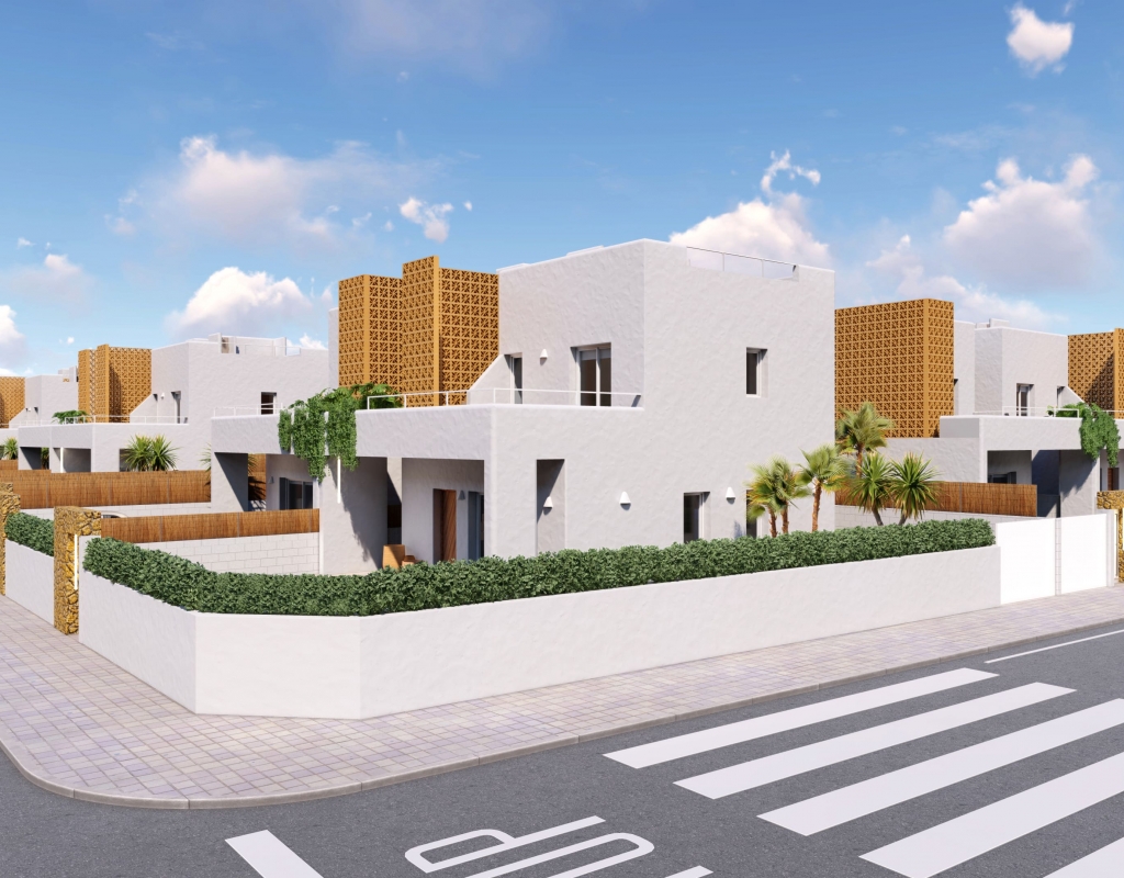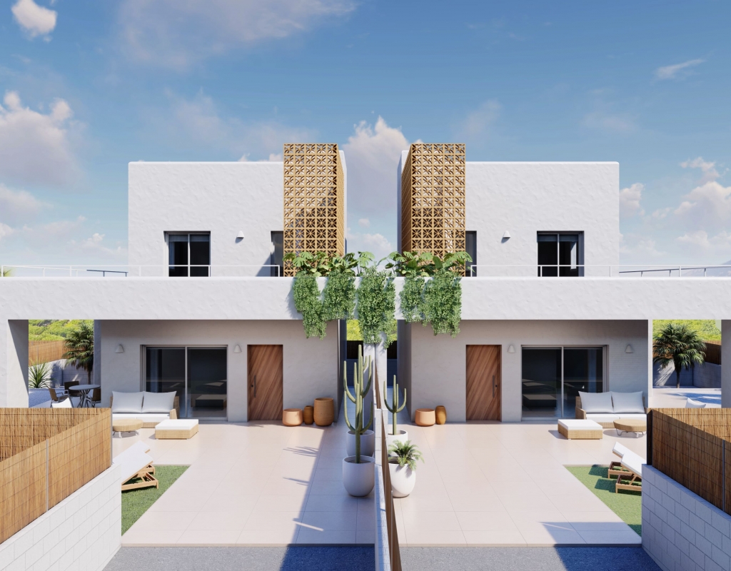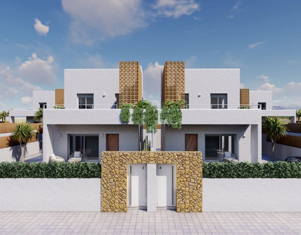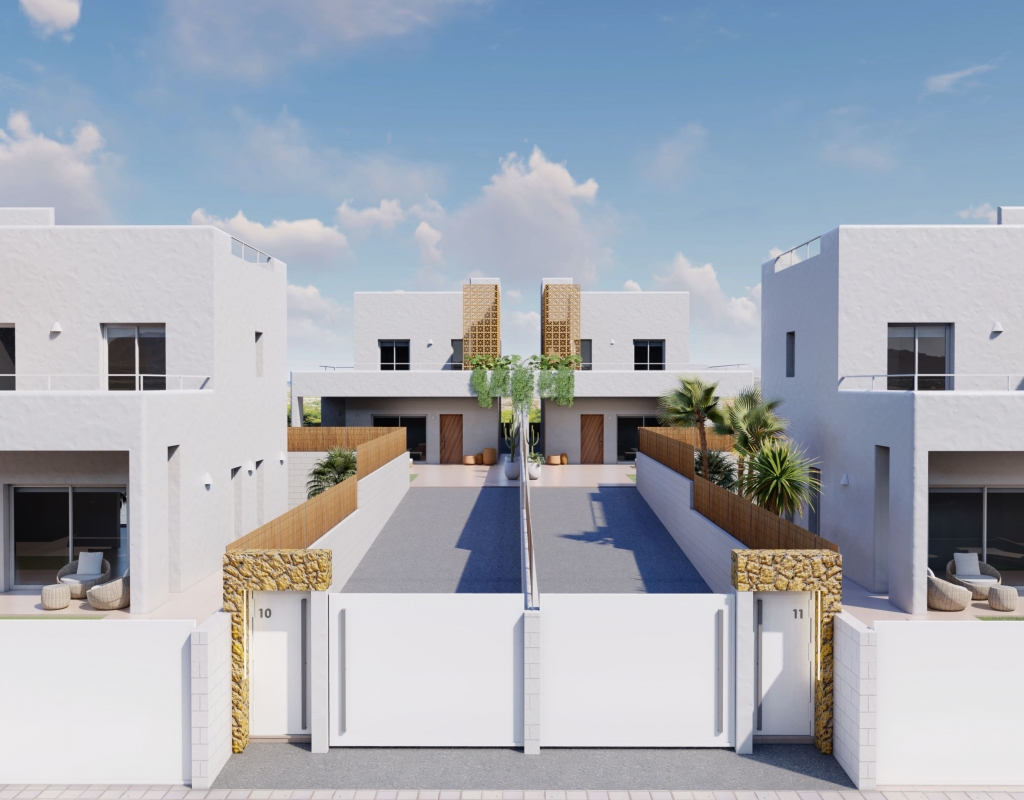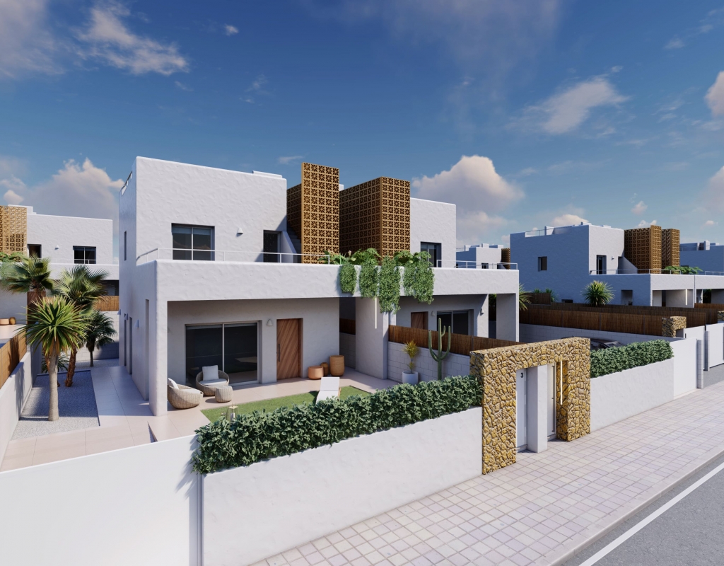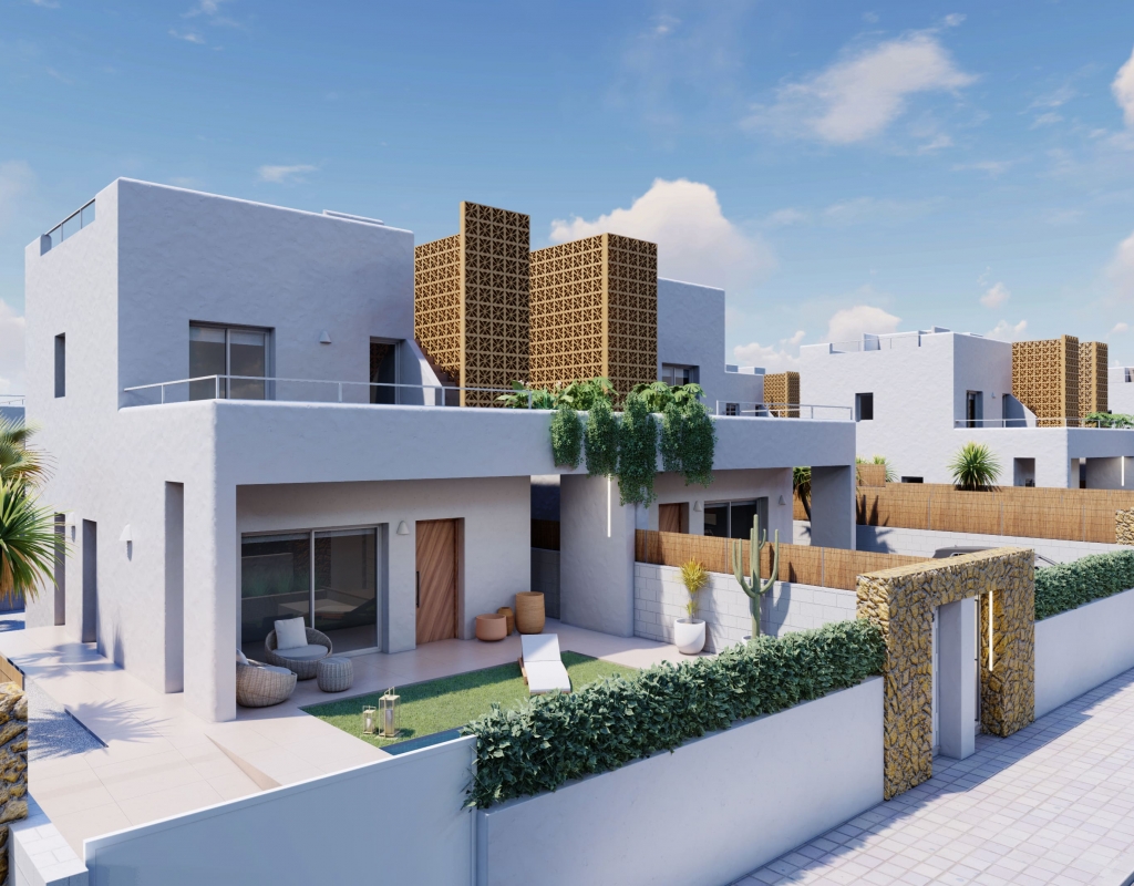 Los exteriores de estas viviendas han sido diseñados para maximizar el disfrute del clima mediterráneo. Cada chalet cuenta con un jardín privado, perfecto para crear un espacio verde personal o para disfrutar de actividades al aire libre. La presencia de una piscina privada en cada propiedad añade un toque de lujo y exclusividad, permitiendo a los residentes refrescarse y relajarse en la comodidad de su hogar. Además, las terrazas ofrecen un espacio adicional para el ocio, ya sea para cenar al aire libre o simplemente para disfrutar del sol. El solárium es otro de los atractivos destacados, proporcionando un espacio elevado desde el cual se pueden apreciar las vistas del entorno y disfrutar de momentos de tranquilidad.