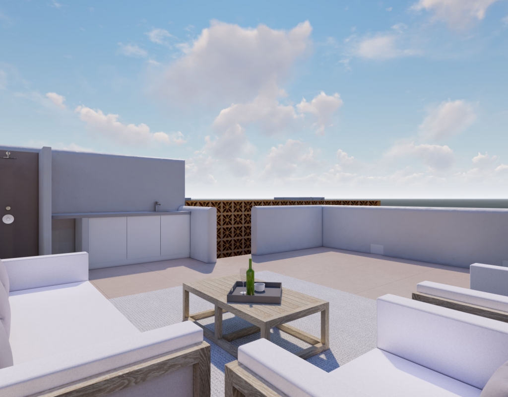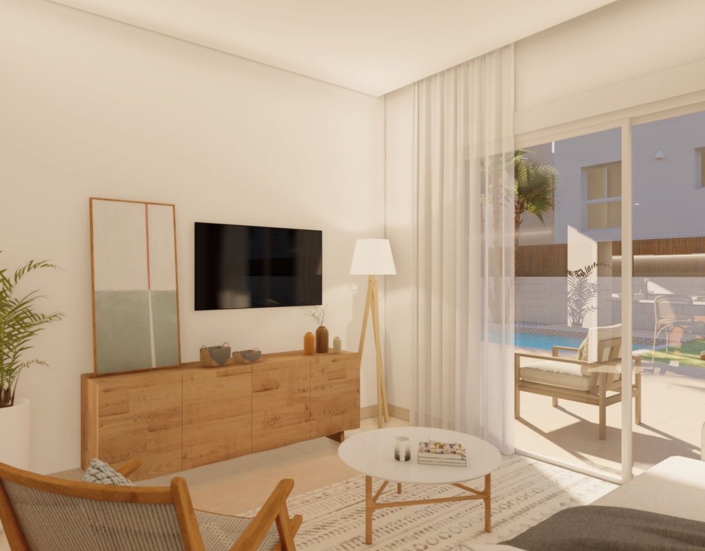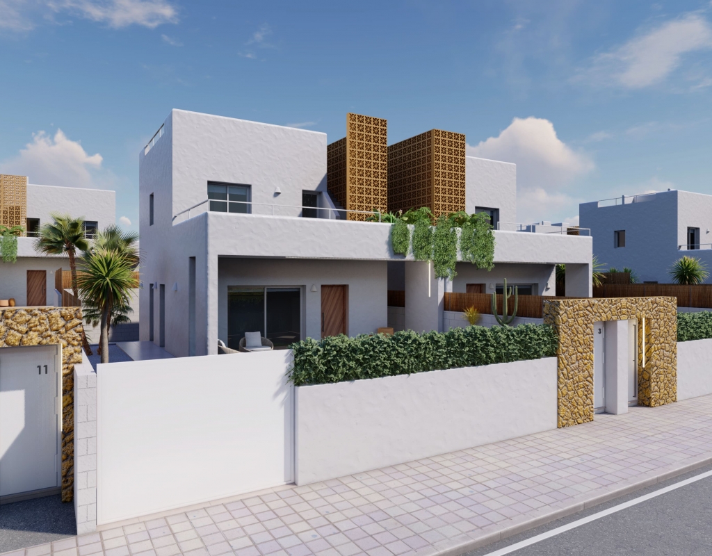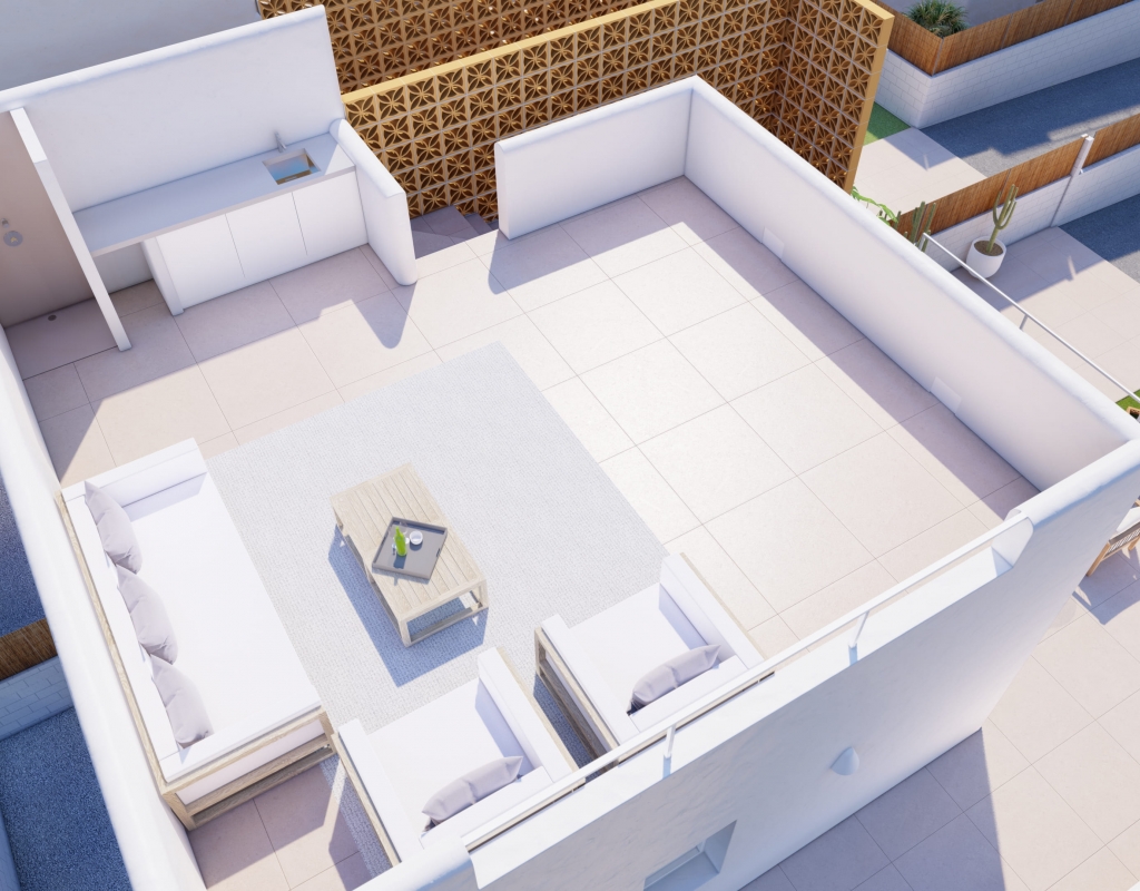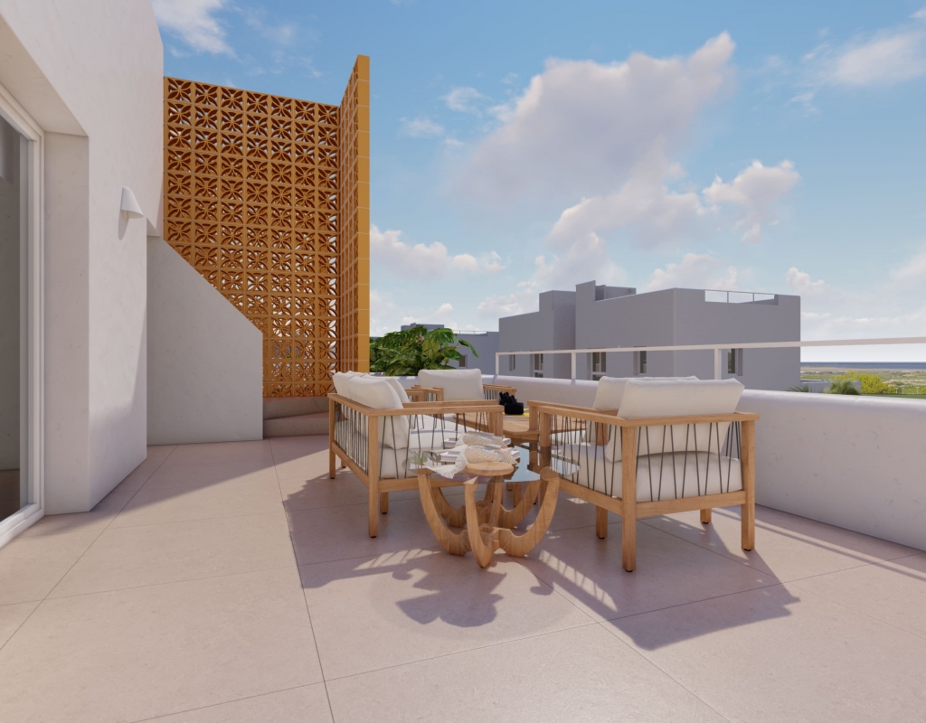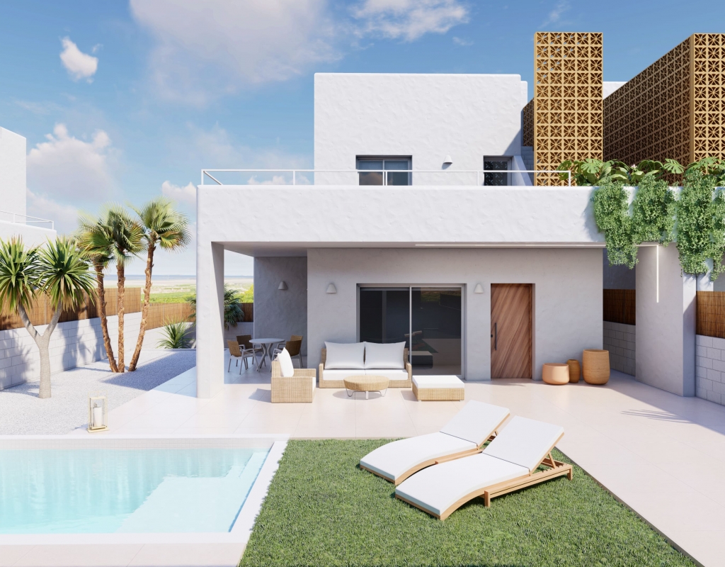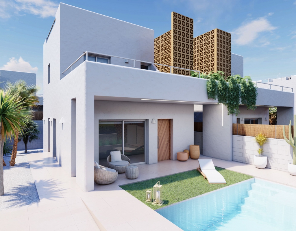 Los exteriores de estas viviendas han sido diseñados para maximizar el disfrute del clima mediterráneo. Cada chalet cuenta con un jardín privado, perfecto para crear un espacio verde personal o para disfrutar de actividades al aire libre. La presencia de una piscina privada en cada propiedad añade un toque de lujo y exclusividad, permitiendo a los residentes refrescarse y relajarse en la comodidad de su hogar. Además, las terrazas ofrecen un espacio adicional para el ocio, ya sea para cenar al aire libre o simplemente para disfrutar del sol. El solárium es otro de los atractivos destacados, proporcionando un espacio elevado desde el cual se pueden apreciar las vistas del entorno y disfrutar de momentos de tranquilidad.