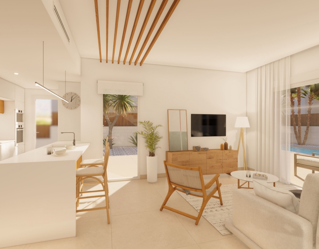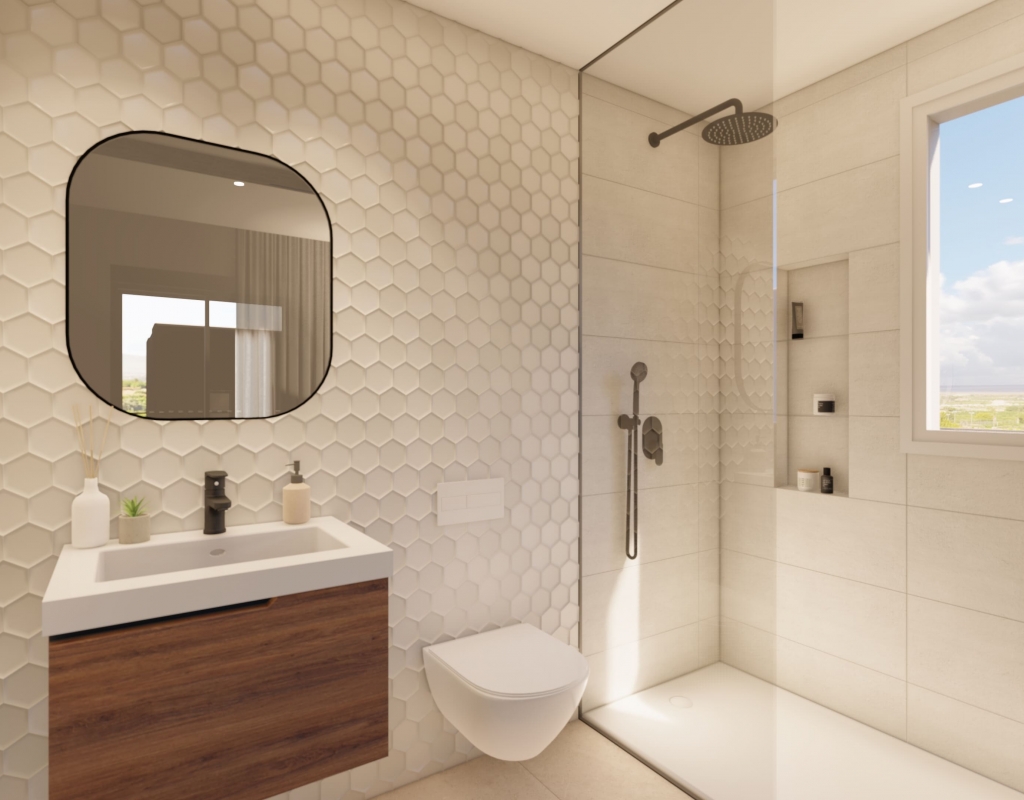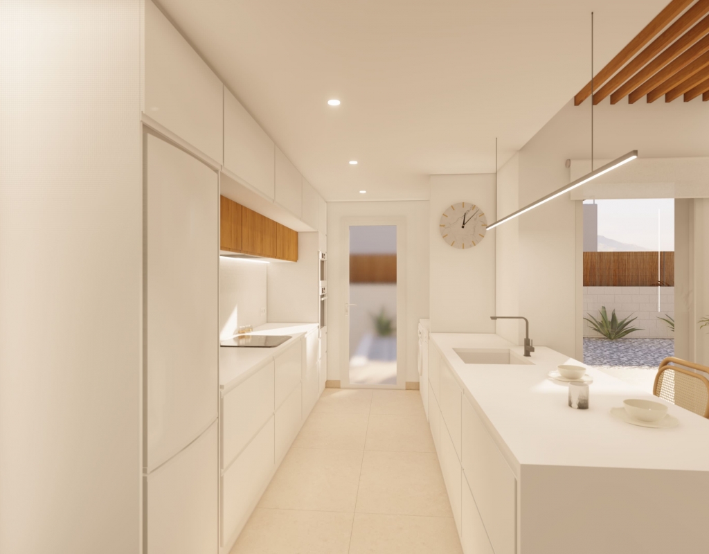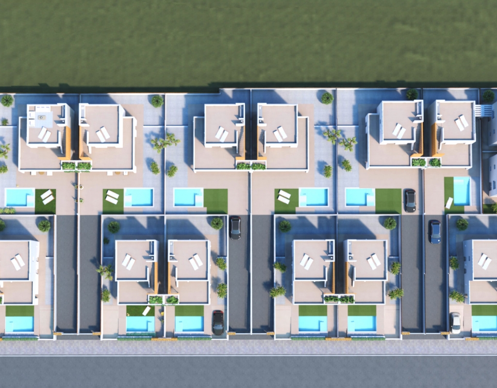El interior de estas viviendas ha sido diseñado pensando en la comodidad y funcionalidad. Con una distribución que incluye tres dormitorios y tres baños, cada chalet ofrece un espacio amplio y bien organizado. Los acabados de suelo cerámico aportan un toque moderno y son fáciles de mantener. Las viviendas están completamente amuebladas, lo que facilita la mudanza y permite disfrutar del espacio desde el primer día. La cocina está equipada con electrodomésticos, asegurando que los residentes tengan todo lo necesario para su día a día. Además, cuentan con aire acondicionado y persianas eléctricas, garantizando confort y eficiencia energética. Los armarios empotrados ofrecen soluciones de almacenamiento prácticas y elegantes, mientras que la preinstalación de aire acondicionado permite futuras mejoras según las necesidades de los residentes.