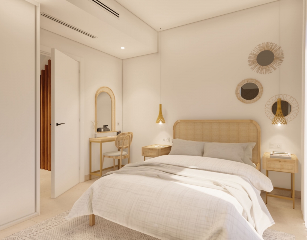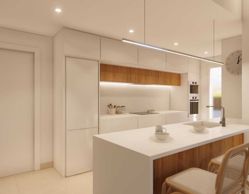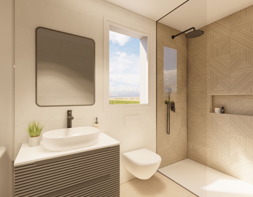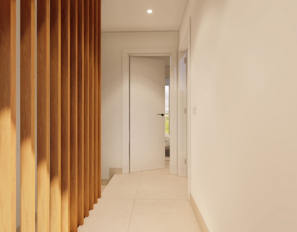 El interior de estas viviendas ha sido diseñado pensando en la comodidad y funcionalidad. Con una distribución que incluye tres dormitorios y tres baños, cada chalet ofrece un espacio amplio y bien organizado. Los acabados de suelo cerámico aportan un toque moderno y son fáciles de mantener. Las viviendas están completamente amuebladas, lo que facilita la mudanza y permite disfrutar del espacio desde el primer día. La cocina está equipada con electrodomésticos, asegurando que los residentes tengan todo lo necesario para su día a día. Además, cuentan con aire acondicionado y persianas eléctricas, garantizando confort y eficiencia energética. Los armarios empotrados ofrecen soluciones de almacenamiento prácticas y elegantes, mientras que la preinstalación de aire acondicionado permite futuras mejoras según las necesidades de los residentes.