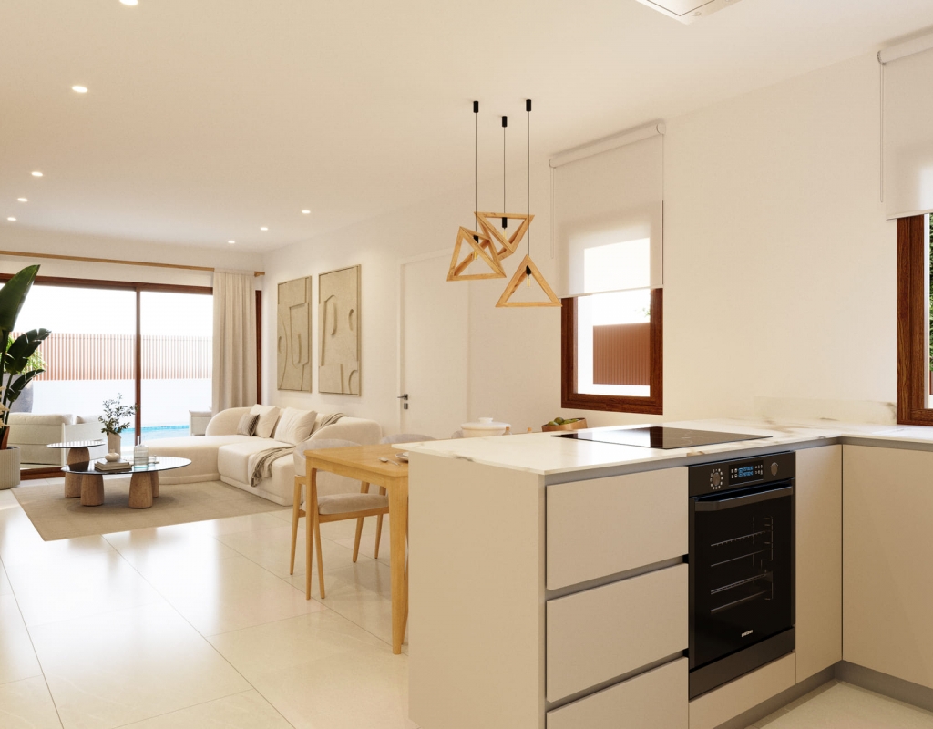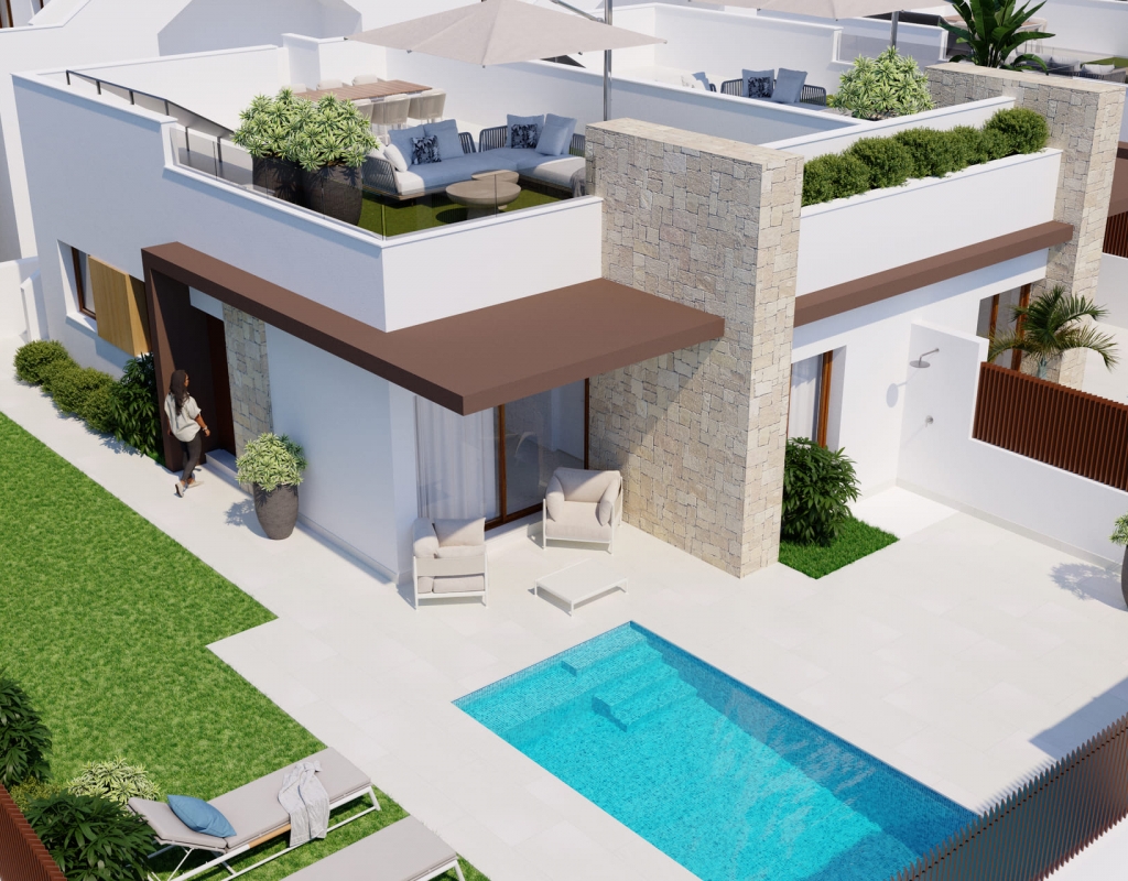 El diseño exterior de estas viviendas pareadas en Orihuela destaca por su elegancia y funcionalidad. Cada propiedad dispone de un jardín privado, perfecto para disfrutar del clima mediterráneo y organizar reuniones al aire libre. Además, cuentan con una terraza que ofrece un espacio adicional para el relax y el entretenimiento. La inclusión de una piscina privada en cada vivienda proporciona un toque de lujo y exclusividad, permitiendo a los residentes disfrutar de un refrescante chapuzón en la privacidad de su hogar. La opción de un solárium, disponible según la tipología, añade un espacio extra para tomar el sol y disfrutar de las vistas.