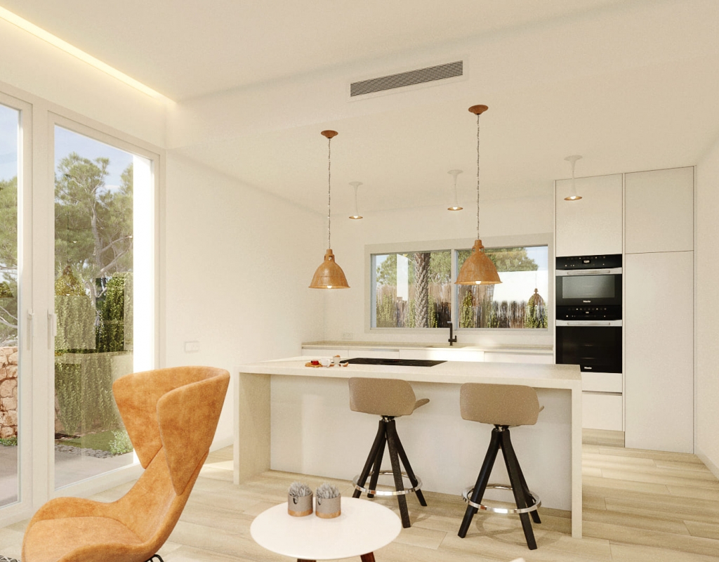 L'intérieur du chalet est conçu pour offrir un confort maximal. Il dispose de trois chambres, ce qui le rend parfait pour les familles ou pour recevoir des invités. Les deux salles de bains sont équipées de finitions modernes. La cuisine est équipée d'appareils électroménagers de haute qualité, facilitant les tâches quotidiennes. Le système de climatisation garantit une température agréable tout au long de l'année. Les sols en grès cérame apportent une touche élégante et sont faciles à entretenir. De plus, il dispose de placards intégrés qui optimisent l'espace de rangement. La sécurité est renforcée par un interphone vidéo, offrant tranquillité d'esprit à ses résidents.