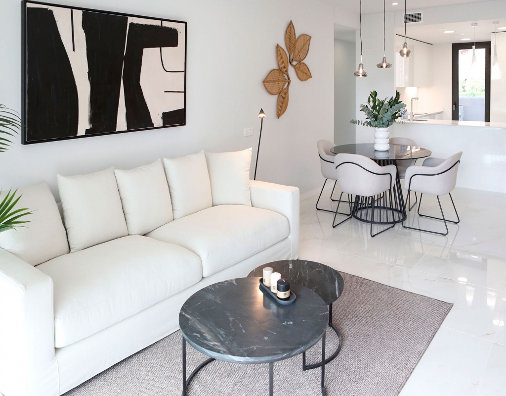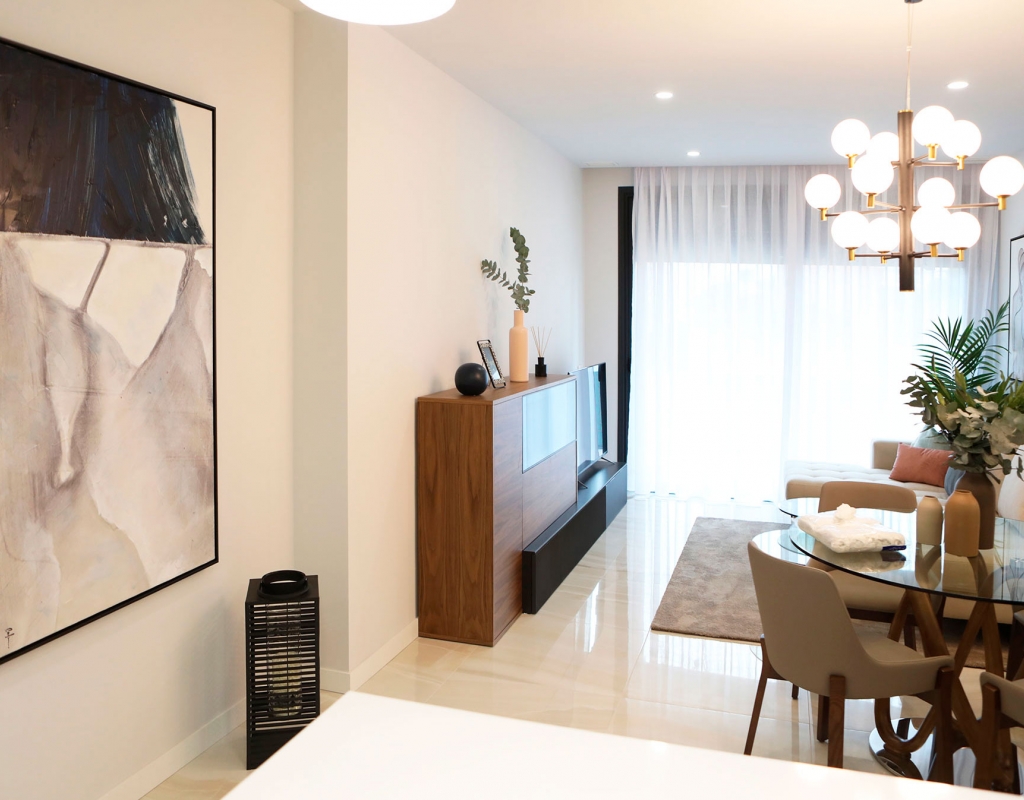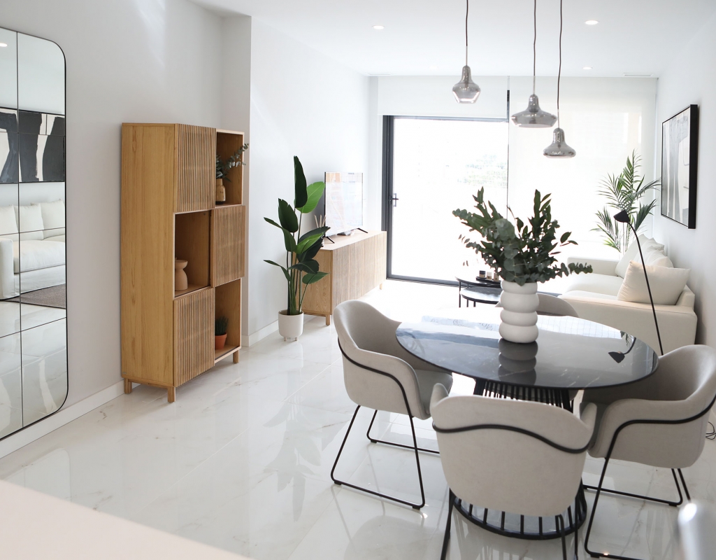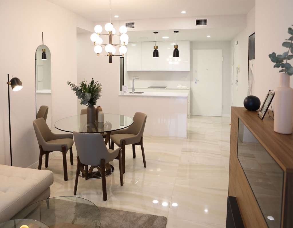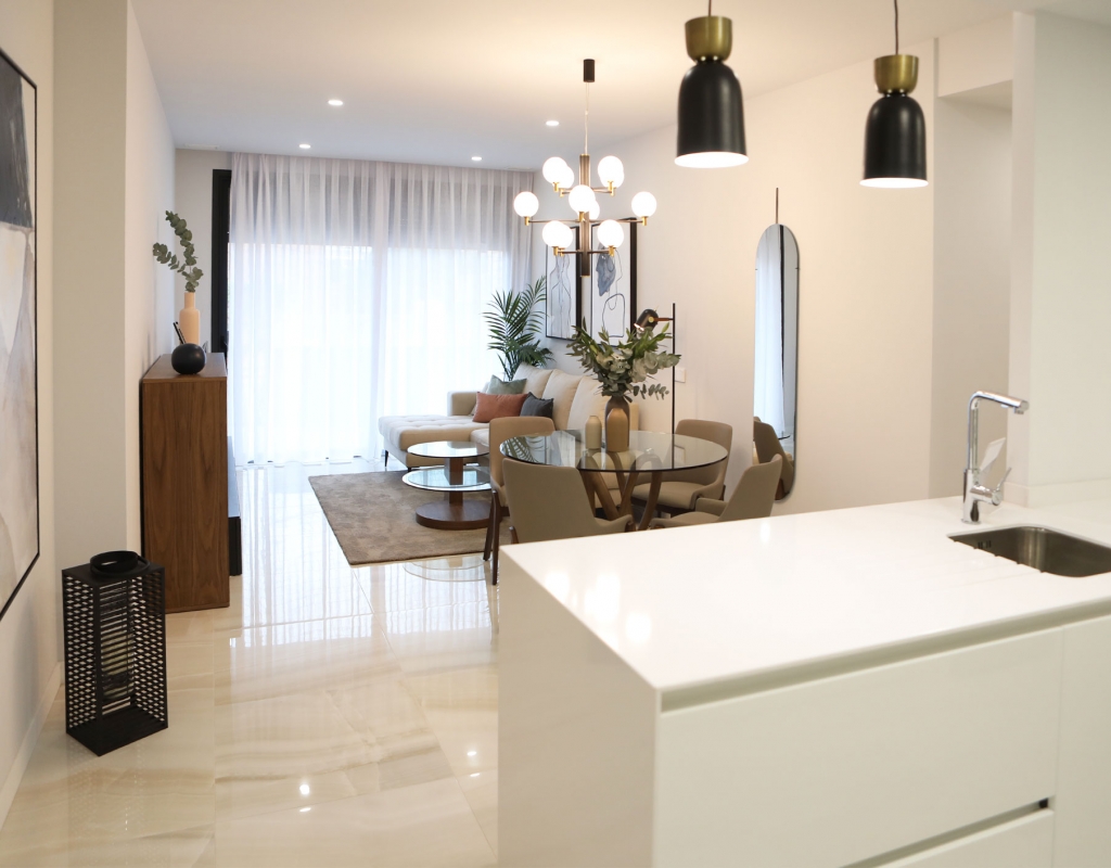 Les intérieurs de ces appartements sont conçus pour offrir un maximum de confort et de fonctionnalité. Avec des options de deux et trois chambres, chaque appartement est équipé de deux salles de bains modernes. Les sols en grès cérame apportent une touche d'élégance et sont faciles à entretenir. Les volets électriques et la climatisation assurent une atmosphère confortable tout au long de l'année. De plus, les appareils électroménagers inclus et les placards intégrés ajoutent un niveau supplémentaire de commodité et de style, faisant de ces appartements un lieu idéal pour s'installer.