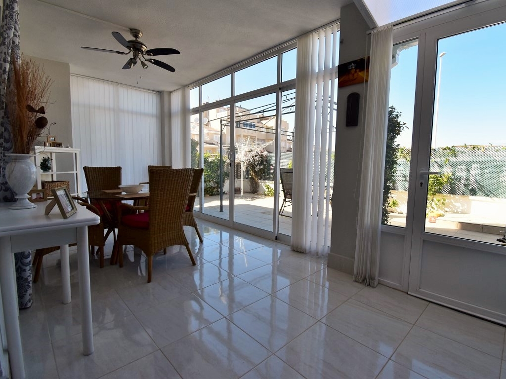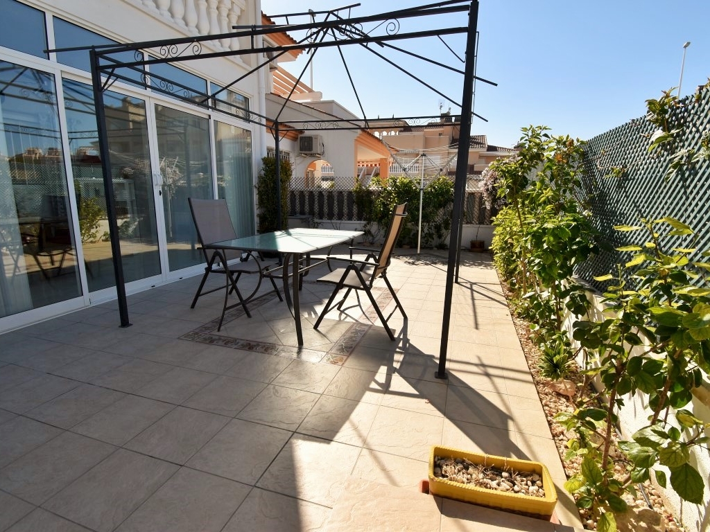 Dit op het zuidwesten gelegen, drie slaapkamer, herenhuis in Punta Prima is op een ideale locatie op 5 minuten met de auto naar Torrevieja, een verscheidenheid aan stranden, ziekenhuis, La Zenia, samen met het winkelcentrum La Zenia Boulevard en alle faciliteiten die u nodig zou kunnen hebben direct voor de deur, inclusief een goede variëteit aan topklasse golfbanen binnen 10 minuten rijden. Dit fantastisch onderhouden pand op drie verdiepingen is voorzien van airconditioning en bestaat uit: open woonkamer met grote dubbele schuifdeuren vanuit de woonkamer die uitkomt op een ruim terras, ideale eetruimte of om gewoon te ontspannen; ingerichte keuken afgewerkt met een super kwaliteit rood en wit design met deur naar het entree terras; 2 dubbele slaapkamers op de eerste verdieping, master met ingebouwde kasten en toegang tot een groot terras, plus er is een doucheruimte; de derde slaapkamer bevindt zich op de tweede verdieping, samen met een familie moderne badkamer met douche. De eigenschap profiteert ook van een solarium, dus er is veel buitenruimte aangeboden plus het gebruik van een mooi onderhouden gemeenschappelijk zwembad.
