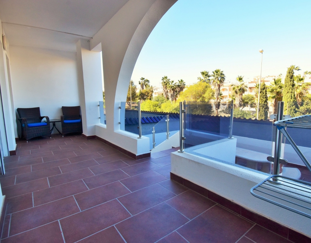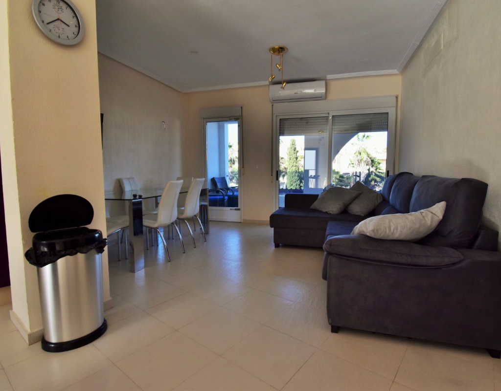 Een op het westen gelegen appartement met twee slaapkamers op de begane grond in Las Filipinas, een woonwijk van Villamartin, op vijf minuten lopen van bars en restaurants, tien minuten van een grote supermarktketen en het commerciële centrum van La Fuente. Er is keuze uit drie golfbanen van topkwaliteit direct voor de deur, waaronder het winkelcentrum La Zenia Boulevard; stranden langs de kust zijn in 10-15 minuten rijden te bereiken. Het gebouw heeft toegang via een poort en dit ruime appartement van 84 m² bestaat uit: woon-/eetkamer met airco en dubbele schuifdeuren die uitkomen op een ruim overdekt terras; prachtig ingerichte open keuken met eiland, veel opberg- en werkruimte; twee tweepersoonsslaapkamers met ingebouwde kasten, master met airco, slaapkamer 2 heeft een plafondventilator; modern ingerichte badkamer met hoekbad. De woning wordt geleverd met een ruime betegelde tuin aan de voorzijde, het gebruik van een gemeenschappelijk zwembad en beschikt over een toeristenvergunning.