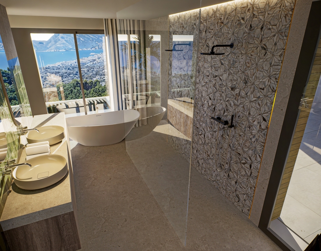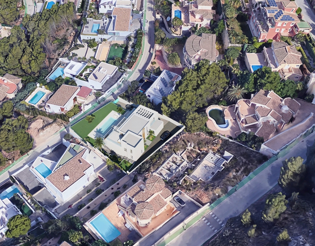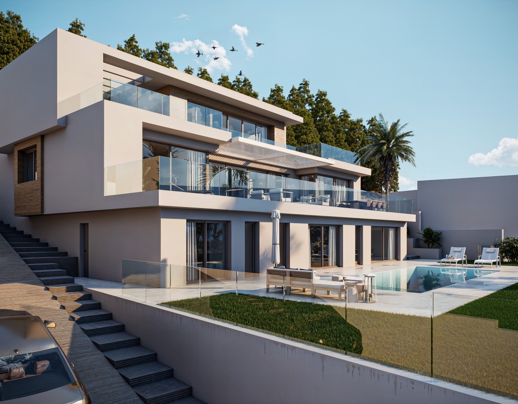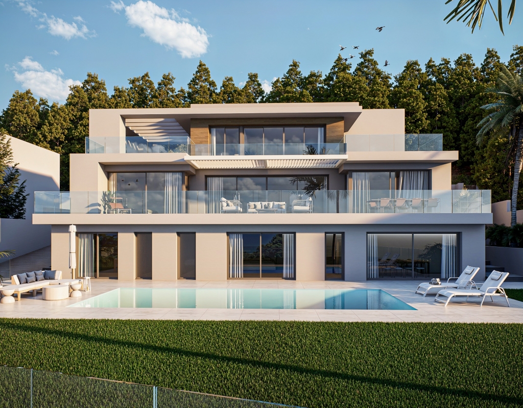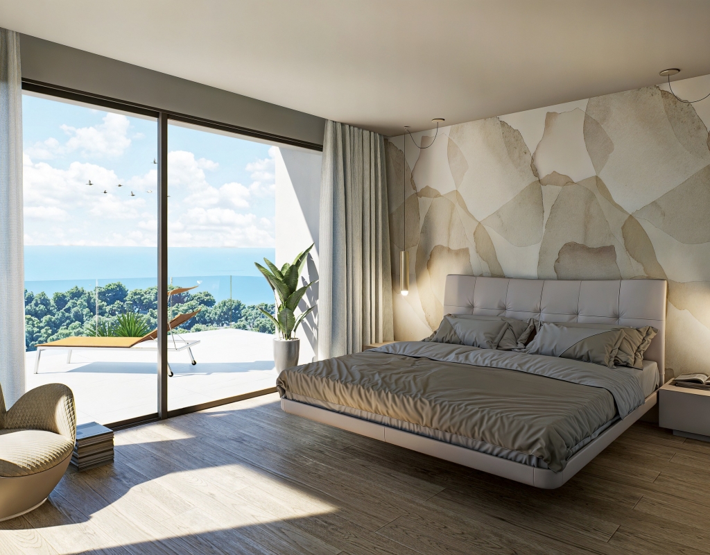 Het exterieur van de villa is ontworpen om optimaal te genieten van het mediterrane klimaat. Het beschikt over een privétuin die een perfecte groene ruimte biedt voor ontspanning of buitenactiviteiten. Het terras is een ideale plek om te genieten van het uitzicht op zee en de zonsondergangen. Bovendien beschikt de villa over een zonneterras, perfect om in volledige privacy van de zon te genieten. Het privézwembad is een andere attractie van deze woning, die een verfrissende ruimte biedt voor de warmste dagen.