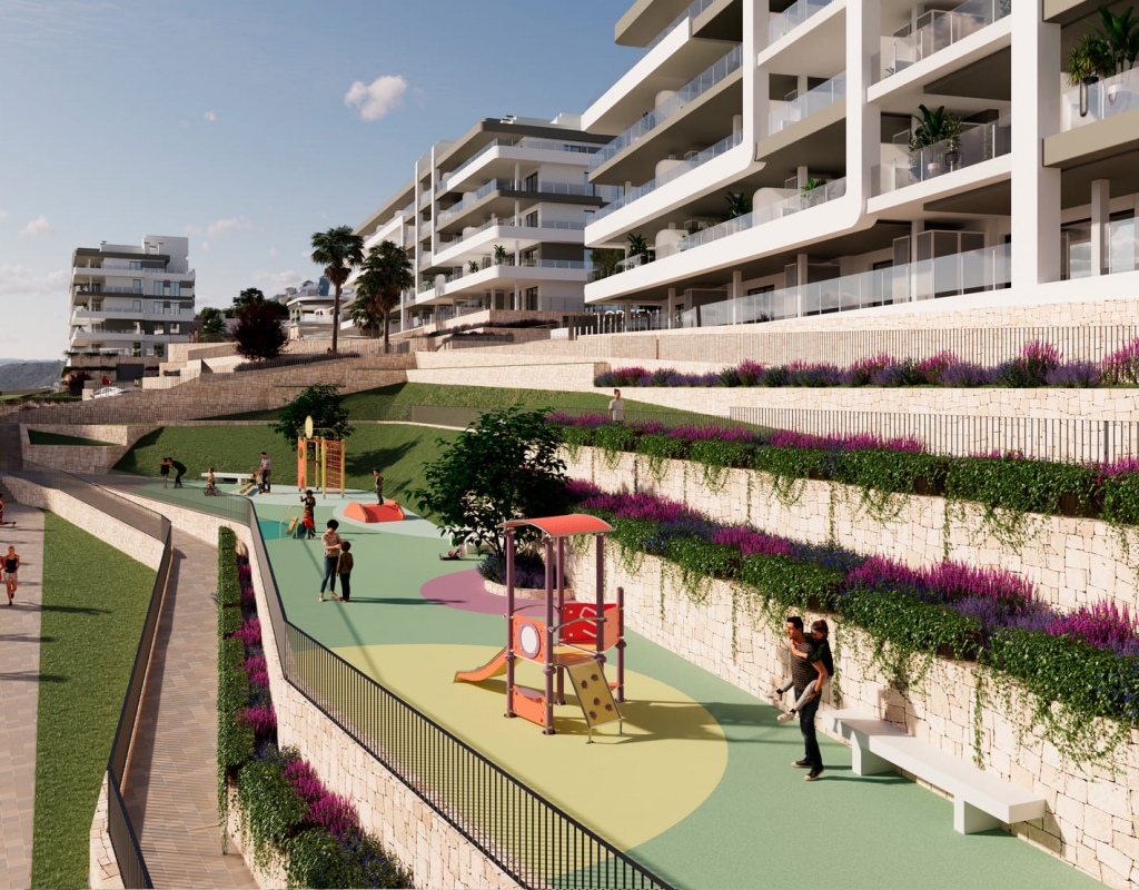 De buitenruimtes van deze residentie zijn ontworpen om een comfortabele en ontspannen levensstijl te bieden. Elke woning beschikt over een privéterras, ideaal om te genieten van het mediterrane klimaat en het uitzicht op zee. Bovendien omvatten sommige typen een privétuin, wat extra ruimte biedt voor buitenrecreatie. Toegang tot een privégarage zorgt voor het gemak en de veiligheid van voertuigen, terwijl de mogelijkheid om elektrische auto's op te laden een toewijding aan duurzaamheid en moderne mobiliteitsbehoeften weerspiegelt.