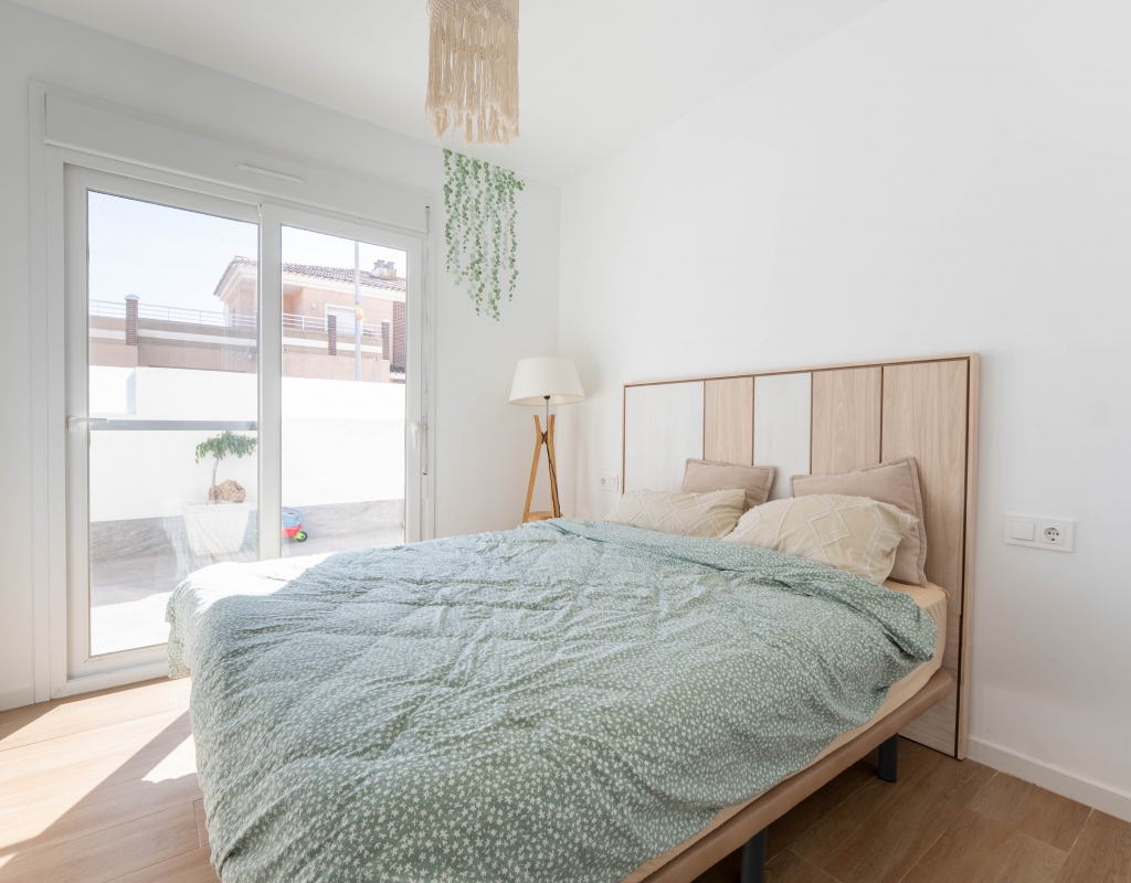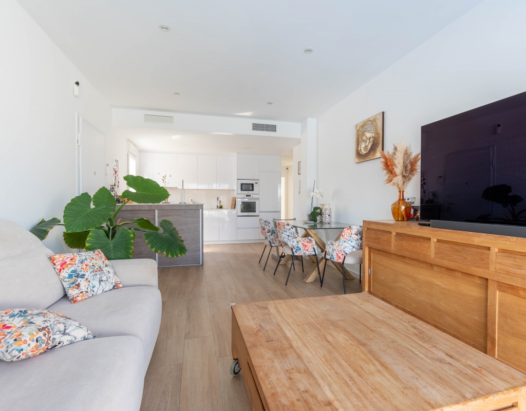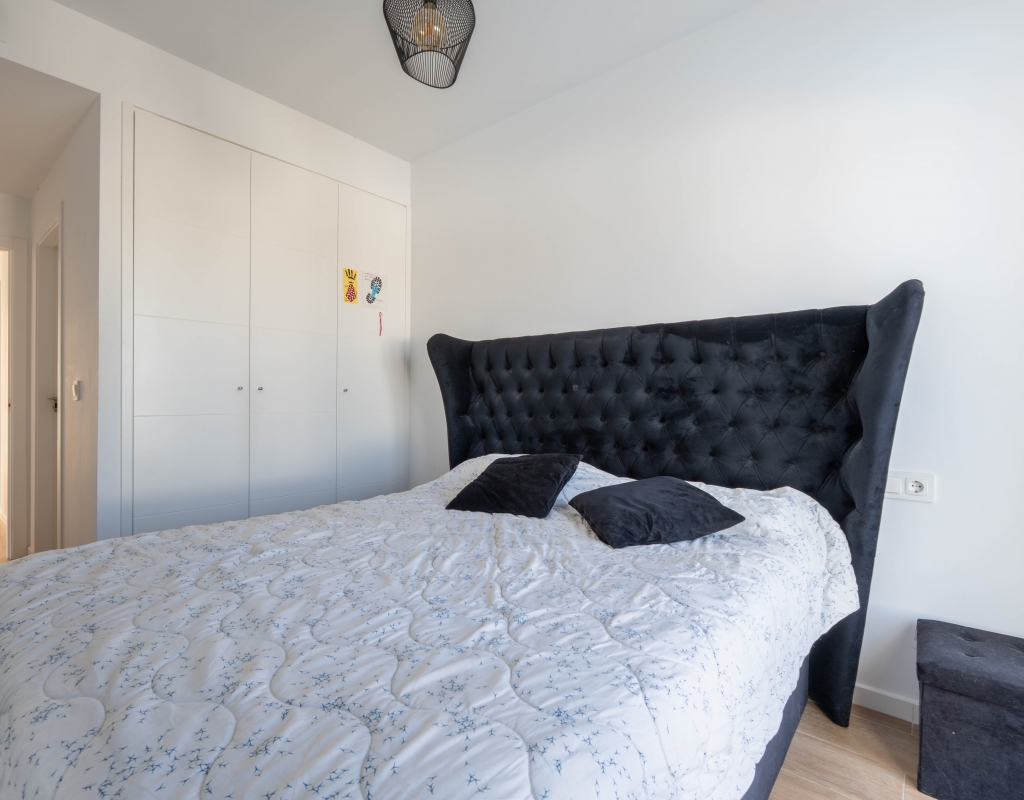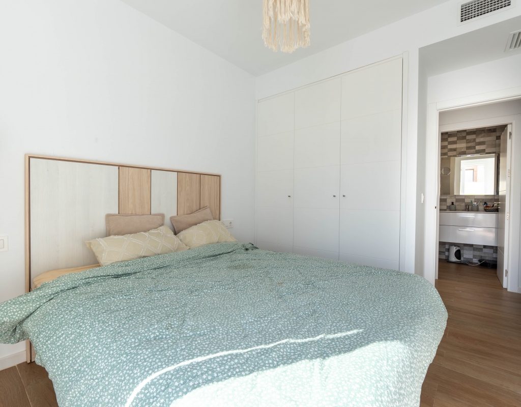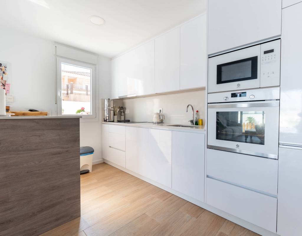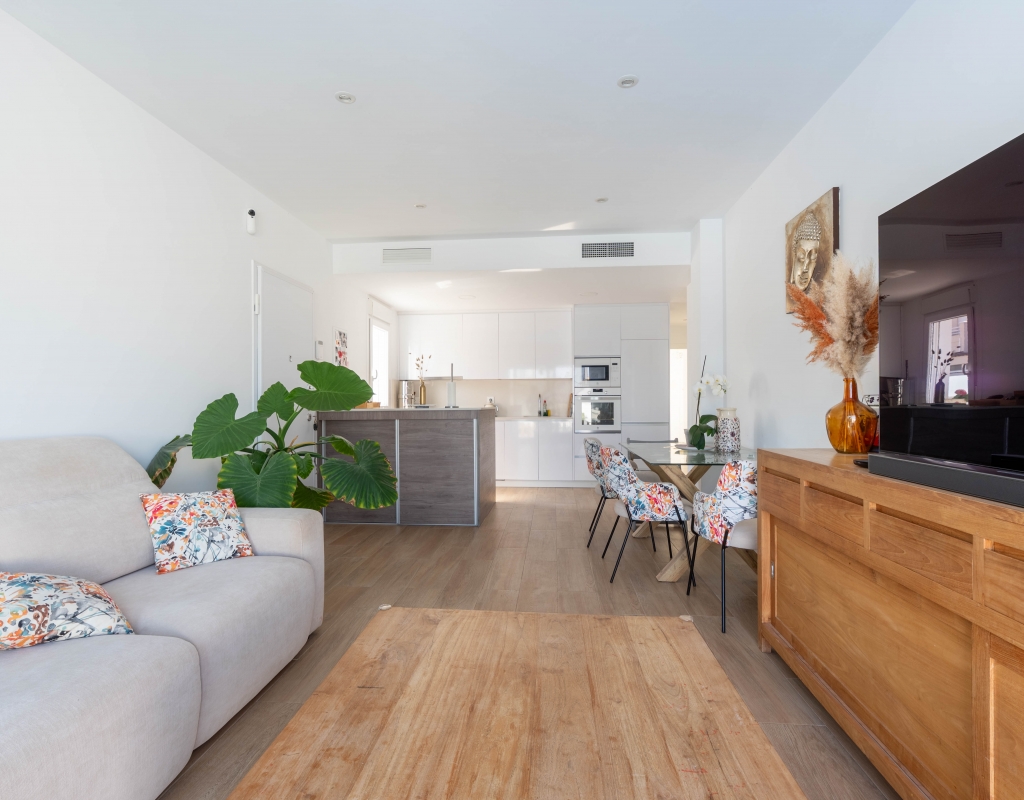 Het interieur van de woning is ontworpen om maximaal comfort en functionaliteit te bieden. Het beschikt over drie slaapkamers, wat het geschikt maakt voor gezinnen of voor degenen die extra ruimte nodig hebben voor gasten. De twee badkamers zijn uitgerust om aan de dagelijkse behoeften te voldoen met comfort. De woning heeft porseleinen tegelvloeren, die een moderne en elegante uitstraling geven. De elektrische rolluiken en de inbegrepen apparaten voegen een extra niveau van comfort toe. Bovendien bieden de ingebouwde kasten een efficiënte opslagruimte. De pre-installatie van airconditioning zorgt ervoor dat de woning klaar is om het hele jaar door een aangename temperatuur te behouden.