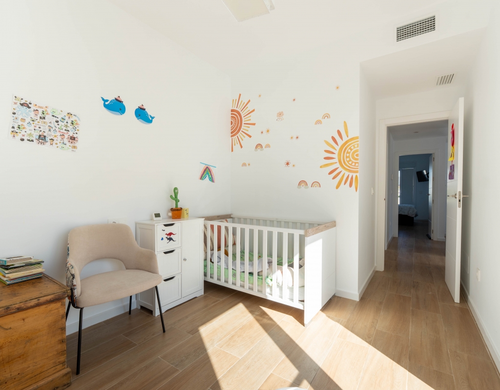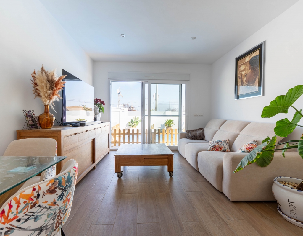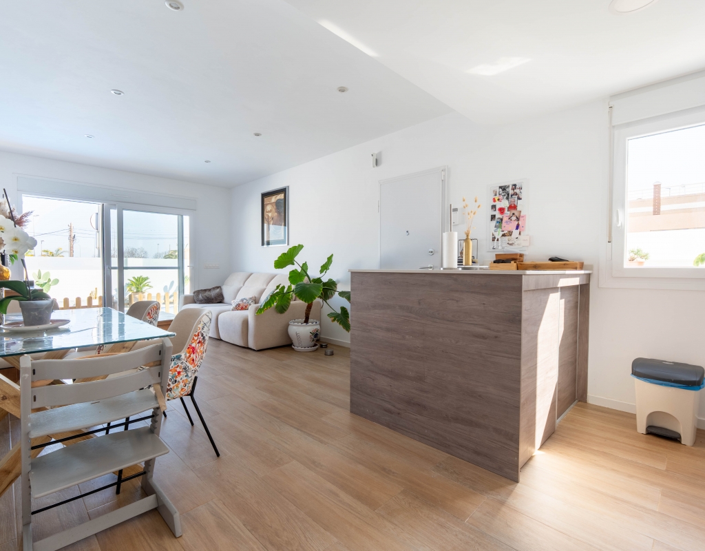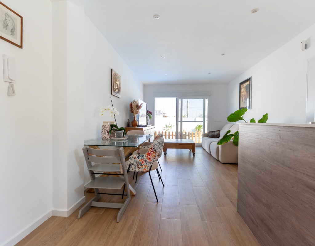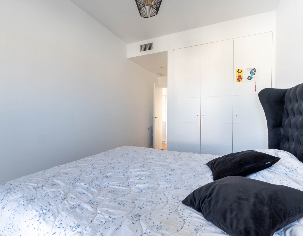Het interieur van de woning is ontworpen om maximaal comfort en functionaliteit te bieden. Het beschikt over drie slaapkamers, wat het geschikt maakt voor gezinnen of voor degenen die extra ruimte nodig hebben voor gasten. De twee badkamers zijn uitgerust om aan de dagelijkse behoeften te voldoen met comfort. De woning heeft porseleinen tegelvloeren, die een moderne en elegante uitstraling geven. De elektrische rolluiken en de inbegrepen apparaten voegen een extra niveau van comfort toe. Bovendien bieden de ingebouwde kasten een efficiënte opslagruimte. De pre-installatie van airconditioning zorgt ervoor dat de woning klaar is om het hele jaar door een aangename temperatuur te behouden.