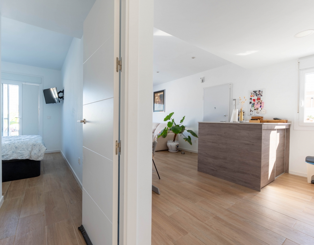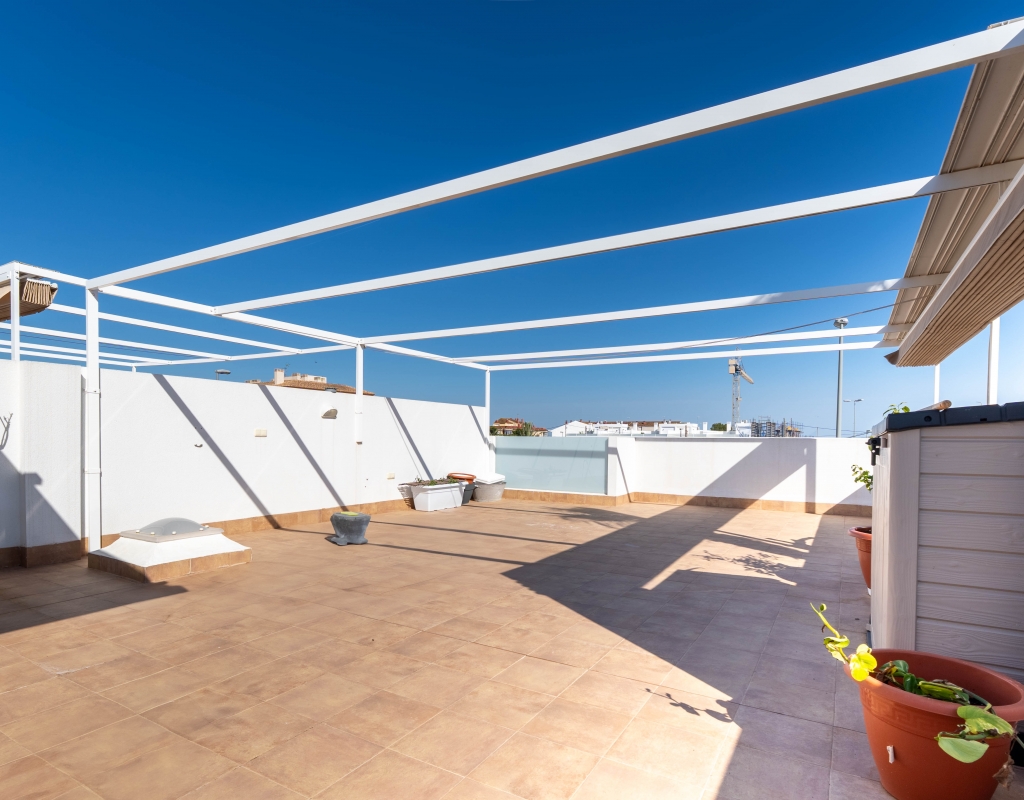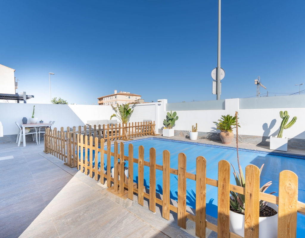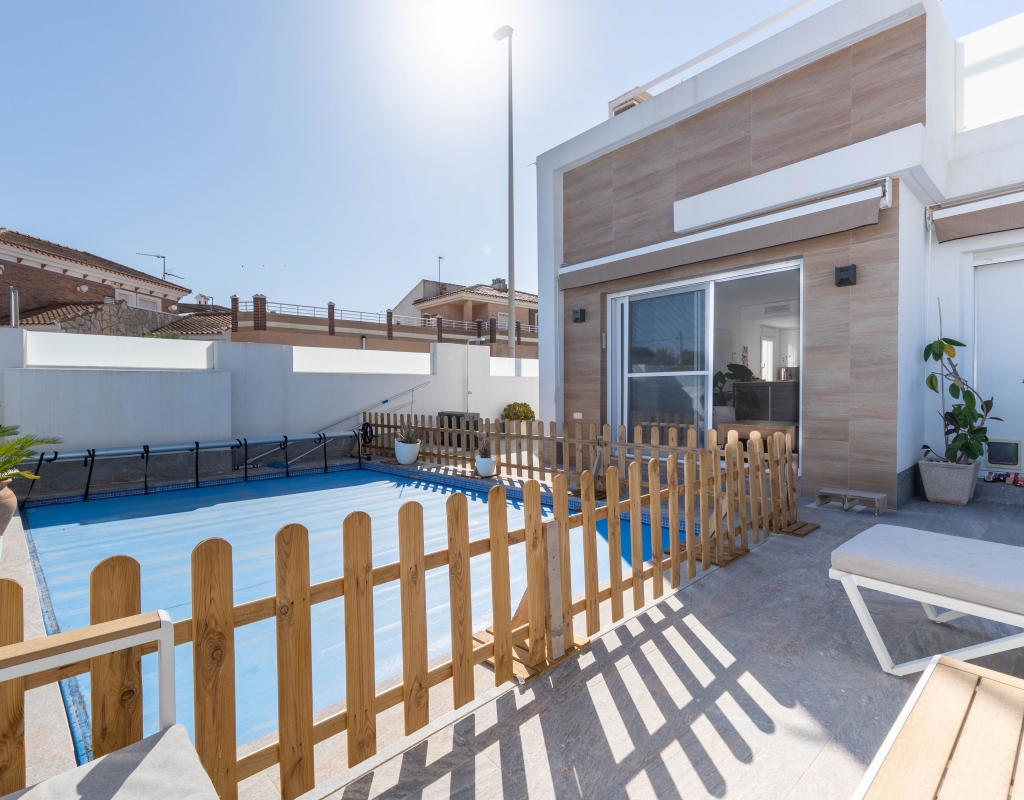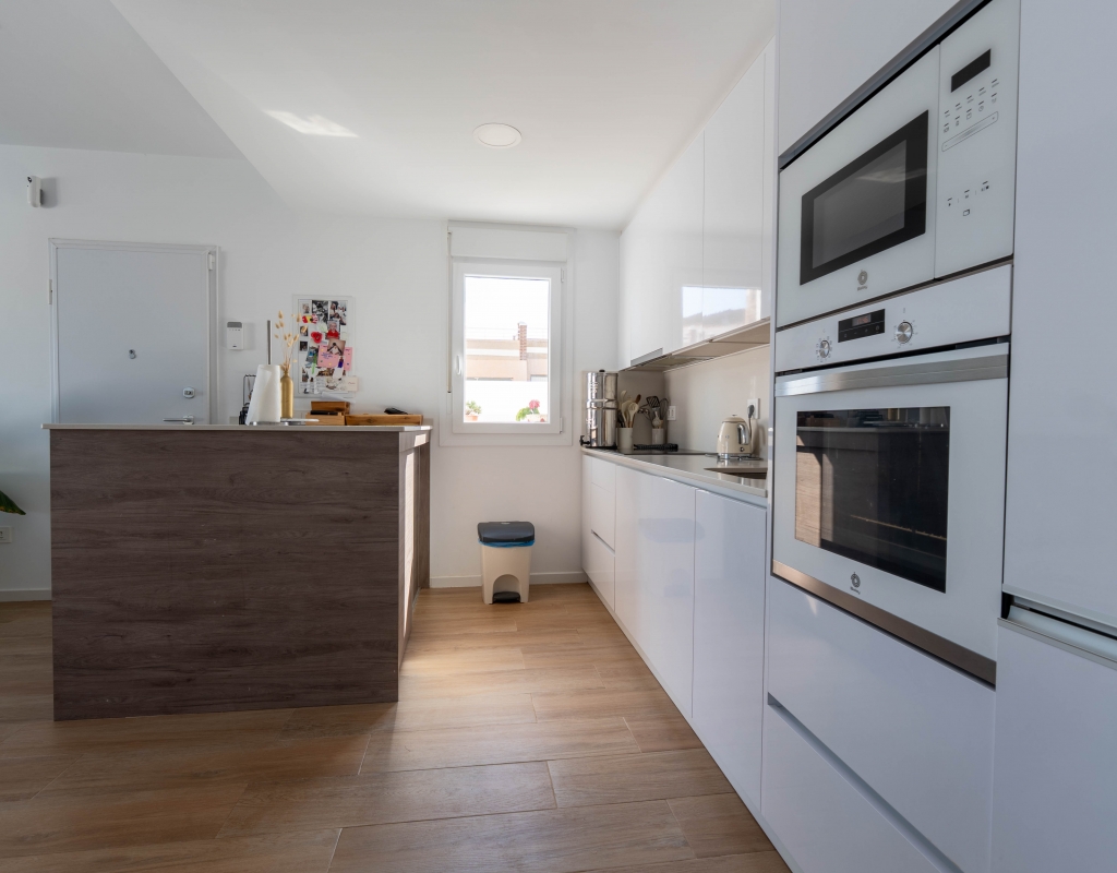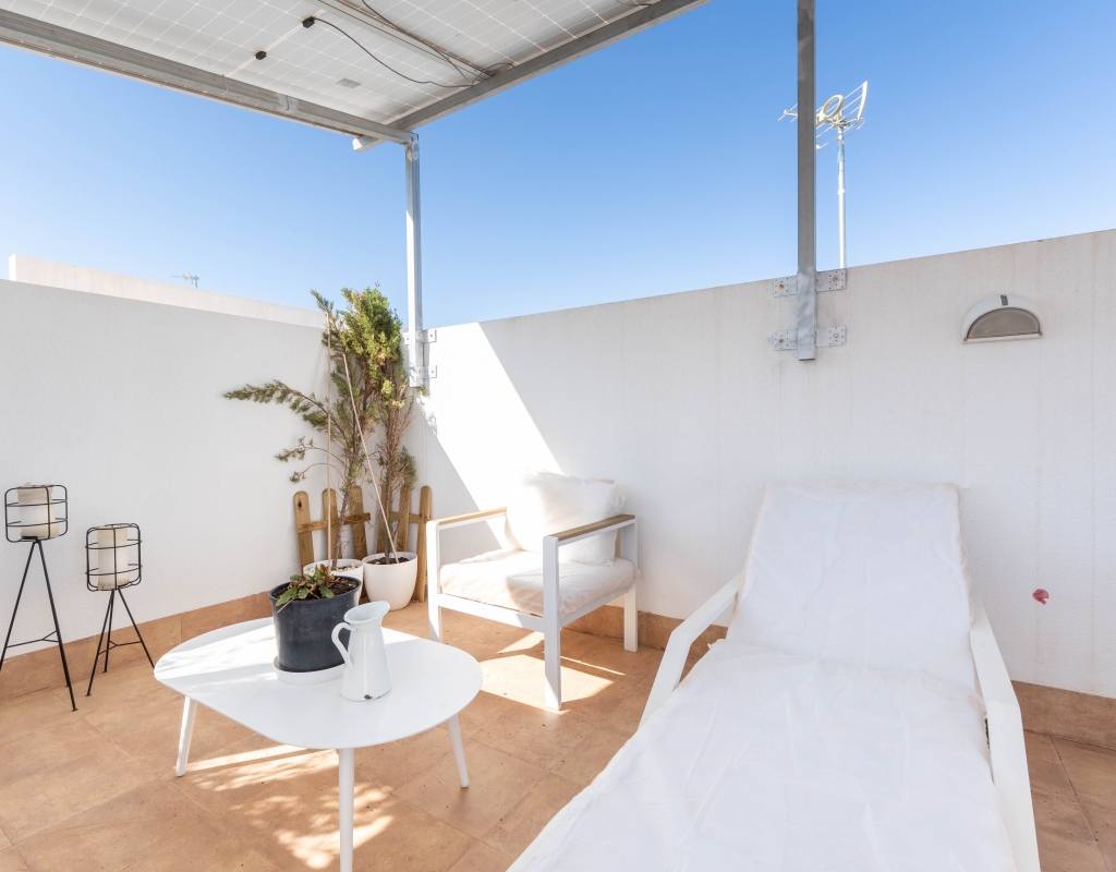 Het interieur van de woning is ontworpen om maximaal comfort en functionaliteit te bieden. Het beschikt over drie slaapkamers, wat het geschikt maakt voor gezinnen of voor degenen die extra ruimte nodig hebben voor gasten. De twee badkamers zijn uitgerust om aan de dagelijkse behoeften te voldoen met comfort. De woning heeft porseleinen tegelvloeren, die een moderne en elegante uitstraling geven. De elektrische rolluiken en de inbegrepen apparaten voegen een extra niveau van comfort toe. Bovendien bieden de ingebouwde kasten een efficiënte opslagruimte. De pre-installatie van airconditioning zorgt ervoor dat de woning klaar is om het hele jaar door een aangename temperatuur te behouden.