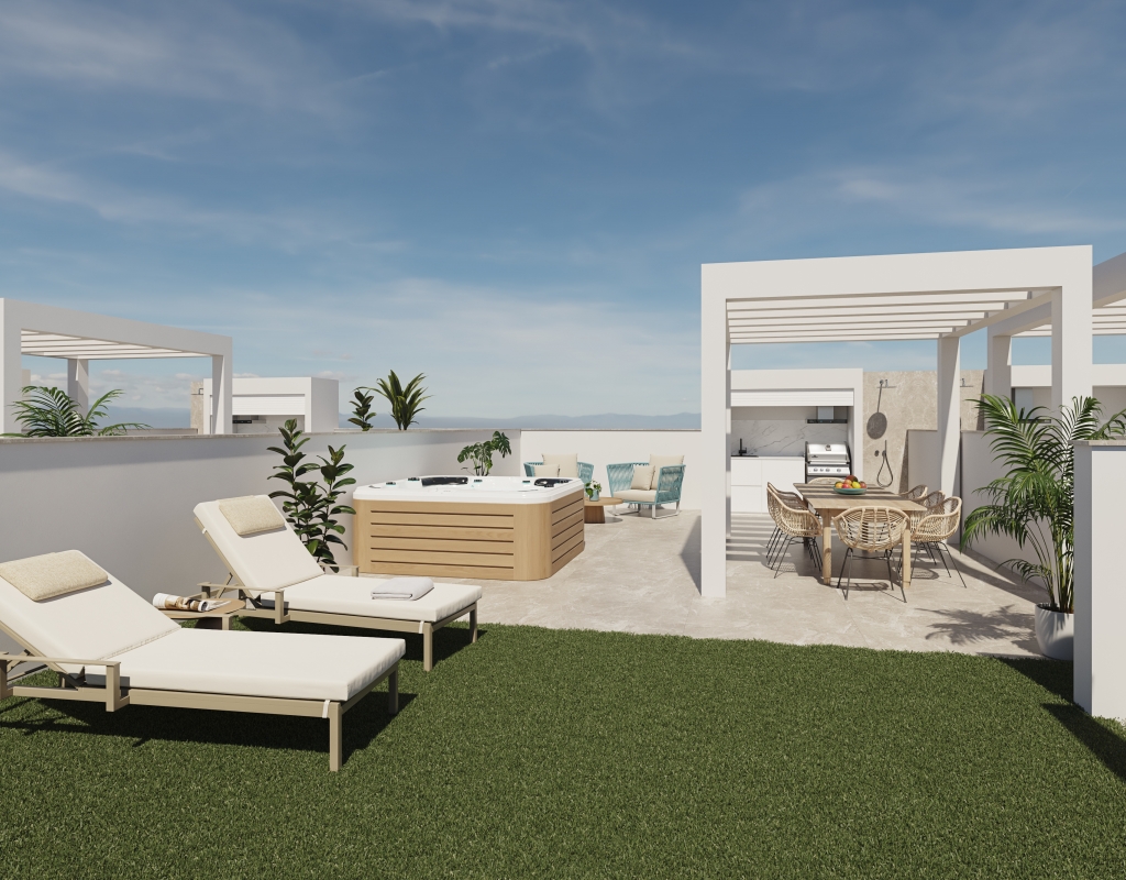 De buitenruimtes van dit wooncomplex in Pilar de la Horadada zijn ontworpen om een aangename en functionele omgeving te bieden. Elke woning heeft een privétuin, ideaal om te genieten van het mediterrane klimaat. De ruime terrassen bieden extra ruimte voor buitenplezier, terwijl de solariums een vrij uitzicht en een perfecte plek om te ontspannen bieden. De integratie van pergola's voegt een vleugje elegantie en schaduw toe, waardoor gezellige ruimtes ontstaan om op elk moment van de dag van te genieten. De nabijheid van de zee, op slechts 3,9 kilometer, maakt het mogelijk om te genieten van de zeebries en kustwandelingen wanneer gewenst.