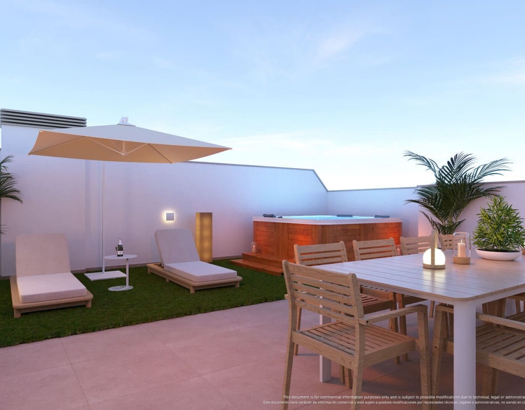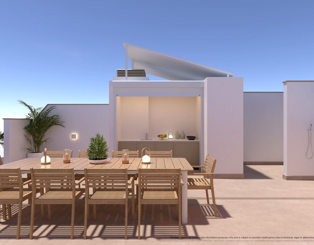 De buitenruimtes van deze woningen zijn ontworpen om optimaal te genieten van het mediterrane klimaat. Elke woning beschikt over een privéterras, ideaal om buiten te ontspannen of te genieten van maaltijden in de open lucht. Sommige typen hebben een solarium, wat extra ruimte biedt om te zonnebaden of van het uitzicht te genieten. Bovendien voegt de optie van een privétuin een vleugje natuur en privacy toe. Voor degenen die op zoek zijn naar een vleugje luxe, bieden sommige woningen een privézwembad, perfect om af te koelen op warme dagen. De aanwezigheid van een garage zorgt voor comfort en veiligheid voor het parkeren van voertuigen.