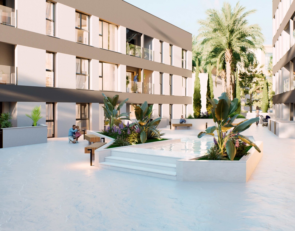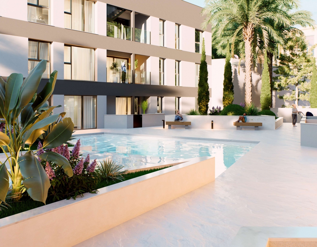 Het interieur van deze woningen valt op door zijn moderne en functionele ontwerp. De appartementen, begane grond en penthouses bieden opties met 1, 2 of 3 slaapkamers, aangepast aan verschillende gezinsbehoeften. De badkamers, beschikbaar in configuraties van 1 of 2, zijn uitgerust met hoogwaardige afwerkingen. De keuken bevat moderne apparaten die het dagelijks leven vergemakkelijken. De vloer van porseleinen tegels voegt een vleugje elegantie en duurzaamheid toe, terwijl de airconditioning het hele jaar door thermisch comfort garandeert. Ingebouwde kasten bieden efficiënte opbergoplossingen en de video-intercom voegt extra veiligheid en gemak toe.