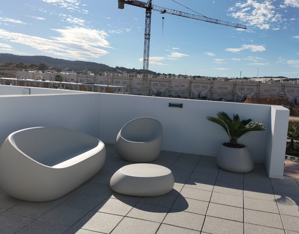 Uteområdene til disse boligene er designet for å maksimere nytelsen av det middelhavske klimaet. Hver eiendom har en terrasse, ideell for å slappe av utendørs eller nyte måltider i det fri. I tillegg inkluderer noen typologier et solarium, som gir ekstra plass til soling eller å skape et privat avslapningsområde. Hagene, som finnes i visse konfigurasjoner, gir et snev av natur og et perfekt rom for utendørsaktiviteter. Inkluderingen av pergolaer i uteområdene tilfører et element av skygge og stil, slik at man kan nyte utendørs selv på de mest solrike dagene.