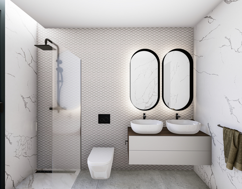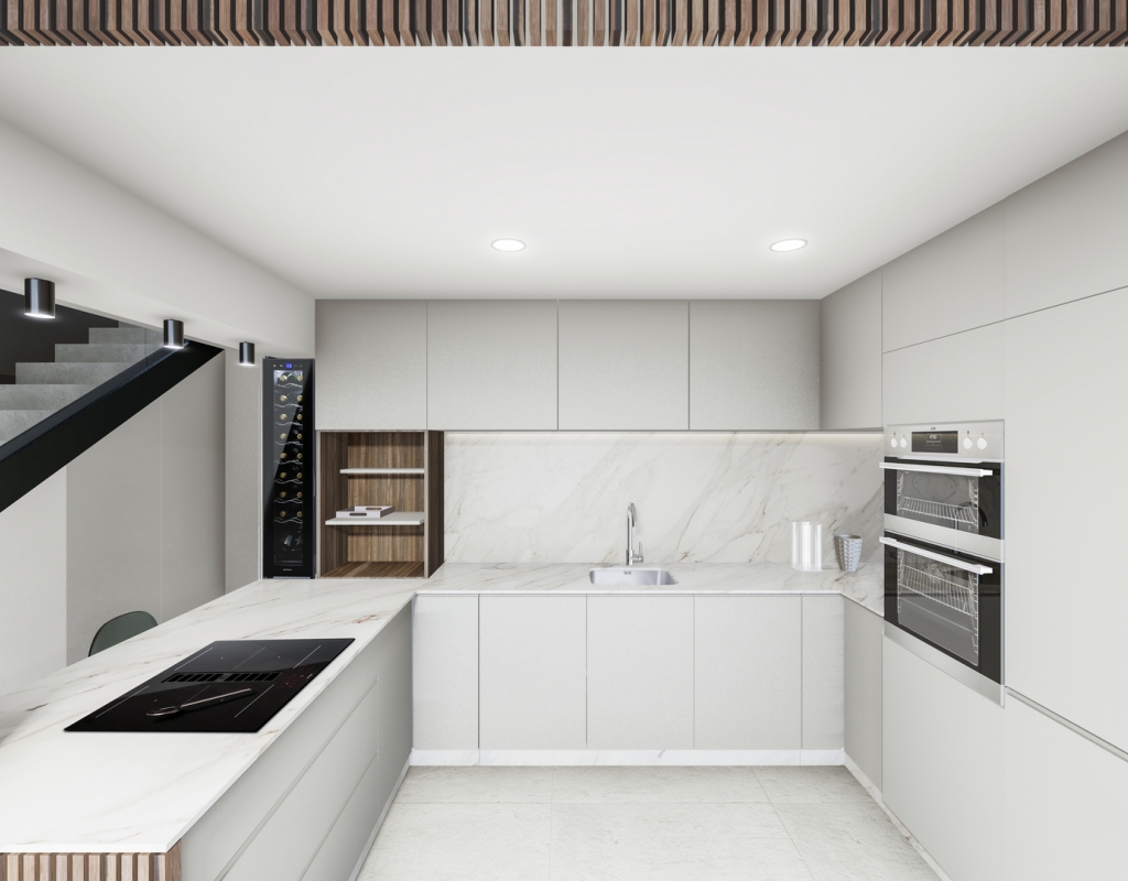 Interiøret i disse rekkehusene er designet med fokus på komfort og moderne teknologi. Gulv av porselensfliser gir et snev av eleganse og er lett å vedlikeholde. Den integrerte smarthusteknologien gjør det mulig å kontrollere ulike aspekter av hjemmet effektivt, mens elektriske persienner gir komfort og sikkerhet. Forhåndsinstallasjon av klimaanlegg sikrer et behagelig miljø året rundt. Innebygde garderober gir rikelig med lagringsplass, og inkluderingen av hvitevarer gjør hverdagen enklere. I tillegg gir videointercom ekstra sikkerhet og trygghet for beboerne.