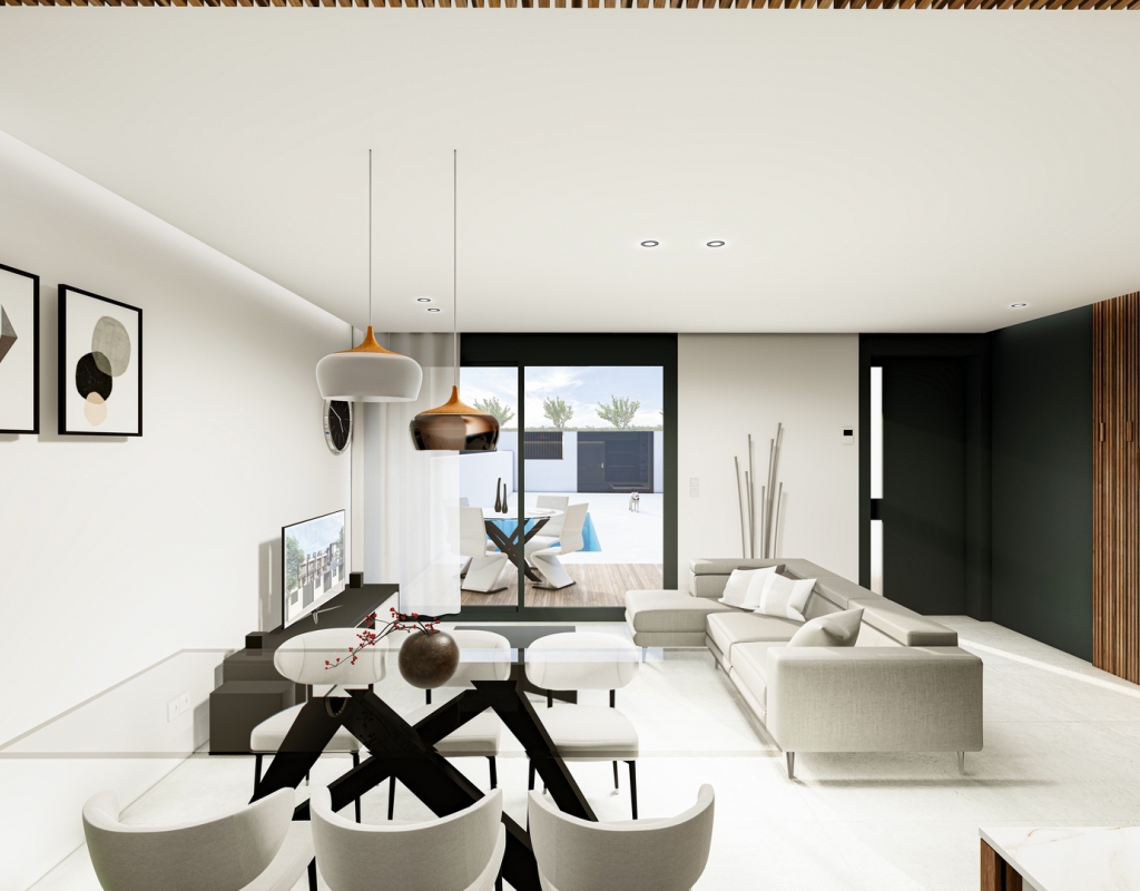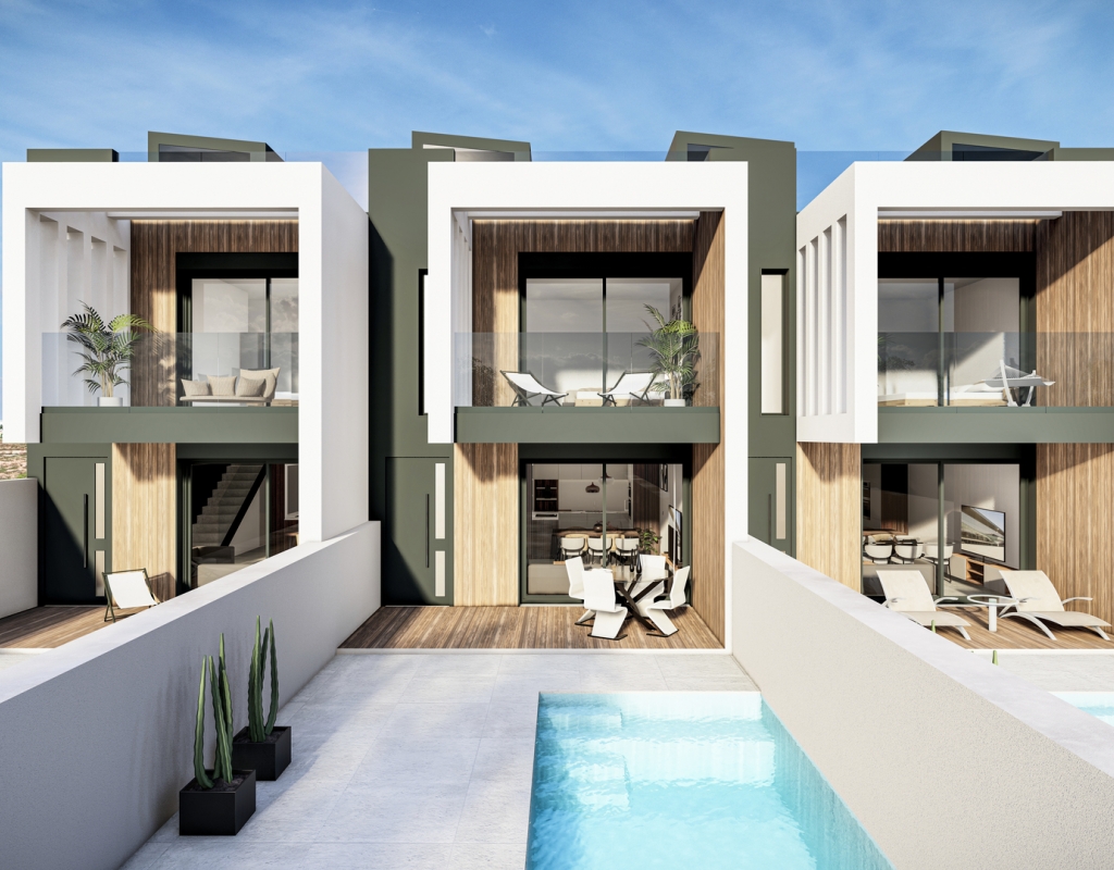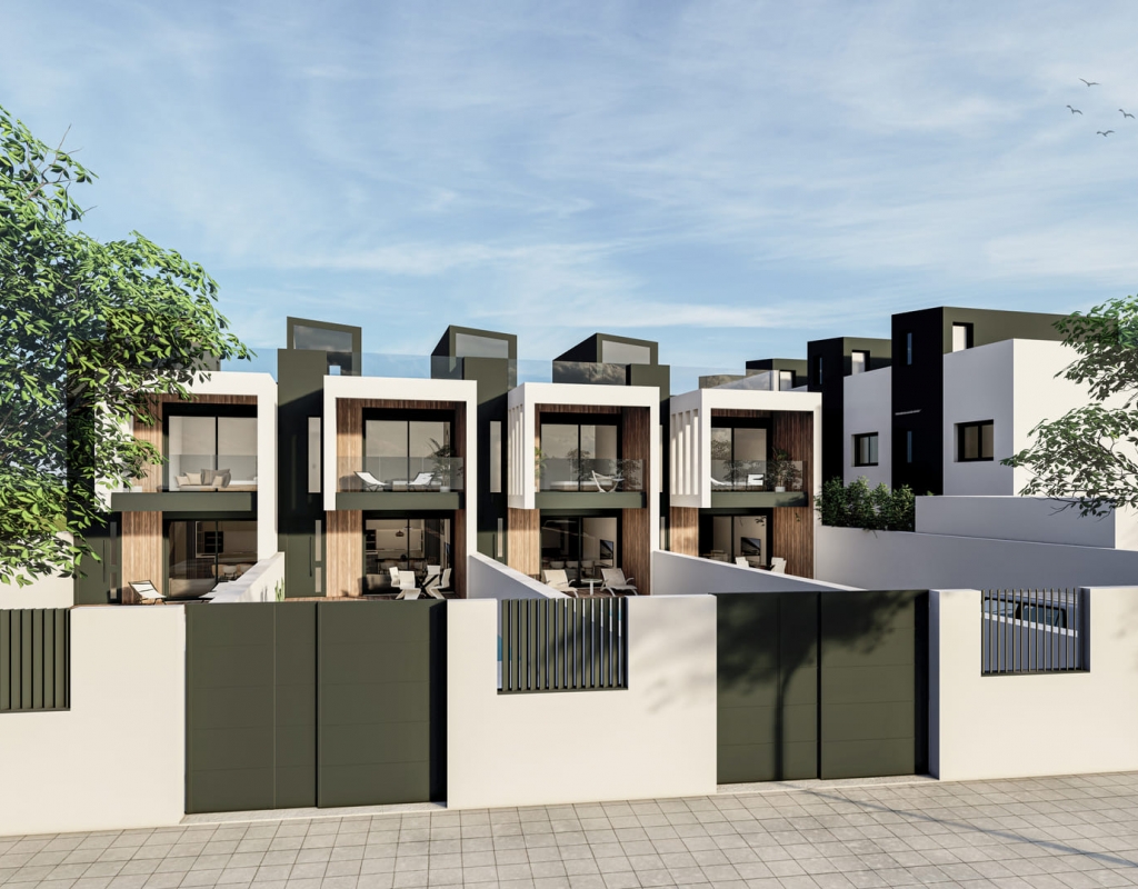 Utendørsområdene i disse rekkehusene er designet for å maksimere nytelsen av middelhavsklimaet. Hver eiendom har en privat hage, perfekt for utendørs fritidsaktiviteter. I tillegg gir de romslige terrassene mulighet til å nyte måltider utendørs eller bare slappe av i solen. For de som søker ekstra plass, er solariumet et ideelt alternativ, som gir et privat sted for soling eller nyte utsikten. Inkluderingen av et privat basseng i hver bolig gir en luksuriøs touch, slik at du kan kjøle deg ned på varme dager uten å forlate hjemmet.