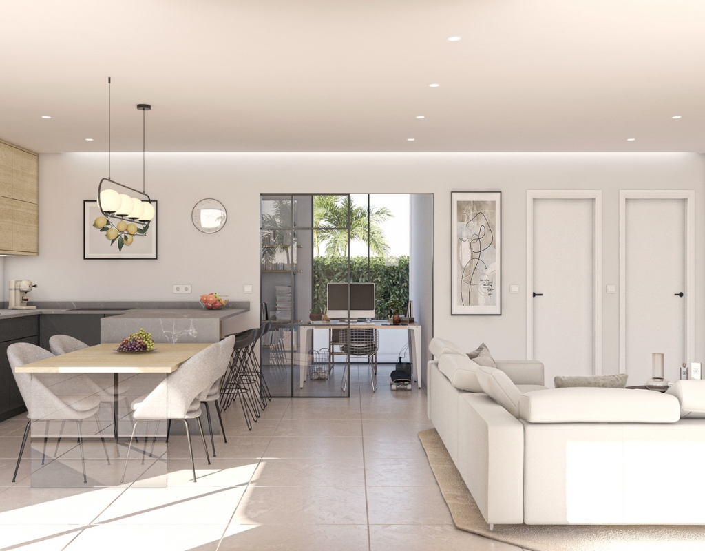 Interiøret i disse frittstående boligene er designet med oppmerksomhet på detaljer og materialer av høy kvalitet. Gulv i porselensfliser gir hvert rom et snev av eleganse og holdbarhet. Boligene har tre soverom og to bad, og tilbyr et komfortabelt og funksjonelt rom for hele familien. Innebygde skap gir effektiv lagring, mens forhåndsinstallasjon av klimaanlegg sikrer komfort året rundt. Elektriske persienner og inkluderte hvitevarer kompletterer et moderne og godt utstyrt hjem.