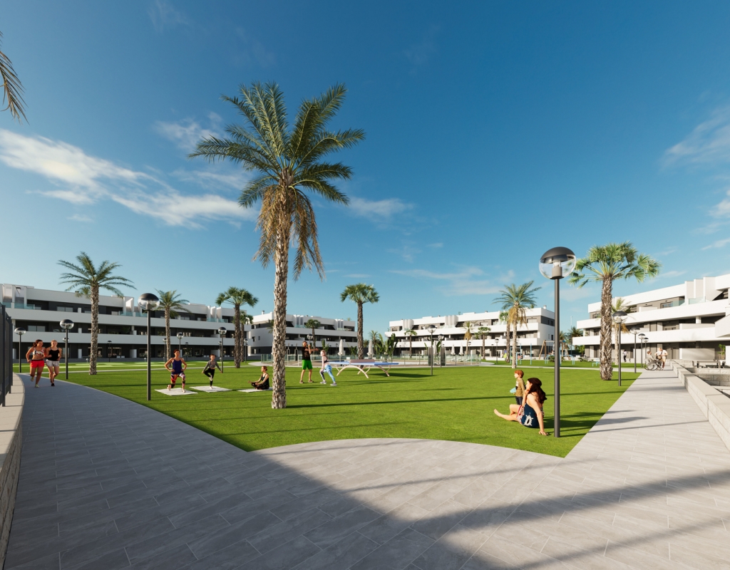 Utendørsområdene til disse eiendommene er designet for å maksimere nytelsen av middelhavsklimaet. Hver bolig har en privat terrasse, ideell for å slappe av utendørs eller nyte måltider al fresco. Første etasje og Penthouse tilbyr den ekstra fordelen av en privat hage, som gir et personlig grøntområde for fritid og ro. I tillegg har Penthouse et solarium, perfekt for å sole seg i total privatliv. Fellesskapet tilbyr også en garasje, som sikrer en trygg plass for parkering av kjøretøy. Nærheten til havet, bare 3,5 km unna, gjør det mulig å nyte imponerende utsikter og rask tilgang til lokale strender, noe som gjør denne beliggenheten ideell for havelskere.