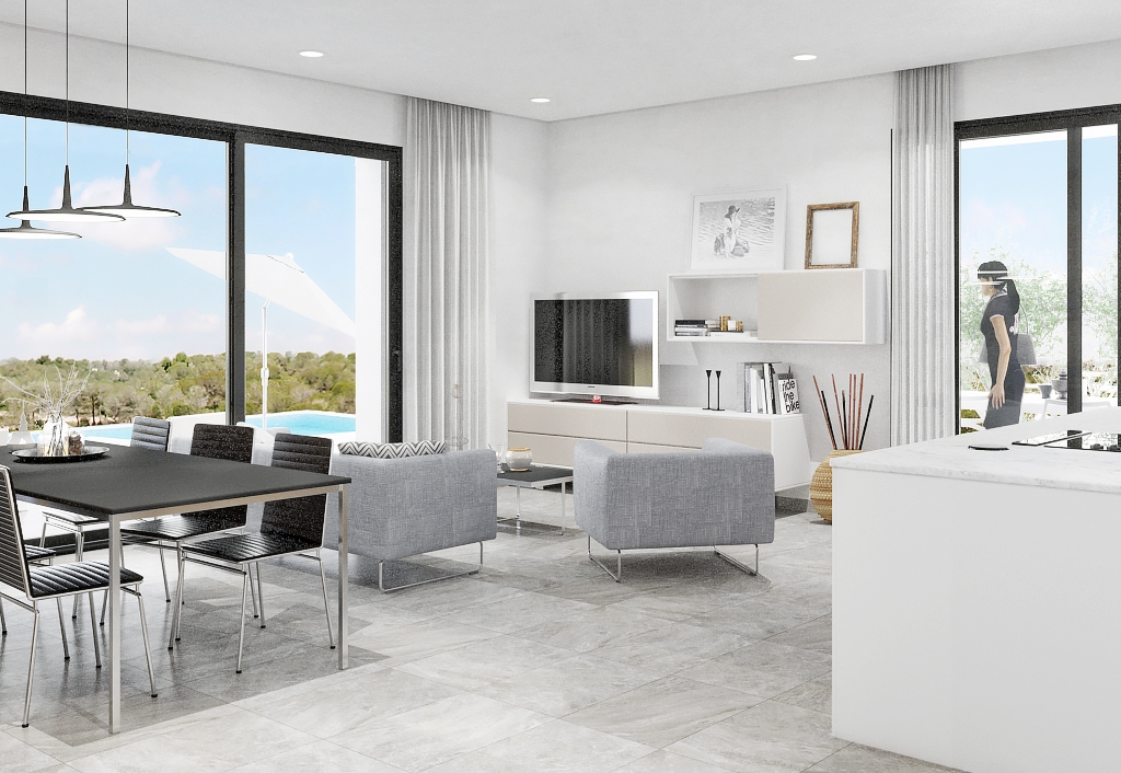 Interiøret i villaen er utstyrt med de mest moderne fasiliteter for å sikre maksimal komfort. Den har tre soverom og to bad, noe som gjør den perfekt for familier eller for å ta imot gjester. Gulvene i porselensfliser gir et snev av eleganse og er enkle å vedlikeholde. Villaen er utstyrt med hvitevarer av høy kvalitet, elektriske persienner og et smarthussystem som gjør det enkelt å kontrollere ulike funksjoner i hjemmet. Innebygde garderober gir rikelig med lagringsplass, mens videointercom gir ekstra sikkerhet.