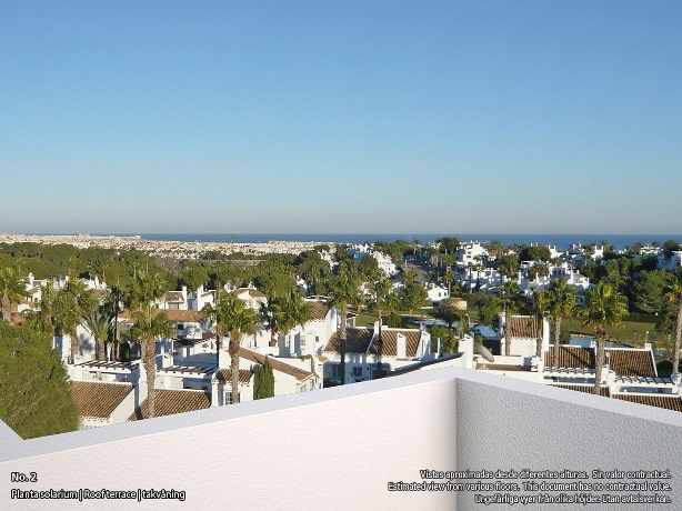 These Brand New, Three Bedroom Duplex Penthouse Apartments in Villamartin are located in one of, if not the most sought after golf areas in the region, situated between the Villamartin & Campoamor golf courses, with a wider range of courses within a 10 km radius, and close to the recently opened ’La Zenia Boulevard’ (largest commercial centre in Valencia). These properties comprise on the main floor as you enter, of an open plan kitchen, with feature extendable table; spacious living room with access out to the terrace; two double bedrooms, possible en suite; and a family shower room. Internal stairs lead to the next level consisting of the master bedroom, with walk in wardrobe and en suite. Just off the master bed room is the first part of the solarium, with amazing views and external stairs up to the roof top solarium, which is where you can truly appreciate the outstanding views of the surrounding area and sea, all whilst sunbathing or dining outdoors. Extras are included, don’t miss out, as they are selling fast!!!