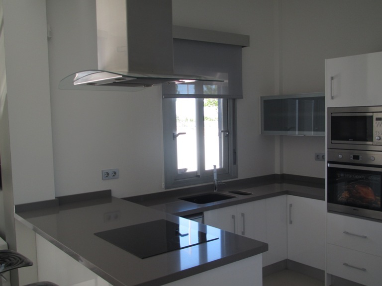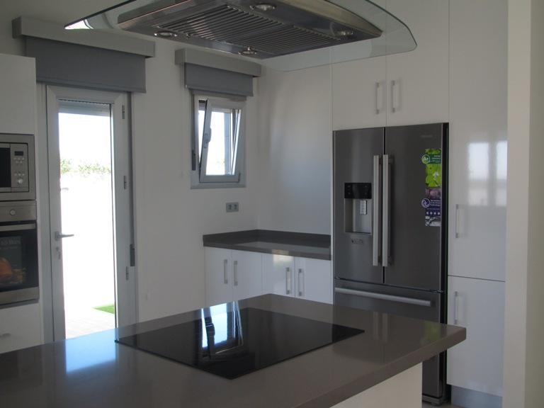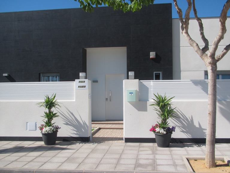 East Facing, Three Bedroom, Brand New Detached Villa in Pilar de la Horadada. An enviable location, just 5 minutes drive to the beach at Torre de la Horadada and the town centre, where you will find everything you need, including British cinema, shops, street market, banks, supermarkets etc., The motorway network and the N332 assures great commuting along the coast to the cities of Alicante and Murcia, with San Javier airport just 20 minutes away. The Orihuela Costa with the Zenia Boulevard shopping centre is just a 10 minute drive. These contemporary style villas comprise: lounge/dining room with sliding doors out to the covered terrace, overlooking the private pool; fitted modern open plan kitchen; 3 double bedrooms with fitted wardrobes, master with en suite and walk in wardrobe; family bathroom; external access to the immense 118m2 solarium with enviable views across the area and to the sea. The plots are tiled with grassed area and off road parking. Great price for a property so close to the beach!