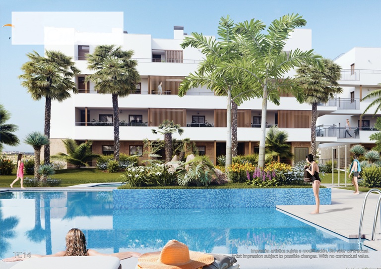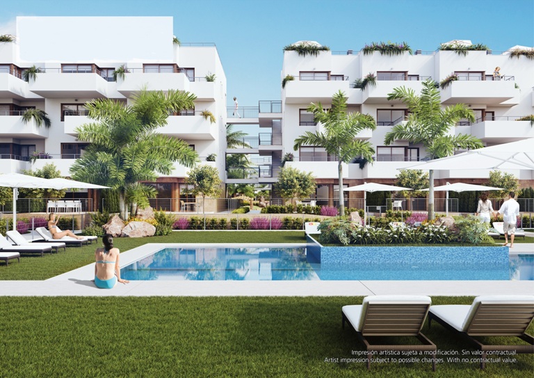 Brand New, Two Bedroom, Modern Apartments in Campoamor are situated on this exquisite complex offering amazing communal zones like pool, relaxing & recreational areas with pond. Situated just 10 minutes drive to the beach with all amenities to hand, plus various golf courses right on the doorstep; plus a short walk to supermarket, bars and restaurants. High quality is assured due to the reputation of this well known constructor with all apartments having pre-installed air con and under floor heated bathrooms, the majority having views to the communal zones. The ground floors will have a garden and the penthouses a private solarium where many will enjoy sea views. There is a spacious terrace off the lounge/dining room; open plan kitchen; utility; 2 double bedrooms with fitted wardrobes, master with terrace and en suite. An impressive complex, don´t miss out on the chance of your holiday home by the sea at such amazing prices.