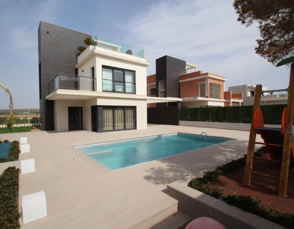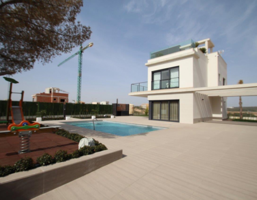 These Spectacularly Designed, Three & Four Bedroom Detached Villas in San Miguel de Salinas are located on the edge of a Spanish town, within easy reach of many amenities, from bars & restaurants, to shops & supermarkets, not forgetting within a 10 minutes drive of several golf course including Las Colinas, Campoamor, Villamartin & more... Also less than a 15 minutes drive to the coast of Orihuela Costa, where you can find superb beaches. These properties have been built to a very high standard, comprising of an open plan fully fitted kitchen, with back door to the garden, spacious lounge/dining room with double doors out to the front terrace, overlooking the private garden & swimming pool; three or four bed rooms, depending on your personal choice (at no extra cost for the re-design), one of the bedrooms with a private terrace in the first floor; two family shower rooms; & a downstairs toilet. Outside is a nicely landscaped garden with a stunningly finished pool area & off road parking. Internal stairs lead to the 2nd floor roof top solarium, ideal for BBQ’s, dining outdoors, sunbathing & relaxing, all whilst enjoying the lake/sea view depending on the situation, orientation, etc... Including many extras such as heated floors in the bathroom, private pool, white goods, storage cupboards & more... *Prices vary according to plot size!