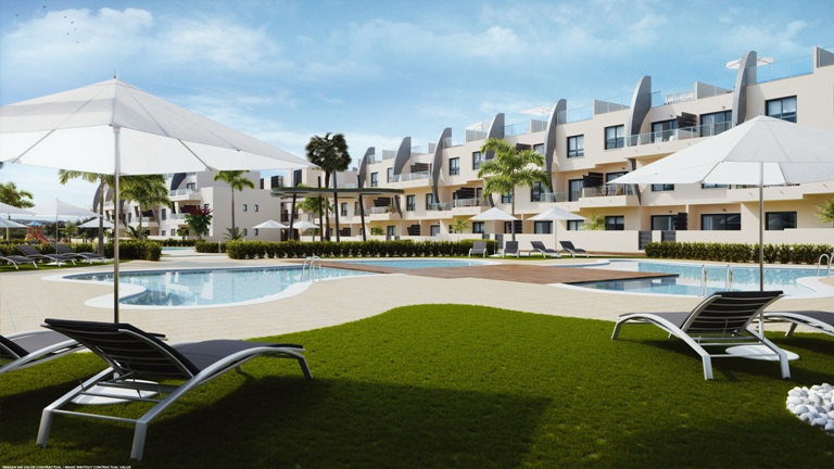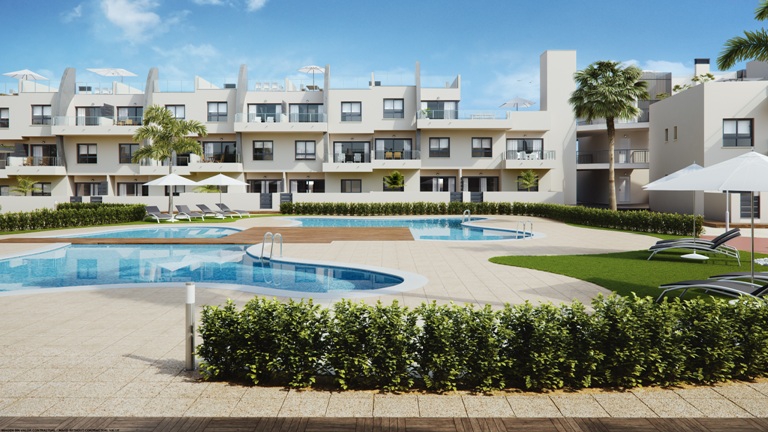 These Two Bedroom Apartments in Mil Palmeras are located in a highly sought after, up and coming area, between the Orihuela Costa and Torre de La Horadada. Situated within 600 metres of the beautiful beaches and sea front at Mil Palmeras, also just a few minutes drive or walk to local amenities, not forgetting a wide array of golf courses just a 10 minute drive too. These properties, either ground floor with a private garden, top floor with a private solarium or 1st floor with a spacious terrace, all comprising of an open plan fitted kitchen; spacious bright lounge/dining room with double doors out to the front terrace, having beautiful views over the desirable communal garden, park and swimming pool area; two double bedrooms, the master with en suite; and a family shower room. These properties are being finished to a superb high quality standard, with many additions available and included… Sea side location, great quality and a super price, these will sell fast, so don’t miss out!