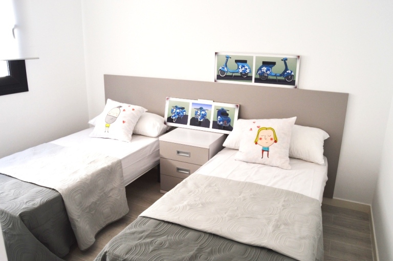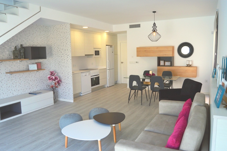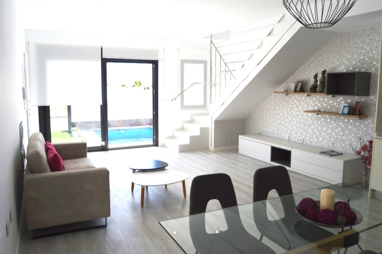 These Stunning, South Facing, Three Bedroom Semi Detached Villas in Pilar de La Horadada are located in a great location, situated on the edge of this Spanish town, yet still within a few minutes walk of an abundance of amenities and facilities, with the nearest beaches of Torre de La Horadada less than a 5 minute drive away. These stylish properties comprise of an open plan fitted kitchen, spacious lounge/dining room with large, double glass doors out to the front landscaped garden and private swimming pool; three double bedrooms, one of which is on the ground floor with access out to the rear terrace, and the master on the first floor leading out to the spacious 16m2 terrace with views over the nice garden, pool and surrounding area; and a family shower room. Many extras are included with these priced to sell properties, such as an off road parking space, pre-installed air conditioning, fitted wardrobes and more... From €190.000