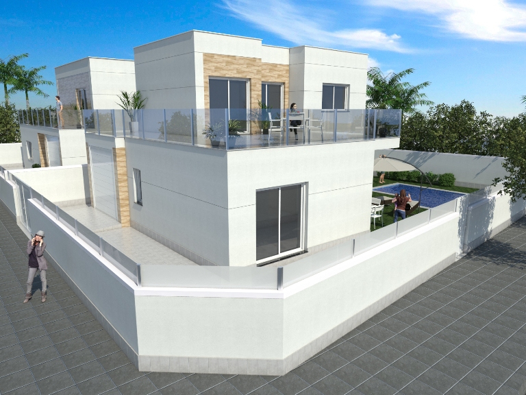 These South-East Facing, Three & Four Bedroom Detached Villas in San Pedro del Pinatar are located on the Costa Calida, between Pilar de La Horadada and San Javier. Situated within a 5 to 10 minute walk of the local amenities and facilities, and only a 5 minutes drive from the coast! These properties comprise of an open plan fully fitted kitchen; spacious lounge/dining room with large, glass, double doors out to the terraces and gardens, overlooking the beautiful ’L’ shaped swimming pool & Jacuzzi; three double bedrooms, two of which with walk in wardrobes, or if the four bedroom model they have fitted wardrobes; plus two family shower rooms. The master on the first floor has double doors out to the solarium, covered in sun, ideal for private sunbathing, whilst enjoying the surrounding area, garden and pool views! Extras with these properties include fitted or walk in wardrobes, pre-installed air conditioning, garage and a nicely landscaped garden… Starting from €375.000!!!