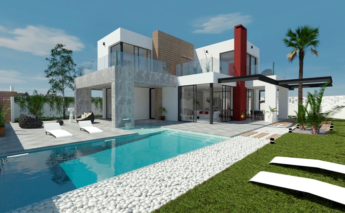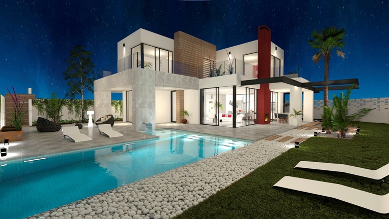 These Absolutely Outstanding, South Facing, Three Bedroom Detached Villas in La Serena Golf Resort are located in Los Alcazares, on The Costa Calida. Situated within 2km of the nearest local shops, bars and other amenities, also the beautiful Mar Menor beaches are less than 2km away also. From these fantastic properties, with two styles available, have amazing views over the private gardens, swimming pool and golf course, each one comprising of an open plan fully fitted kitchen, with stylish island; extremely spacious and bright lounge/dining room with several large glass sliding doors out to the vast terrace and garden space, perfect for eating & BBQ’s al fresco, overlooking the pool; three double bedrooms, one of which is on the ground floor and the other two on the first floor, each with their own private terraces, with great views, and the master with en suite; and a further two family shower rooms. Outside is a stylishly landscaped garden with grass, bark, reddish volcanic gravel, fountains, pergolas, pool and plenty of room to enjoy the Spanish lifestyle! Extras with these stunning properties are to include a garage space with utility space + washer, dryer & sink, air conditioning throughout, fitted wardrobes, aero thermic system, oven, hob & extractor, private swimming pool with Roman steps & LED lights, plenty of off road parking, under floor heating in the bathrooms, and intercom!!!