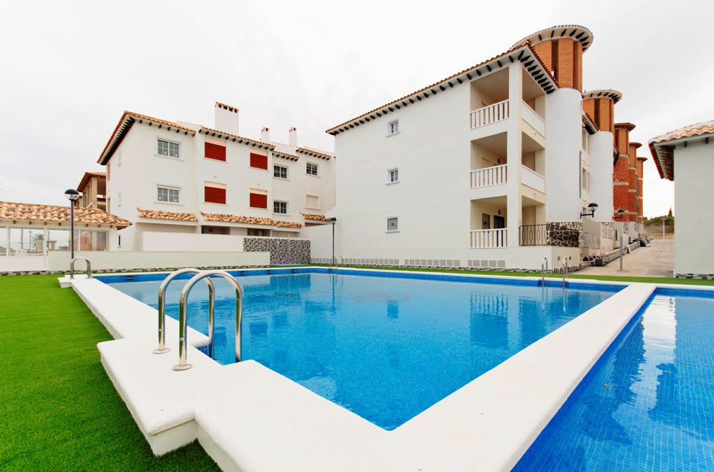 These Stylish, Two Bedroom Apartments in El Pinet are located in the beachside area of La Marina village, just a 15 minute walk to the nearest amenities, facilities and of course pretty beaches on offer, whilst Alicante Airport is only a 20 minute drive away!!! These lovely properties comprise of a separate fitted kitchen, with an adjoining utility room off the rear; spacious lounge/dining room leading out to the front covered terrace, great for dining al fresco; two double bedrooms; and a family shower room… The communal solarium with stunning sea views, can be reached via the external stairs! In this resort itself is a delightful communal swimming pool too! Extras with these properties include a private under ground car parking space, fitted wardrobes, fully fitted bathrooms with draws and shower screen, and grills on the ground floor options… Starting from only €95.000!!!