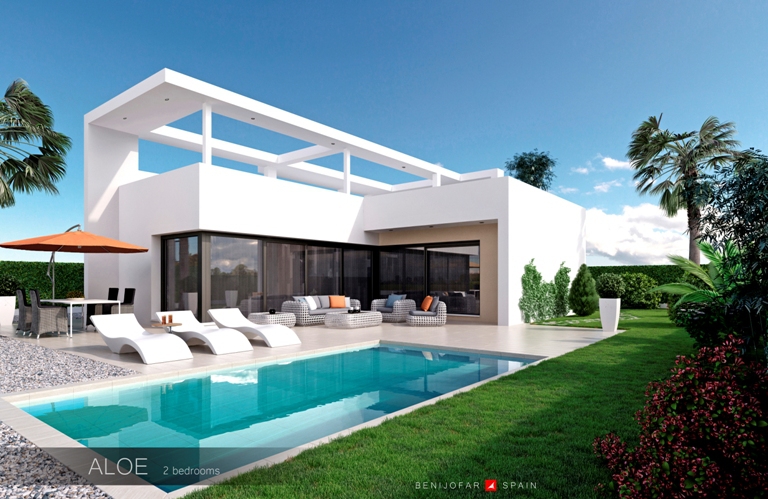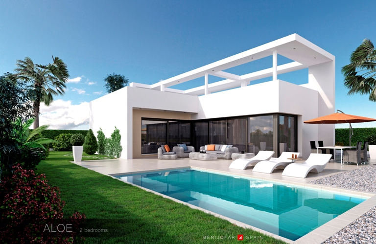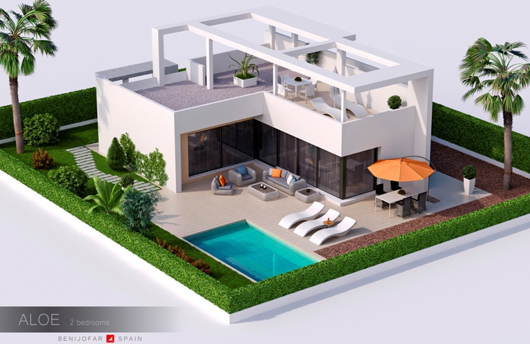 These Brand New, Two Bedroom Detached Villas in Benijofar are located on the edge of this popular Spanish town, between Quesada and Rojales. Within easy walking distance of everything this area has to offer, such as a wide selection of bars and restaurants, shops, hairdressers, pharmacy, banks and more... With the nearest award winning beaches and sea fronts at Guardamar in just a 12 minute drive. These stunning properties comprise all on one level of an open plan, modern fitted kitchen; spacious lounge/dining room with large double doors out to the garden and private swimming pool of 18m2; two double bedrooms; and a family shower room. There is also an option for an en suite shower room as an extra cost of €11.000... External stairs from the garden lead to the spacious 48m2 roof top sunny solarium, perfect for BBQ’s and enjoying the Spanish lifestyle, whilst taking in the pretty surrounding views of the private pool, country and mountains beyond... Extras included are pre-installed air conditioning, fitted wardrobes, under floor heating in one of the bathrooms, electric gates to the off road parking space and the highest of quality finishes! From €287.000...