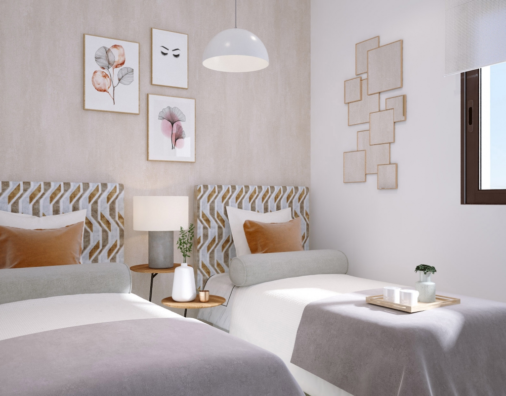 These Brand New, Two Bedroom Apartments in Villamartin, are situated just a 10-15minute walk to a major supermarket, variety of bars/eating establishments, including La Fuente commercial centre. There are 3 major golf courses right on the doorstep, with La Zenia Boulevard shopping centre just 10 minutes by car and an array of beaches along the cost just 5 minutes further on. This complex will be gated and will be constructed around a lovely communal pool and garden area. The top floor apartments will benefit from a sea view from an amazing private solarium (40—50m2) and the ground floors a garden. The apartments comprise of a bright and airy living area with sliding doors leaving out to a spacious terrace; open plan modern fitted kitchen; two double bedrooms with built-in wardrobes, master with access to a terrace and en suite shower room (some options have 2 shower rooms). The complex will include underground parking, a lift and the apartments all come with pre-installed air conditioning. Be quick, at these starting prices, availability will not be there for long.