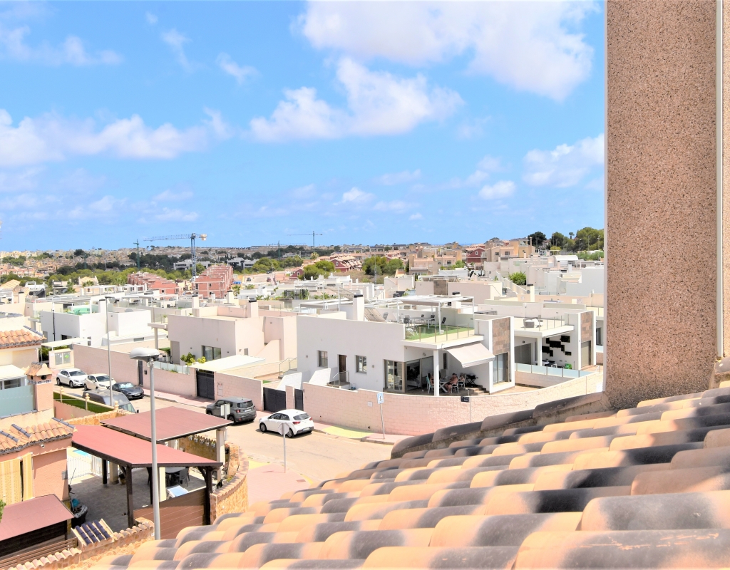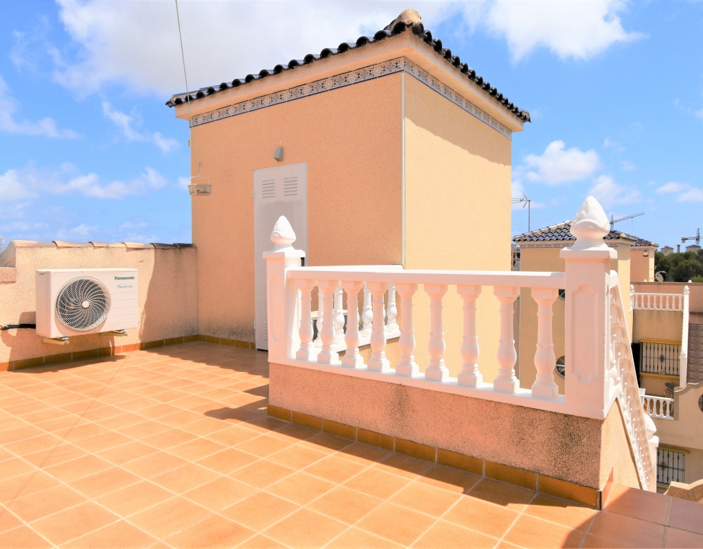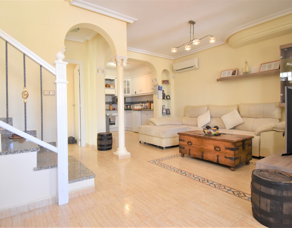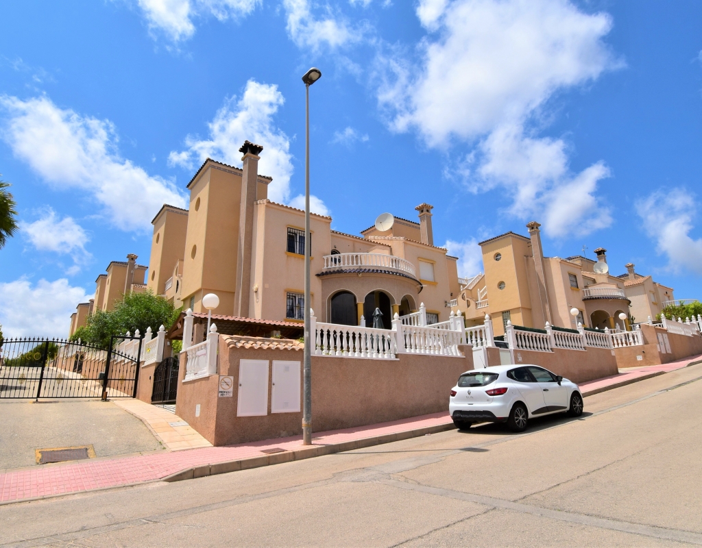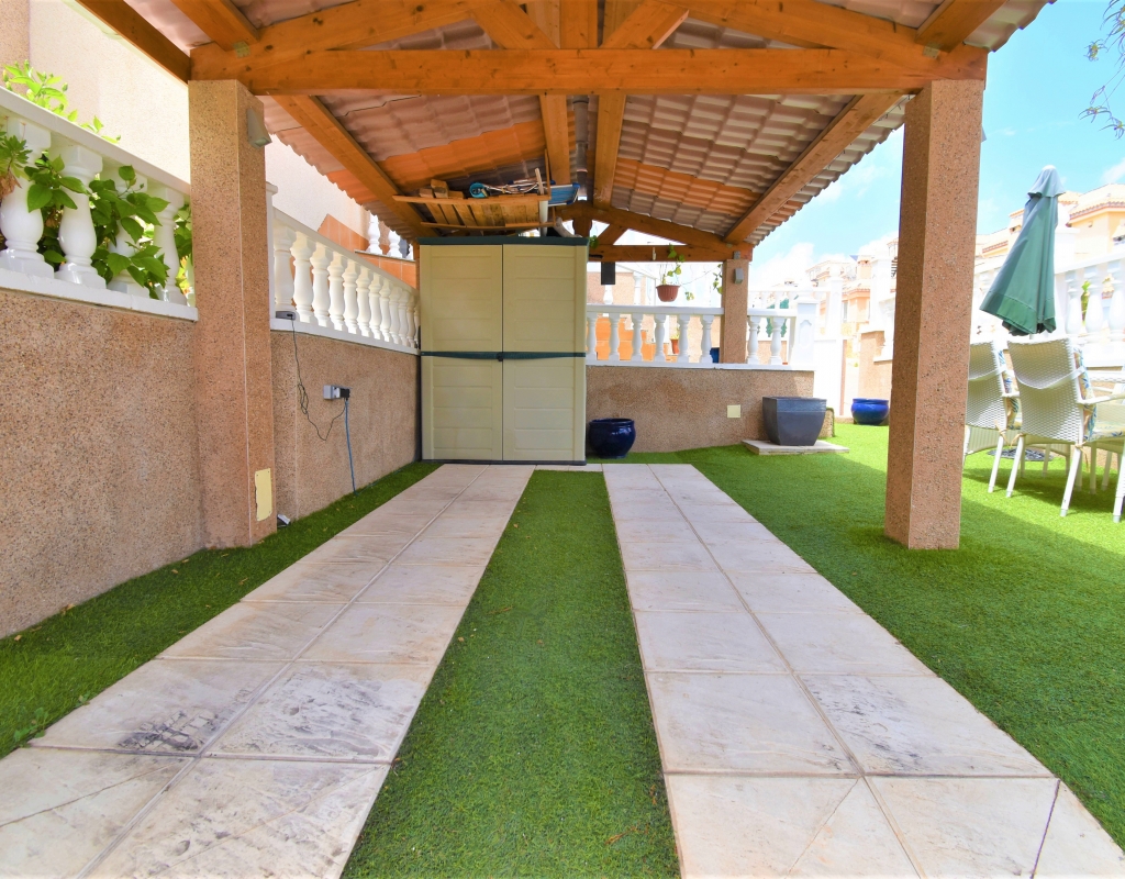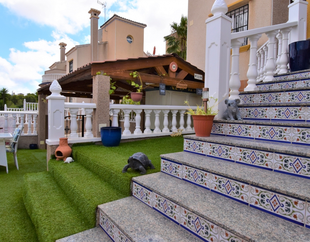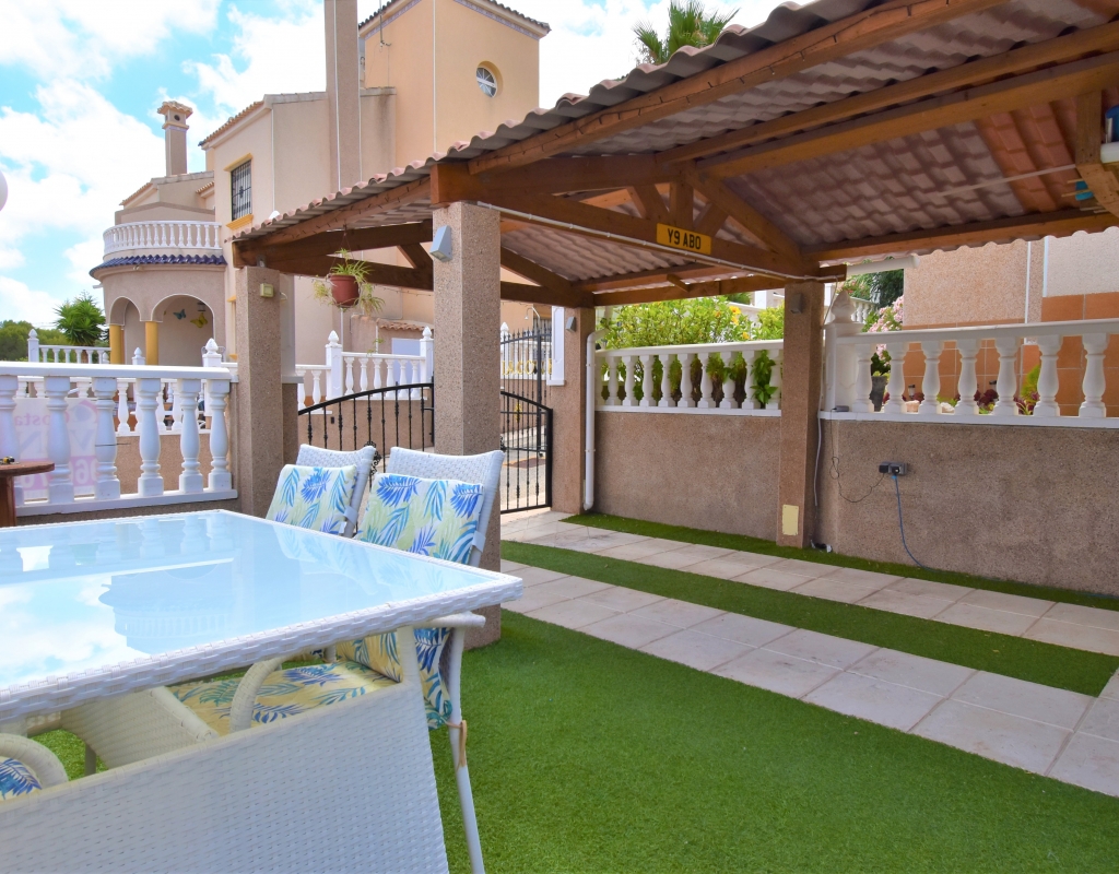 This Corner, East Facing, Three Bedroom Quad Villa in Villamartin is located within the area of Pau 26, close to Los Altos, on the Orihuela Costa. Situated within a couple of minutes drive to the nearest shops and amenities. Villamartin Square and Golf Course just a couple of minutes drive away also, whilst the beaches are also only a 5 minute drive away! This property comprises of an American style fully fitted kitchen; ‘L’ shaped lounge/dining room with the front, covered, glazed and rounded terrace just off, which has created an ideal winter room and additional living space, overlooking the garden; three double bedrooms, one of which is on the ground floor, the other two bedrooms on first floor, master with a private terrace; another first floor terrace leading to the private roof top solarium, ideal for sunbathing and those summer evening parties, with superb open surrounding area views; a downstairs shower room; and a updated family walk in shower room... Outside is a beautiful landscaped garden, mainly with artificial grass, with graveled areas, many plants, ample outdoor seating areas, including a car port for off road parking. Extras include fitted wardrobes, air conditioning throughout, grills, fireplace, Desirable communal swimming pool just 150m away!