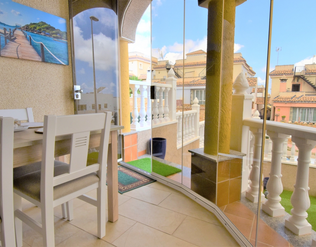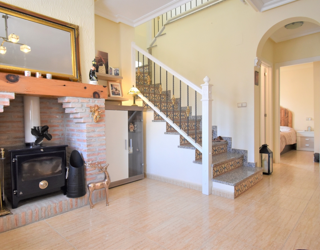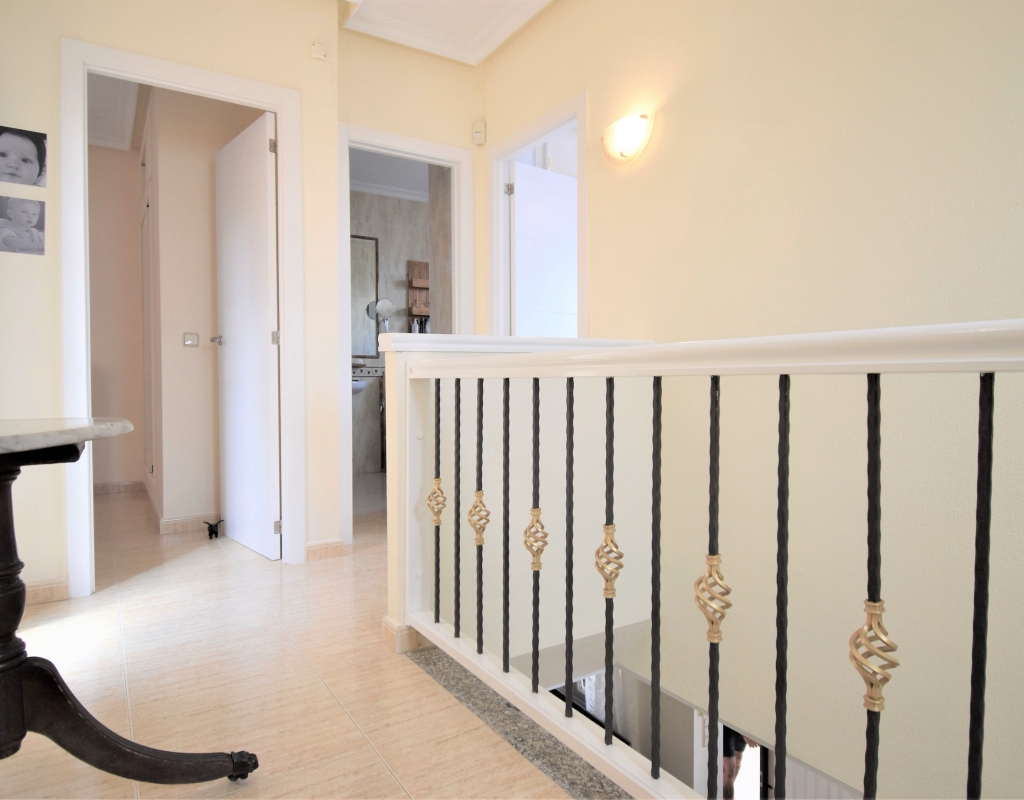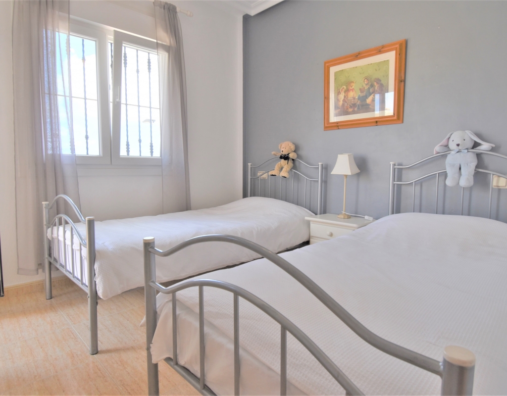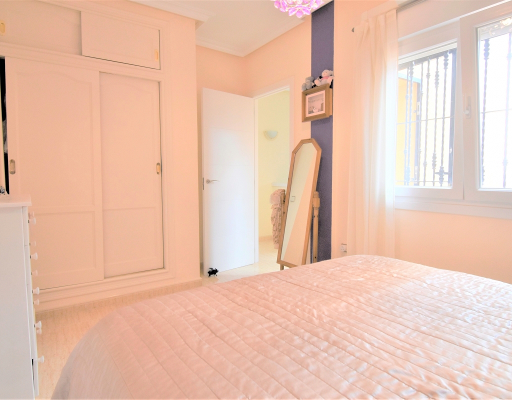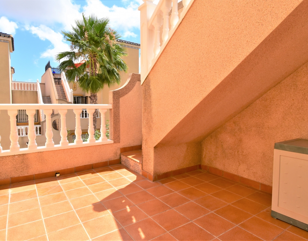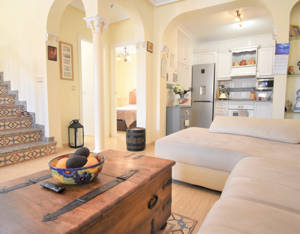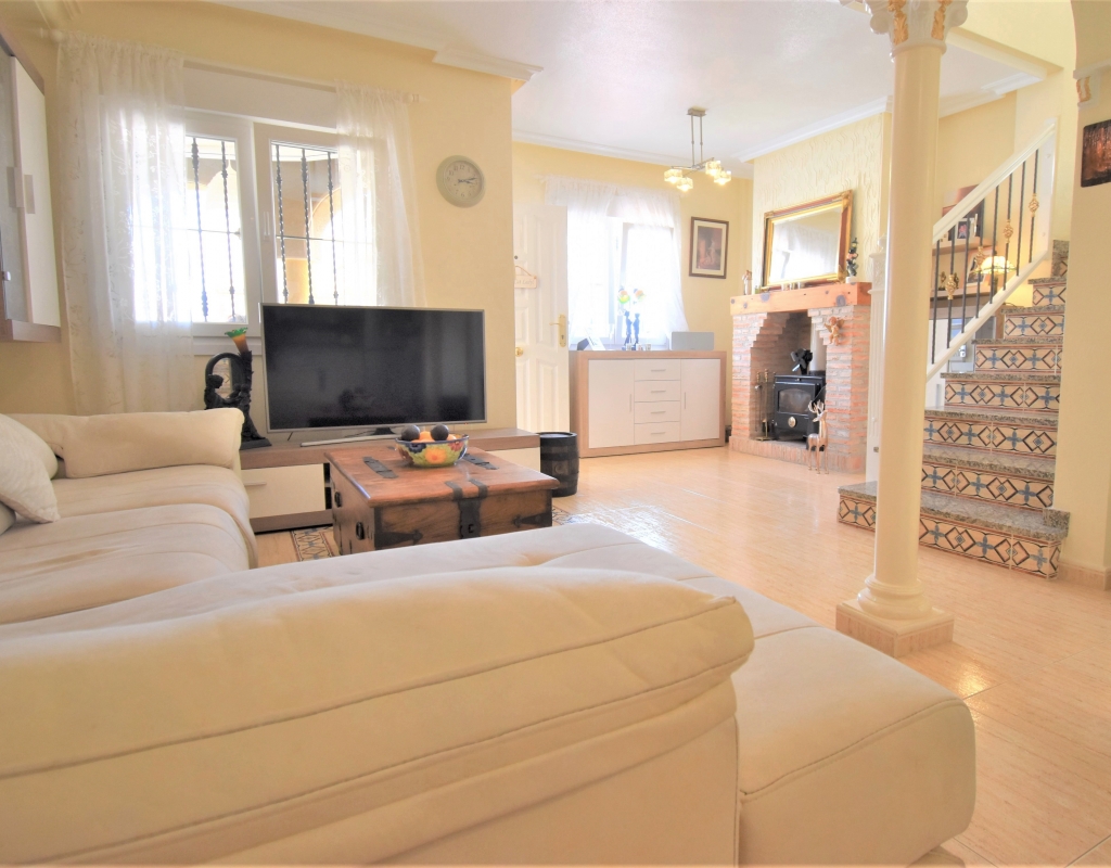 This Corner, East Facing, Three Bedroom Quad Villa in Villamartin is located within the area of Pau 26, close to Los Altos, on the Orihuela Costa. Situated within a couple of minutes drive to the nearest shops and amenities. Villamartin Square and Golf Course just a couple of minutes drive away also, whilst the beaches are also only a 5 minute drive away! This property comprises of an American style fully fitted kitchen; ‘L’ shaped lounge/dining room with the front, covered, glazed and rounded terrace just off, which has created an ideal winter room and additional living space, overlooking the garden; three double bedrooms, one of which is on the ground floor, the other two bedrooms on first floor, master with a private terrace; another first floor terrace leading to the private roof top solarium, ideal for sunbathing and those summer evening parties, with superb open surrounding area views; a downstairs shower room; and a updated family walk in shower room... Outside is a beautiful landscaped garden, mainly with artificial grass, with graveled areas, many plants, ample outdoor seating areas, including a car port for off road parking. Extras include fitted wardrobes, air conditioning throughout, grills, fireplace, Desirable communal swimming pool just 150m away!