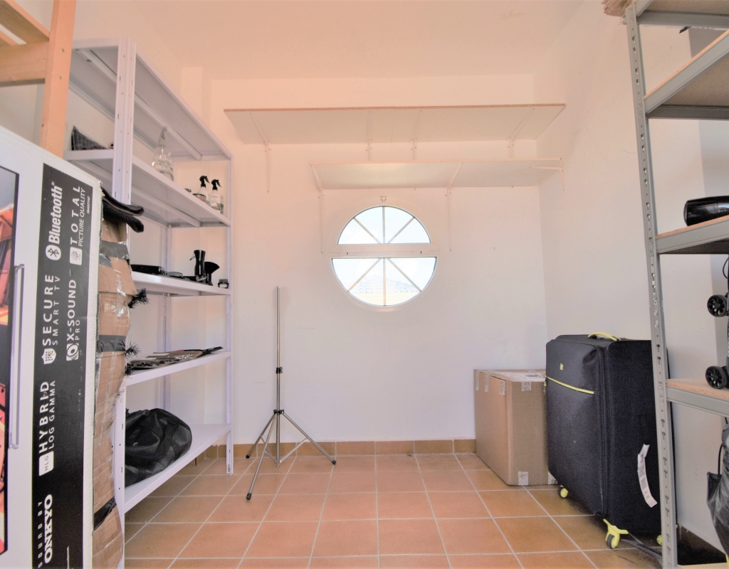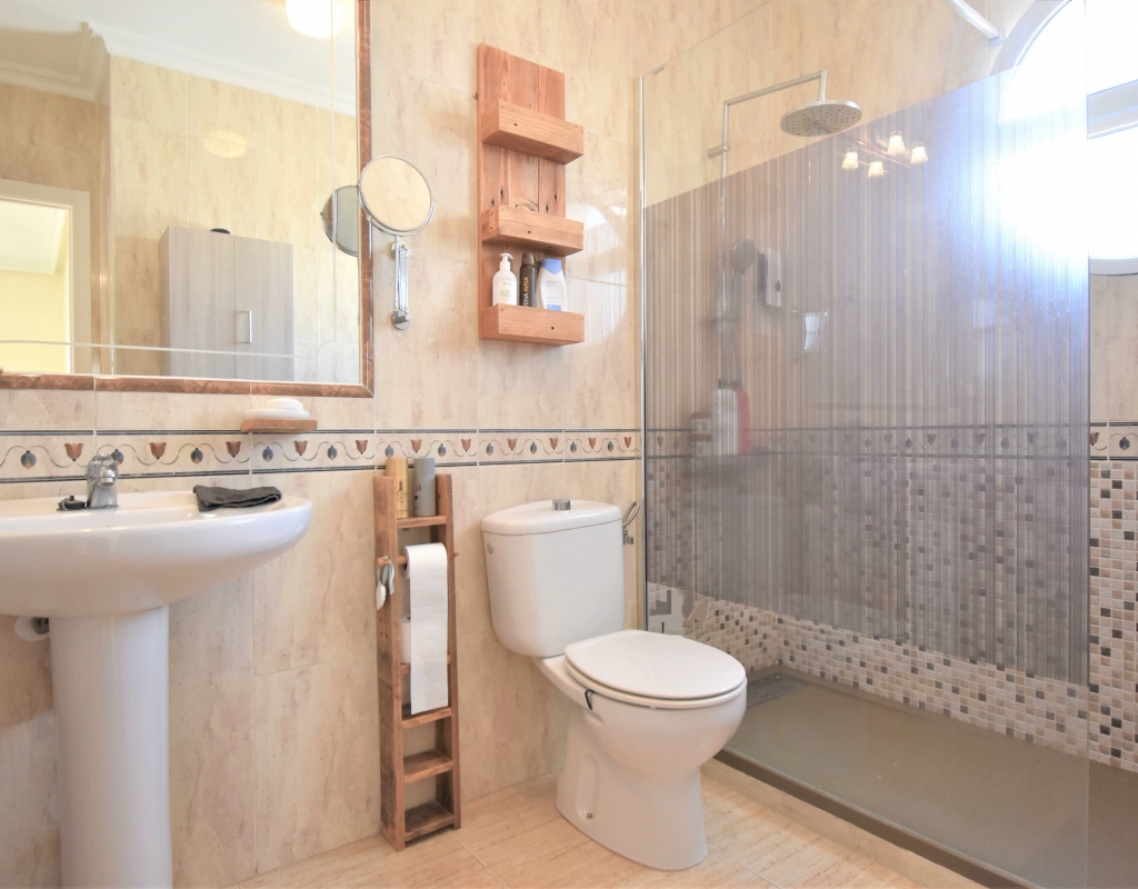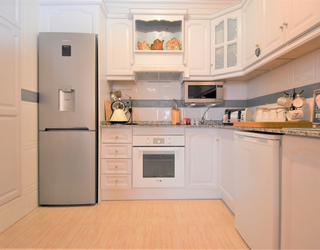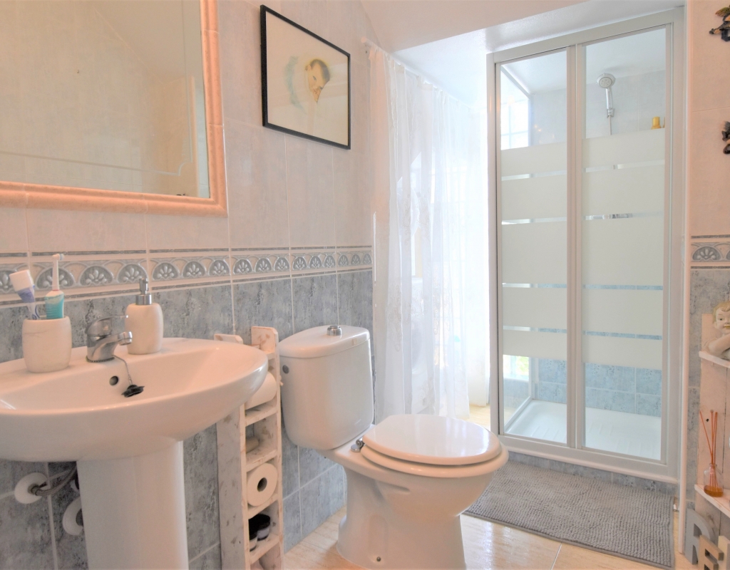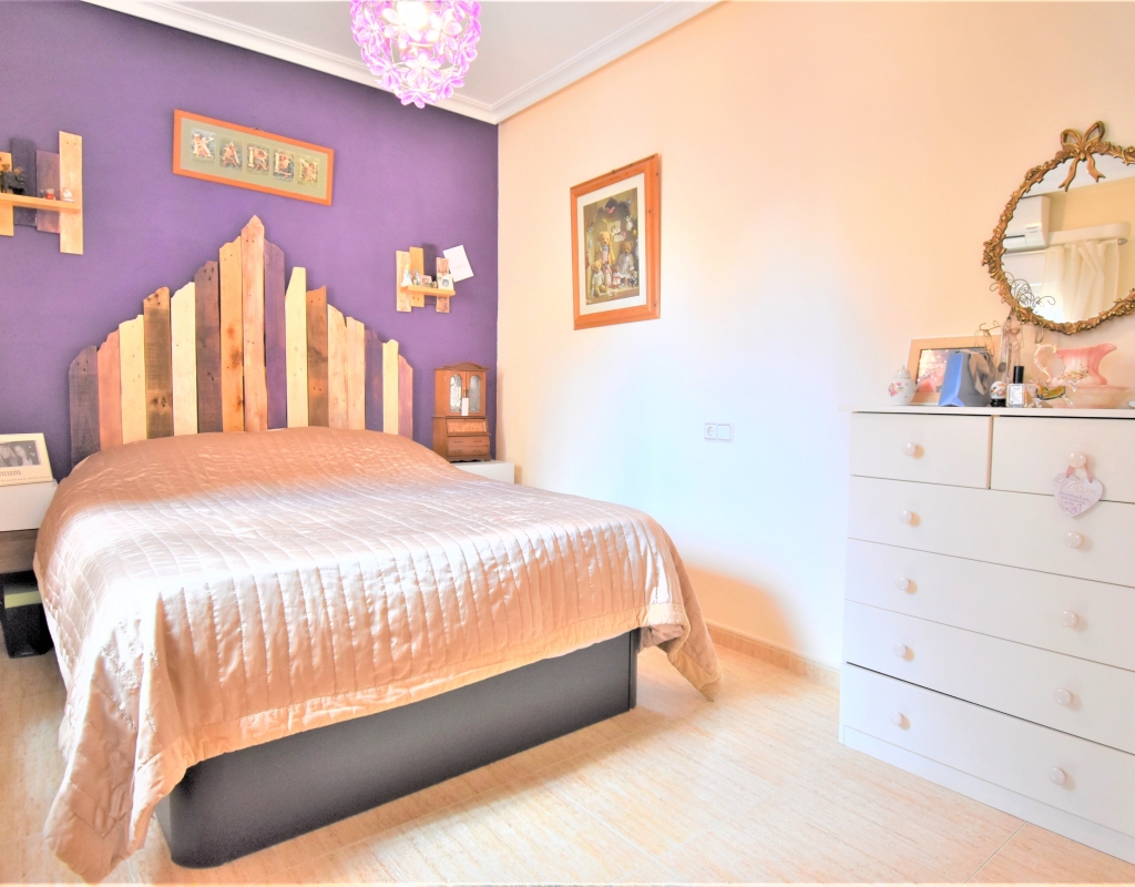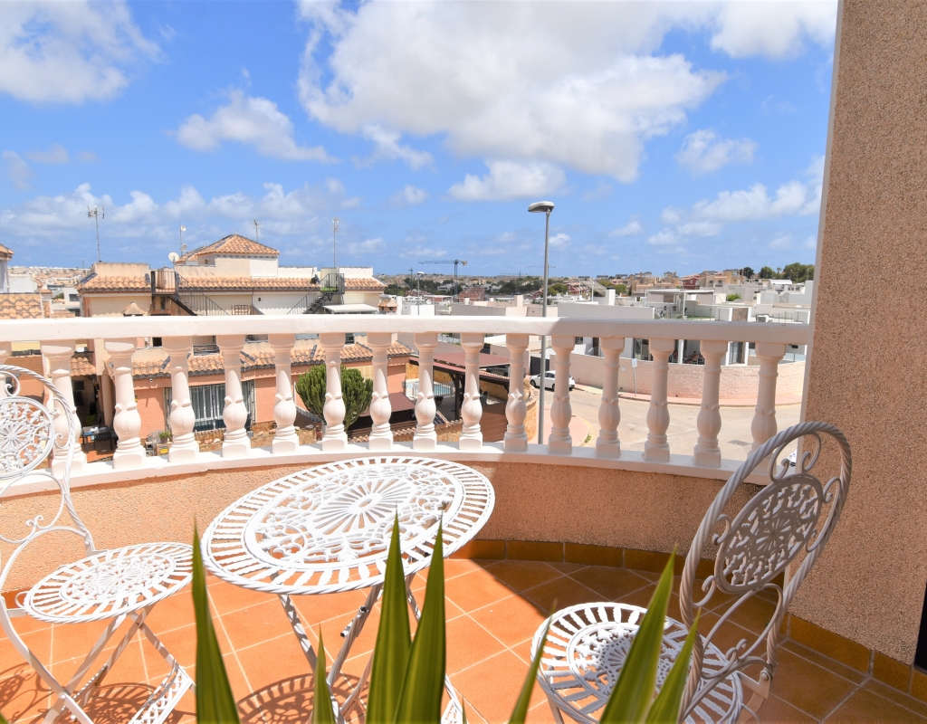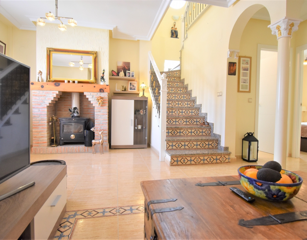 This Corner, East Facing, Three Bedroom Quad Villa in Villamartin is located within the area of Pau 26, close to Los Altos, on the Orihuela Costa. Situated within a couple of minutes drive to the nearest shops and amenities. Villamartin Square and Golf Course just a couple of minutes drive away also, whilst the beaches are also only a 5 minute drive away! This property comprises of an American style fully fitted kitchen; ‘L’ shaped lounge/dining room with the front, covered, glazed and rounded terrace just off, which has created an ideal winter room and additional living space, overlooking the garden; three double bedrooms, one of which is on the ground floor, the other two bedrooms on first floor, master with a private terrace; another first floor terrace leading to the private roof top solarium, ideal for sunbathing and those summer evening parties, with superb open surrounding area views; a downstairs shower room; and a updated family walk in shower room... Outside is a beautiful landscaped garden, mainly with artificial grass, with graveled areas, many plants, ample outdoor seating areas, including a car port for off road parking. Extras include fitted wardrobes, air conditioning throughout, grills, fireplace, Desirable communal swimming pool just 150m away!