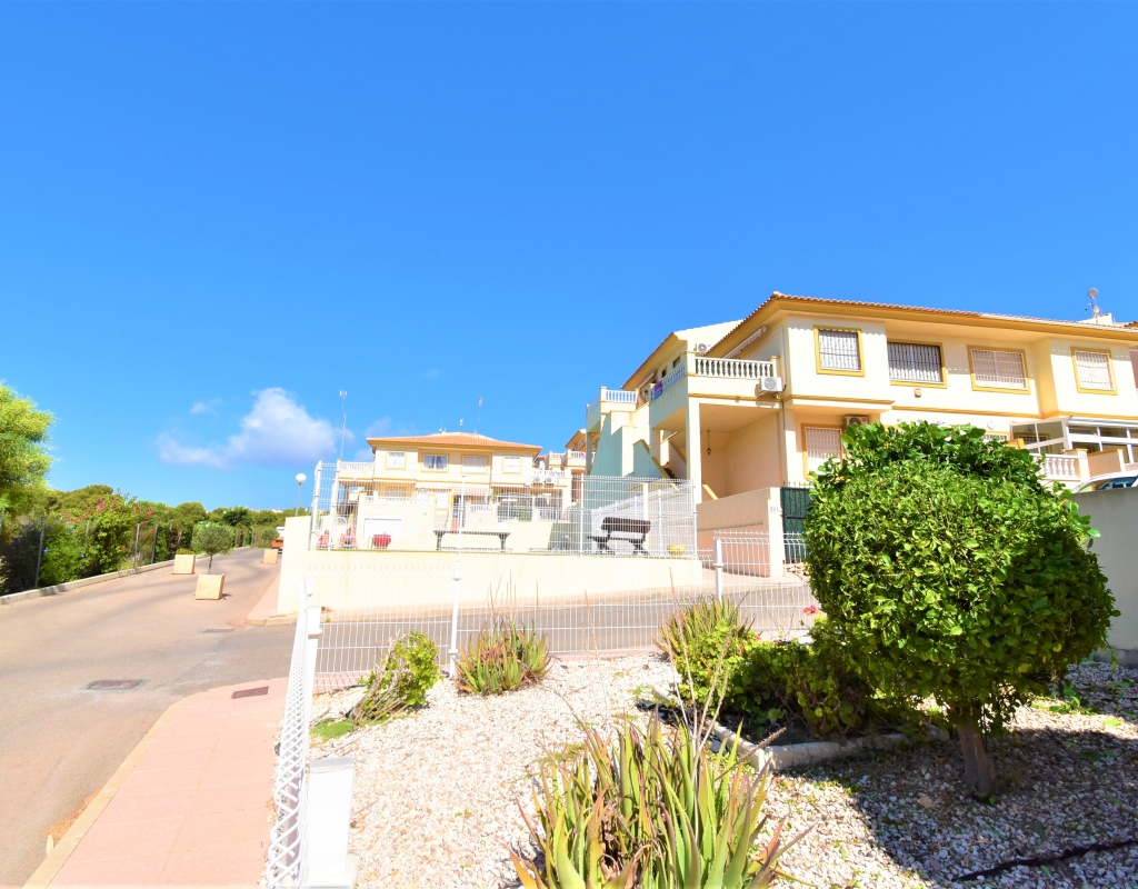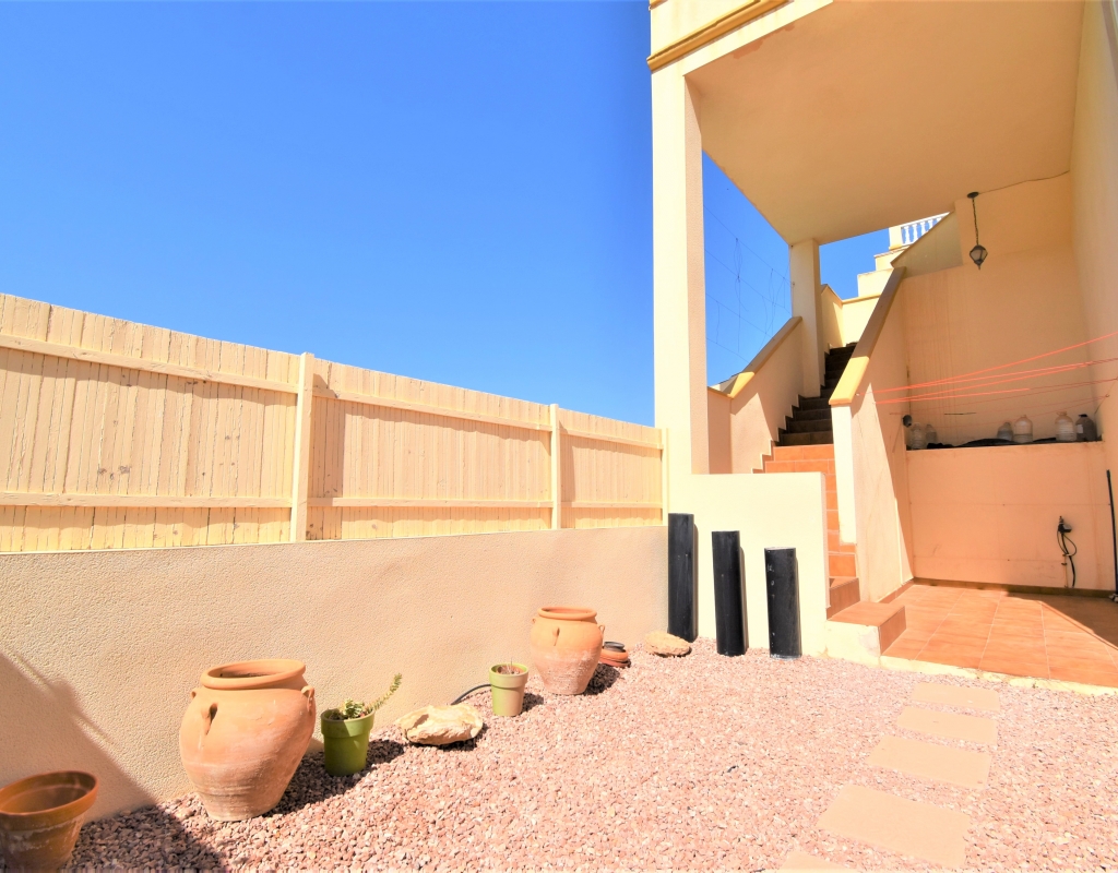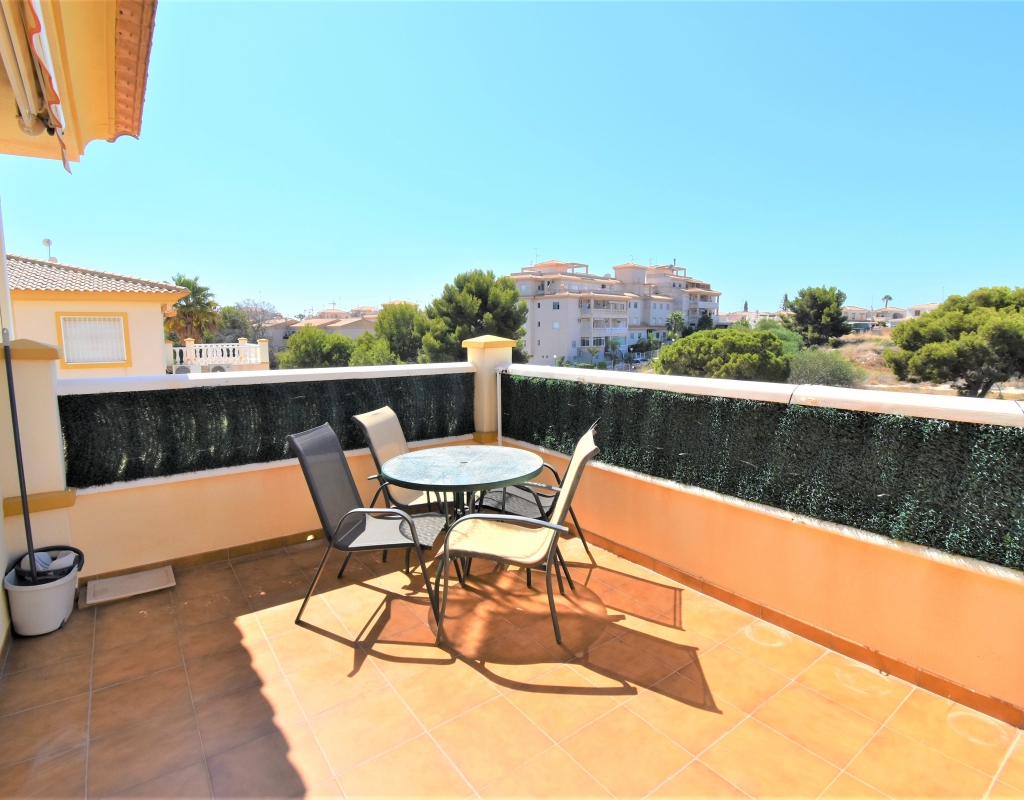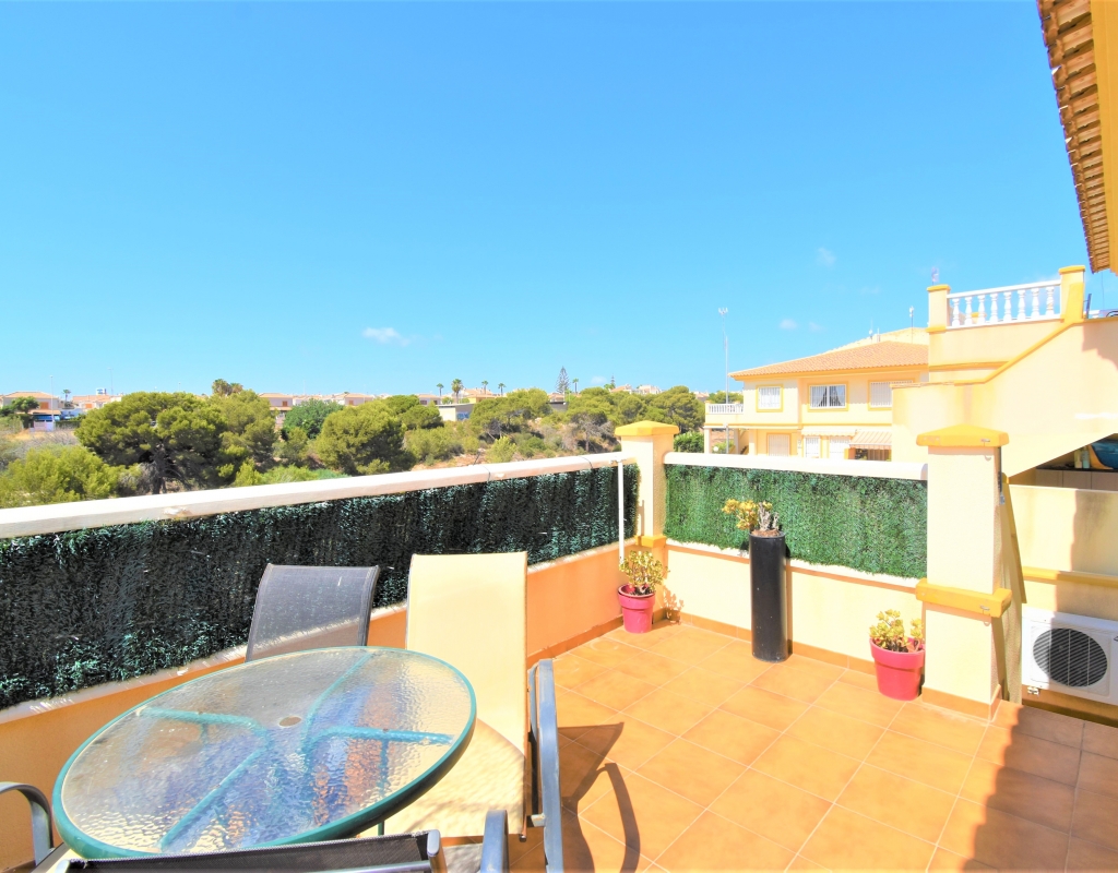 This Corner, South Facing, Two Bedroom, Top Floor Apartment in Playa Flamenca, is situated just 10 minutes on foot from a variety of restaurants/cafe bars. La Zenia Boulevard shopping centre is just a 2 minute drive, including the beach and a great choice of golf courses within a short drive radius. Situated within a secure gated community! Benefiting from the use of a communal swimming pool, private off road and gated community parking. This property is accessed via its own private ground floor garden; via the private staircase to the first floor terrace, an ideal space to dine outdoors, overlooking the communal pool next door and beyond to the community + surrounding areas; comprising inside of an open plan fully fitted kitchen; lounge/dining room with the mentioned terrace just off; two double bedrooms; and a family bathroom! Extras are to include fitted wardrobes in the main bedroom, air conditioning in both of the bedrooms, grills, electric fire and panel heaters, plus a storeroom!