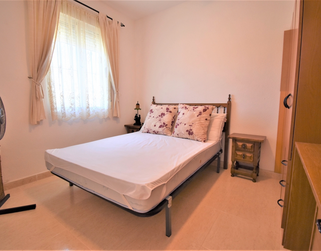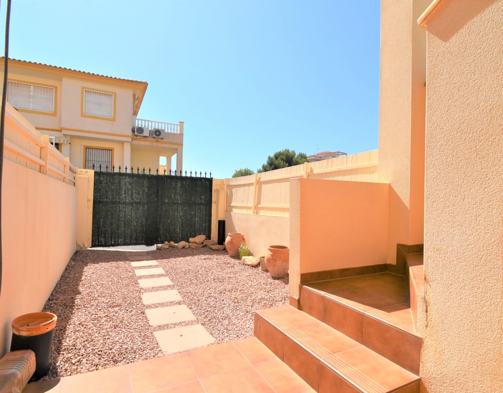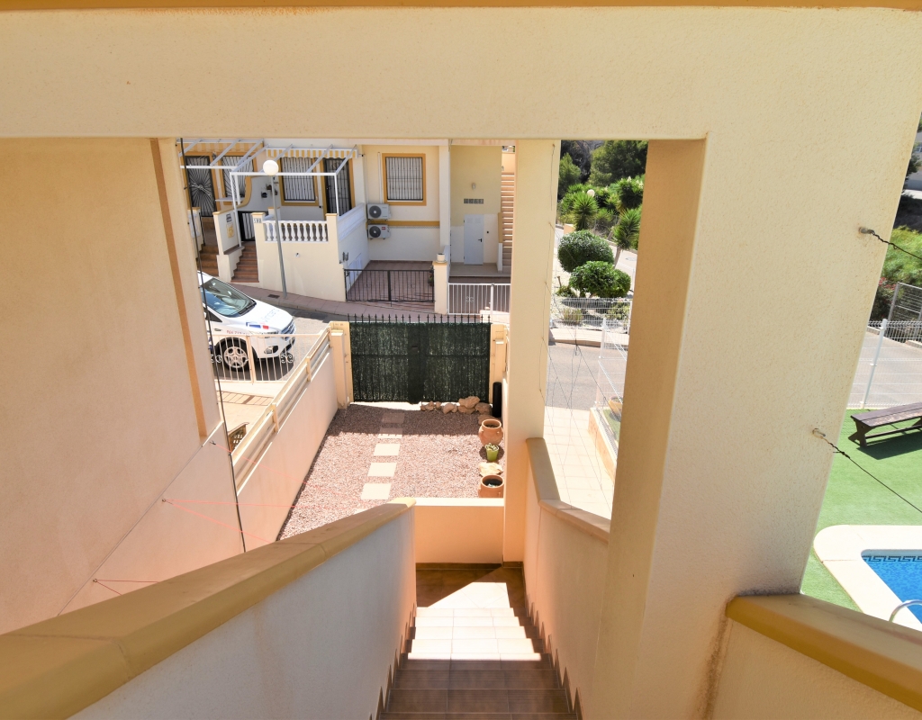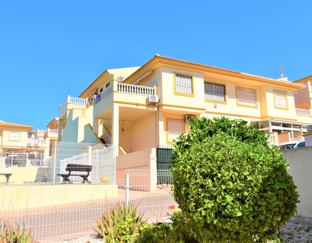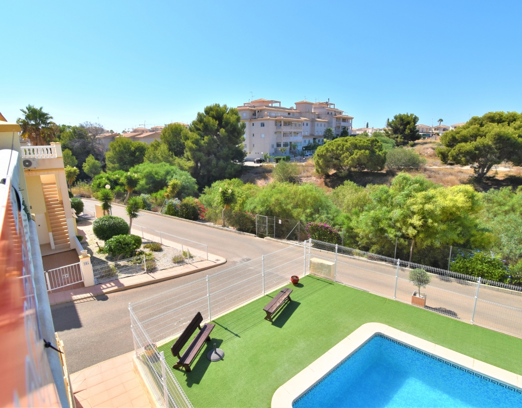 This Corner, South Facing, Two Bedroom, Top Floor Apartment in Playa Flamenca, is situated just 10 minutes on foot from a variety of restaurants/cafe bars. La Zenia Boulevard shopping centre is just a 2 minute drive, including the beach and a great choice of golf courses within a short drive radius. Situated within a secure gated community! Benefiting from the use of a communal swimming pool, private off road and gated community parking. This property is accessed via its own private ground floor garden; via the private staircase to the first floor terrace, an ideal space to dine outdoors, overlooking the communal pool next door and beyond to the community + surrounding areas; comprising inside of an open plan fully fitted kitchen; lounge/dining room with the mentioned terrace just off; two double bedrooms; and a family bathroom! Extras are to include fitted wardrobes in the main bedroom, air conditioning in both of the bedrooms, grills, electric fire and panel heaters, plus a storeroom!