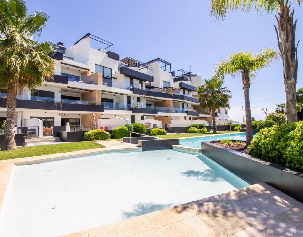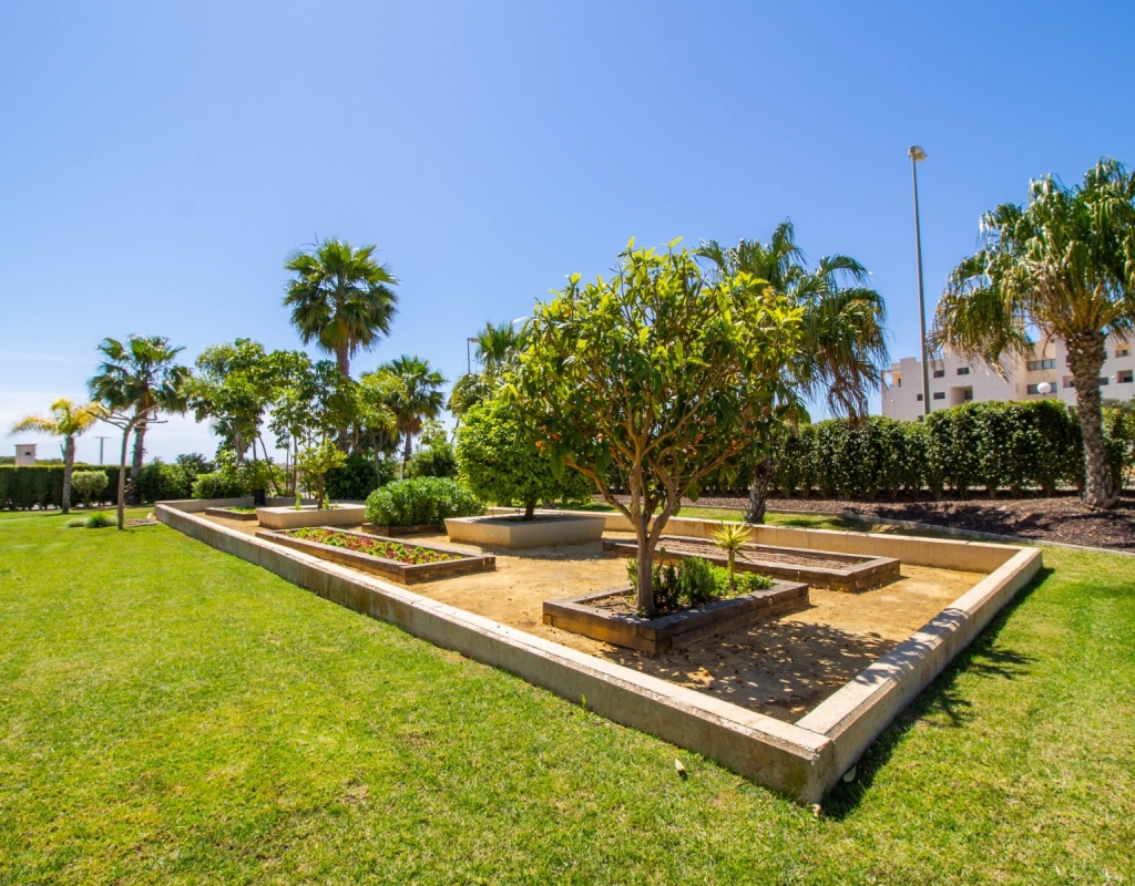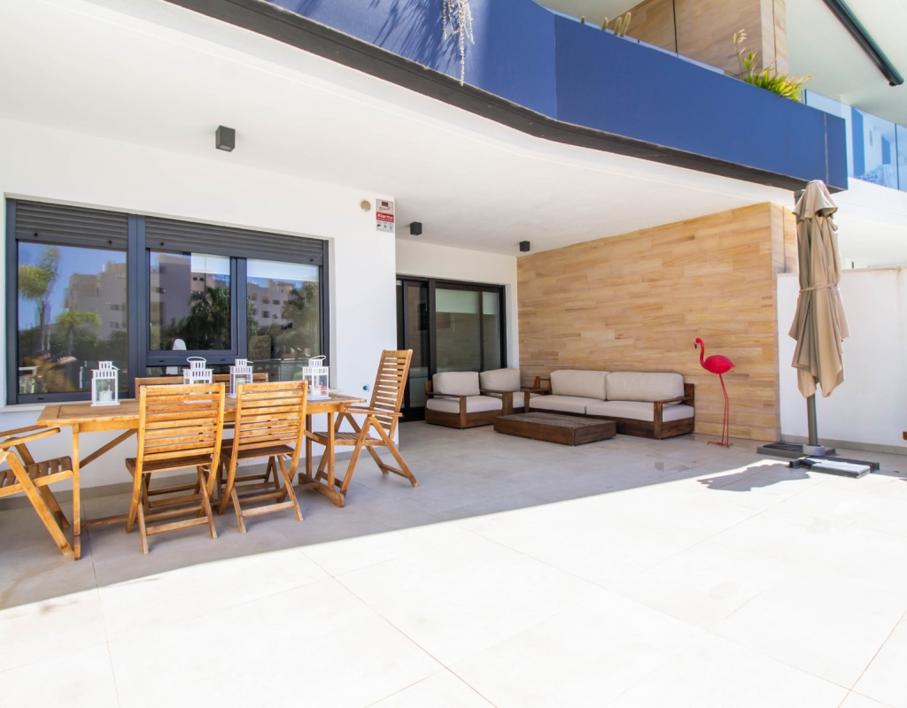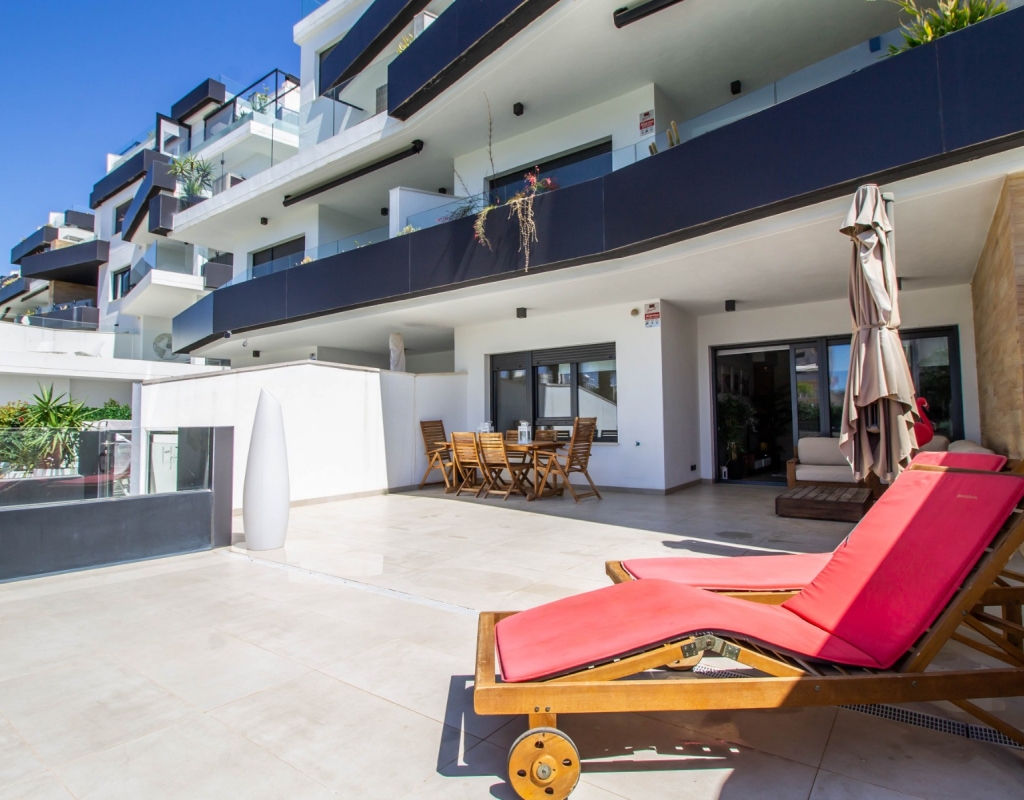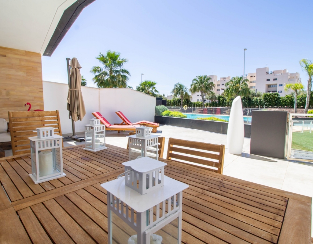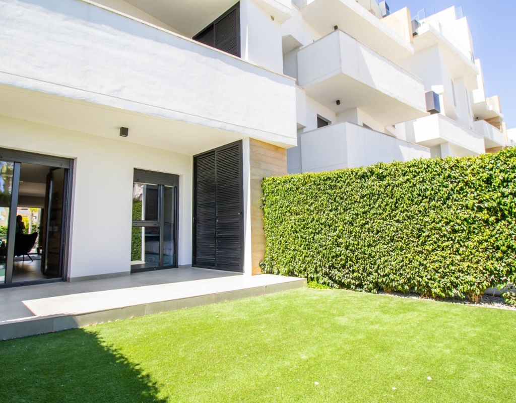 A South West Facing, As New, Two Bedroom, Ground Floor Apartment in Los Dolses, situated just a 20 minute walk to La Zenia Boulevard shopping centre, 15 minutes to Los Dolses commercial centre and Dia supermarket. Villamartin plaza and its popular golf course are just a few minutes drive and the beaches along the Orihuela Costa 10 minutes. The complex benefits from stunning communal gardens, to which this apartment has it´s own direct access to, the use of 2 pools, gym and spa. The apartment has been furnished and decorated to the most beautiful of standards, comprising: lounge with wall to wall sliding glazed doors leading out to the covered terrace area, dining area and open plan modern fitted kitchen with glazed door leading out to the rear garden, utility area; two double bedrooms with built-in wardrobes, master with en suite shower room; further family shower room. The most amazing outdoor space is offered with this property, so plenty of room for entertaining. The front garden which is tiled, has a beautiful outlook to the communal pool area, grassed with plenty of bushes and trees surrounding. The rear garden with a tiled terrace and a grassed area. Extras with this home include underground parking space with store room, ducted air conditioning,