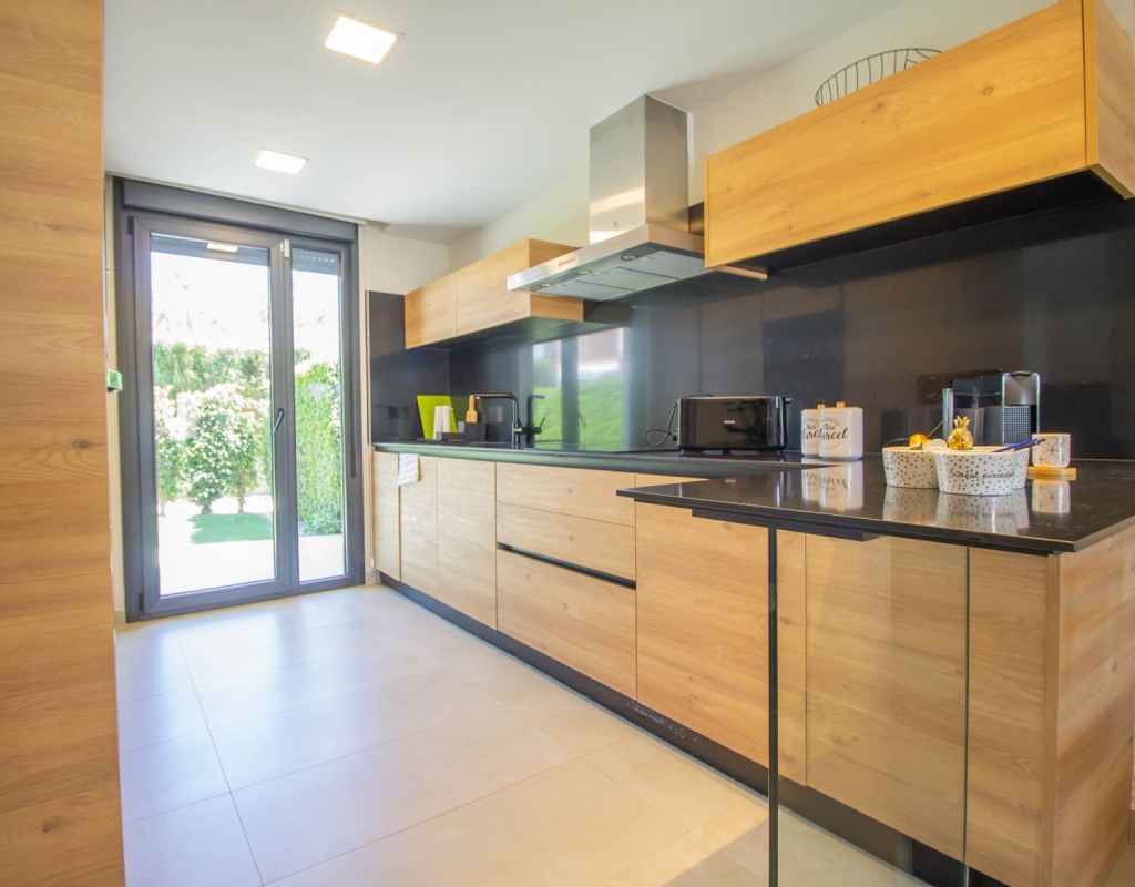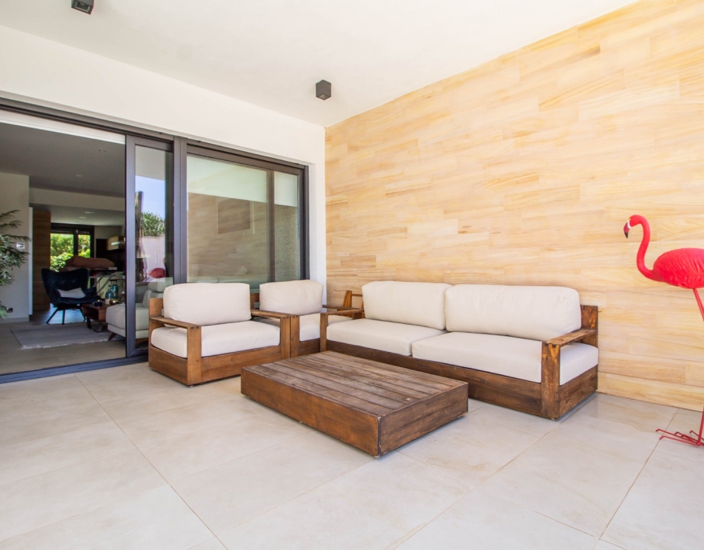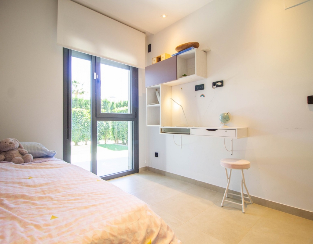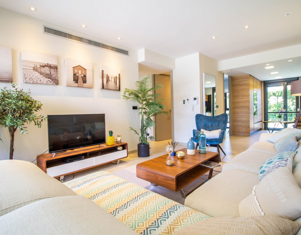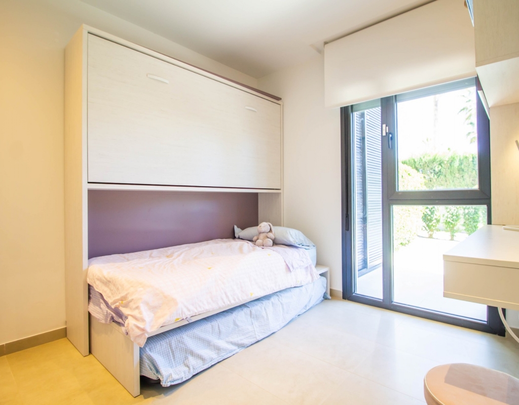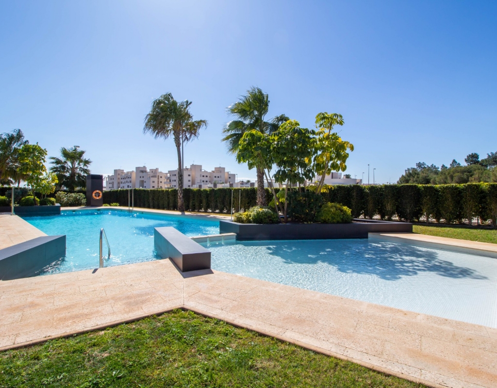 A South West Facing, As New, Two Bedroom, Ground Floor Apartment in Los Dolses, situated just a 20 minute walk to La Zenia Boulevard shopping centre, 15 minutes to Los Dolses commercial centre and Dia supermarket. Villamartin plaza and its popular golf course are just a few minutes drive and the beaches along the Orihuela Costa 10 minutes. The complex benefits from stunning communal gardens, to which this apartment has it´s own direct access to, the use of 2 pools, gym and spa. The apartment has been furnished and decorated to the most beautiful of standards, comprising: lounge with wall to wall sliding glazed doors leading out to the covered terrace area, dining area and open plan modern fitted kitchen with glazed door leading out to the rear garden, utility area; two double bedrooms with built-in wardrobes, master with en suite shower room; further family shower room. The most amazing outdoor space is offered with this property, so plenty of room for entertaining. The front garden which is tiled, has a beautiful outlook to the communal pool area, grassed with plenty of bushes and trees surrounding. The rear garden with a tiled terrace and a grassed area. Extras with this home include underground parking space with store room, ducted air conditioning,