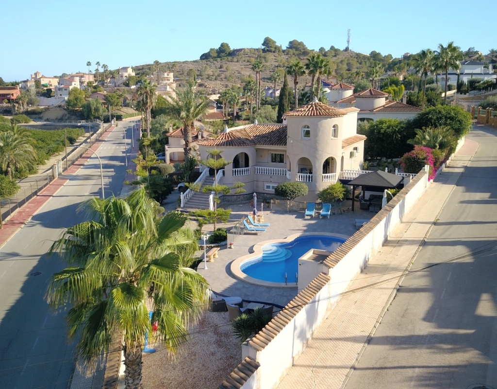 This Remarkable, West Facing, Corner, Five Bedroom Detached Villa in Lomas de La Juliana is located in a prominent position on the Costa Blanca South, under the area of Almoradi but closer to and conveniently situated between Algorfa village and the prestigious La Finca Golf, Hotel & Spa Resort. With a tennis club just at the top of the road and main brand amenities only a few minutes’ drive away, the blue flag beaches of Guardamar del Segura are also just 15 minutes away! This incredible property spans an impressive 375m² build size on a stunning 1,149m² plot, offering panoramic views of the countryside, citrus groves, mountains, and sunsets. The main villa has been fully updated and modernized, retaining its character and charm, and includes three bedrooms and three bathrooms. Upon entering, the hallway leads to an open-plan, fully fitted kitchen with a breakfast bar, a spacious family-sized living room with a cozy log-burning fireplace, and direct access to the large front covered terrace, perfect for appreciating the breathtaking views. There’s also a dining room with rear garden access, a shower room, and two bedrooms on the ground floor, one with an en-suite bath and shower. The upper-level master bedroom features a walk-through wardrobe, dressing table, and an en-suite shower room. The separate annex, located in the under-build, provides two additional bedrooms and a bathroom, accessed via the double garage or independently from the rear. This space includes a separate kitchen and dining area, a large bedroom with a living area and office, plus an en-suite shower. The garage is currently used as a games room with a pool table, ping pong, utility space, and an adjoining storeroom. Outside, the gravelled and tiled garden features an updated private swimming pool, a BBQ area, a small putting green, and ample space for outdoor dining and entertaining. Additional highlights include a carport, off-road parking, oil central heating, air conditioning throughout, ceiling fans, fitted wardrobes in the main villa, and dual entrances from different roads. This is an extraordinary opportunity to own a substantial and versatile property with fantastic views in an enviable location!