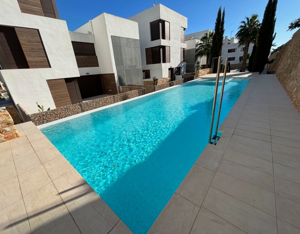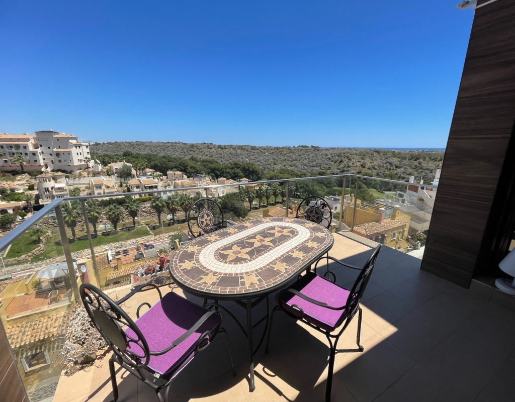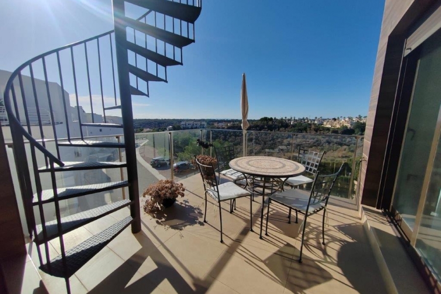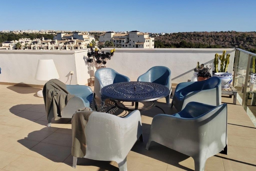 This South East Facing, Three Bedroom, Penthouse Apartment on Las Ramblas Golf, is located on the outskirts of Villamartin, just a five-minute drive to a supermarket, a variety of bars and restaurants. The renowned La Zenia Boulevard shopping centre and beautiful sandy beaches of the Orihuela Costa are less than 10 minutes away. This modern 90m² build offers a bright and spacious open-plan living area, enhanced by triple sliding glazed doors in the lounge that lead out to a partly covered terrace, perfect for relaxing or dining al fresco, enjoying a countryside view. The stylish, modern fitted kitchen is complemented by a separate utility room for added convenience. The apartment boasts three double bedrooms, all with built-in wardrobes, while the master bedroom benefits from access to a private terrace. There are also two sleek and contemporary shower rooms, one of which is en suite. A true highlight of this property is the external access to an incredible private solarium, where you can take in a sea and countryside view. Additional features include air conditioning, a lift in the block, basement parking with a private storage room, and access to a stunning communal pool, along with the use of three additional pools. A fantastic opportunity to own a luxurious penthouse in this prestigious golf location on the Costa Blanca South.