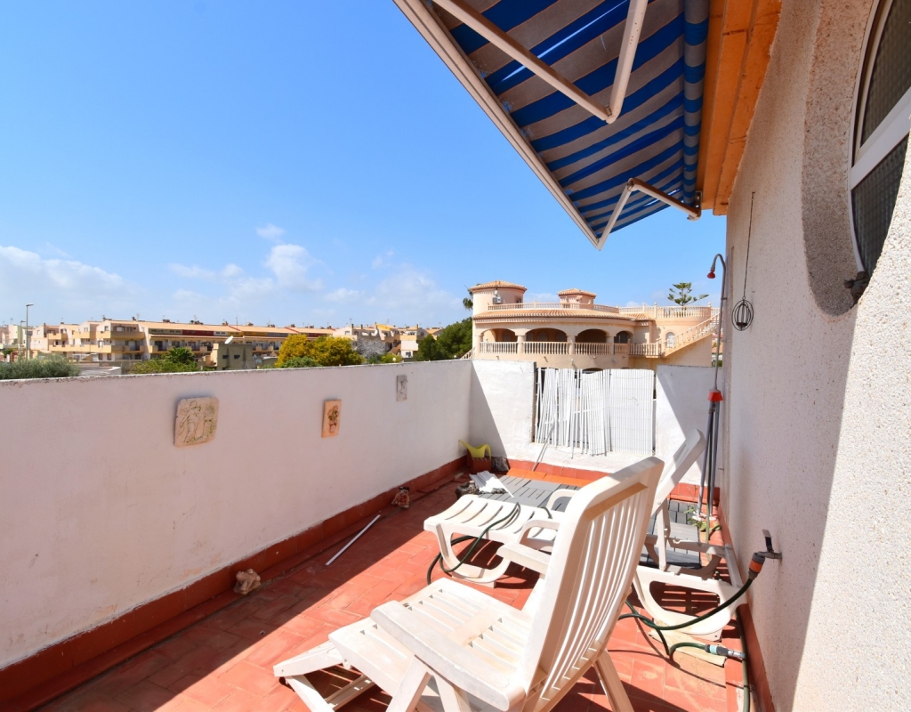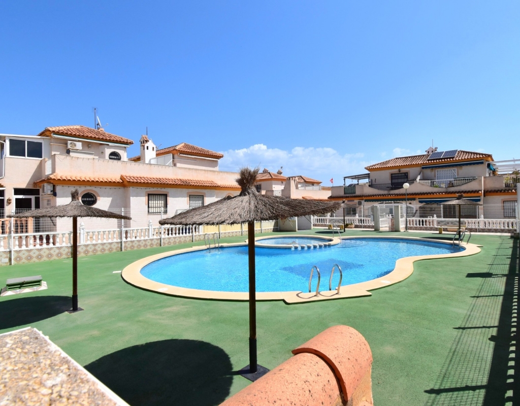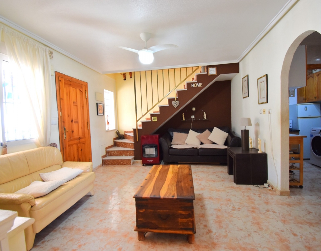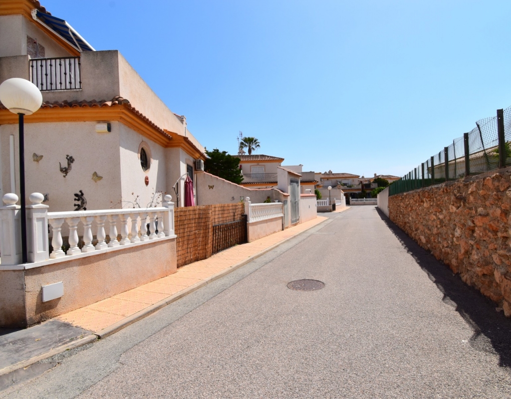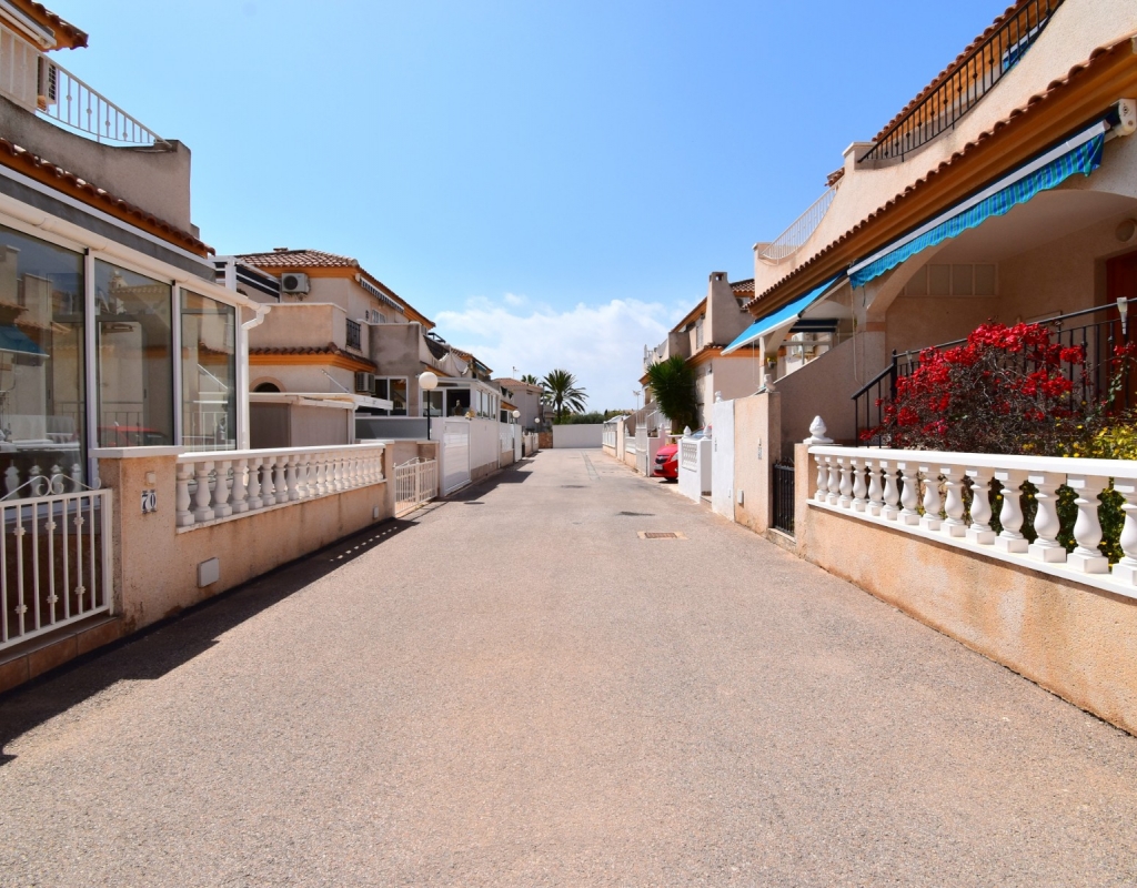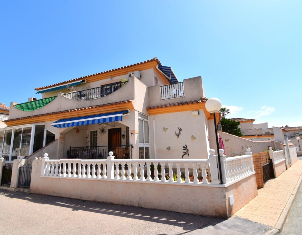 This West Facing, Two Bedroom, Corner Quad Villa in Playa Flamenca, is located in a popular and well-established area of the Costa Blanca South, just a 10-minute walk to a selection of restaurants and café bars. The vibrant La Zenia Boulevard shopping centre is around a 20-minute walk away, with the beautiful sandy beaches just a 5-minute drive. Several renowned golf courses can also be reached within 10 minutes, making this an ideal home for both permanent living and holiday enjoyment. The property is situated on a desirable corner plot and features a covered entrance terrace, perfect for morning coffee or evening relaxation. Inside, the bright lounge/dining room has stairs leading to the first floor, and an archway flows through to the fully fitted kitchen, which benefits from an adjoining utility room. The ground floor also offers a double bedroom and a shower room. Upstairs, you’ll find the second double bedroom with access to a lovely private terrace, along with a family bathroom. From this level, internal stairs lead to the private rooftop solarium—an ideal space for sunbathing. The garden is low maintenance with a combination of pebbled and tiled areas. Additional features include air conditioning, built-in wardrobes, access to a well-maintained communal pool, and gated community parking. This is a fantastic opportunity to own a charming and well-located home in the heart of Playa Flamenca!
