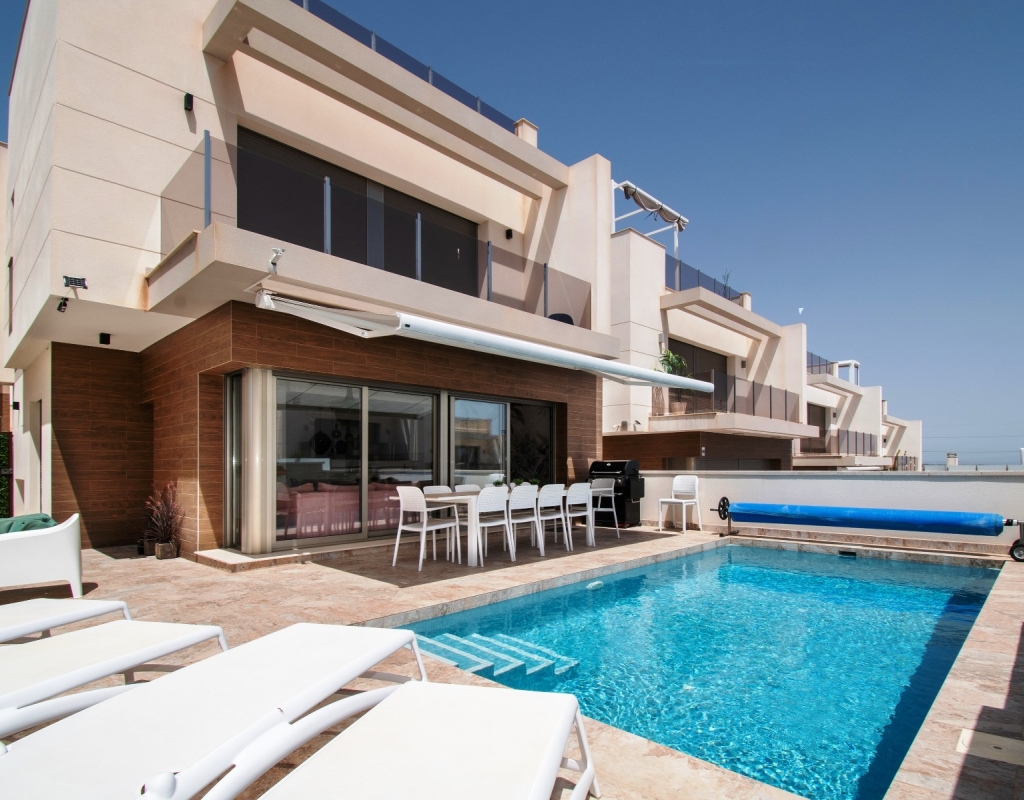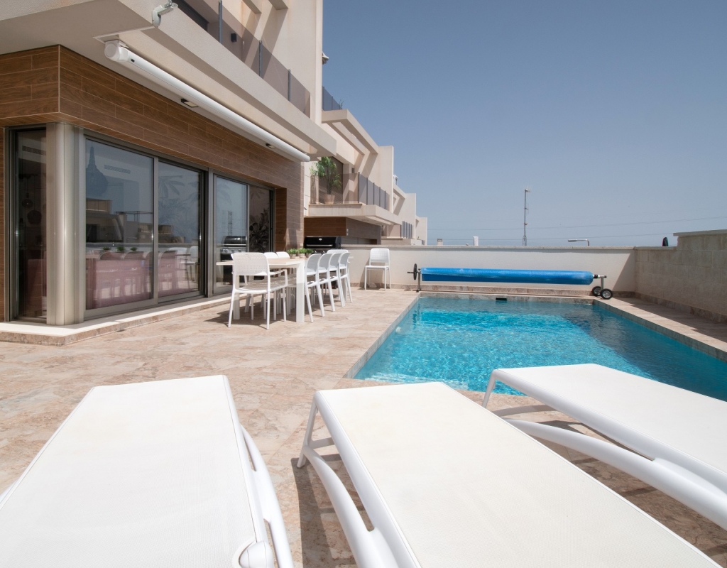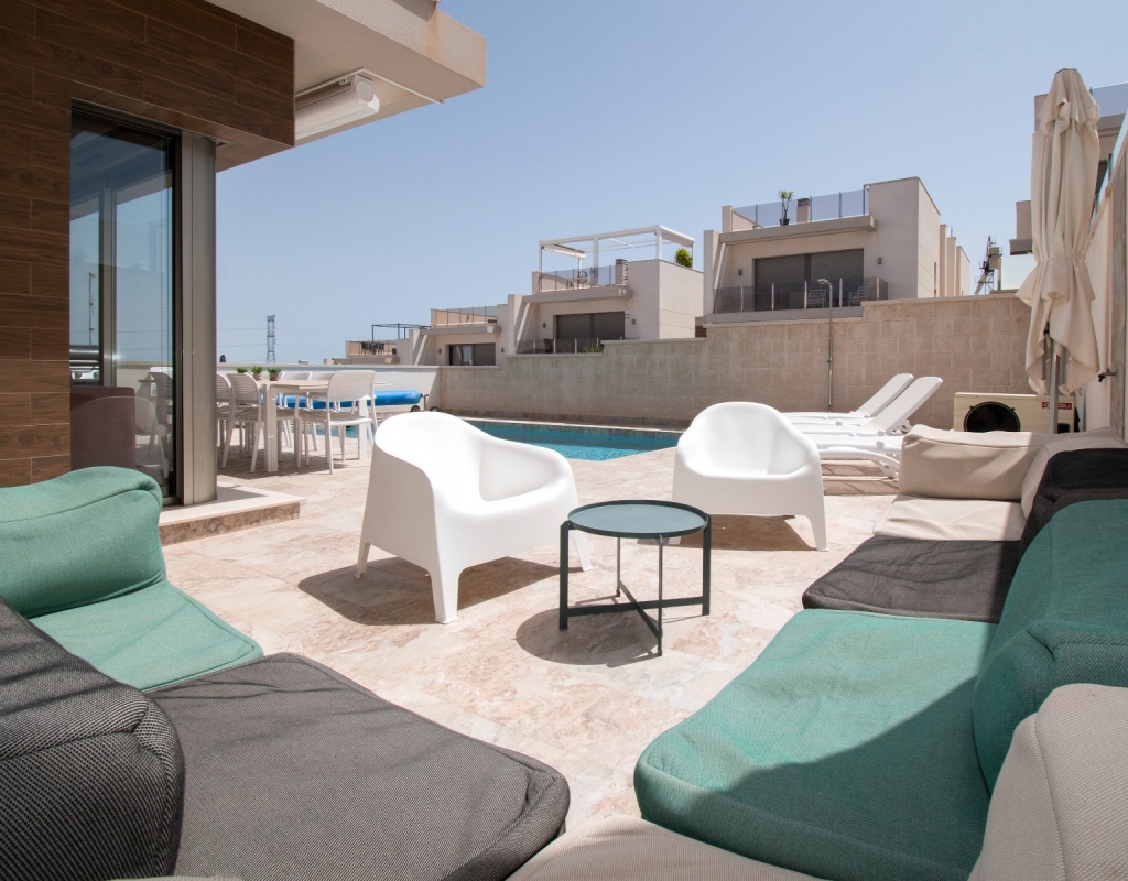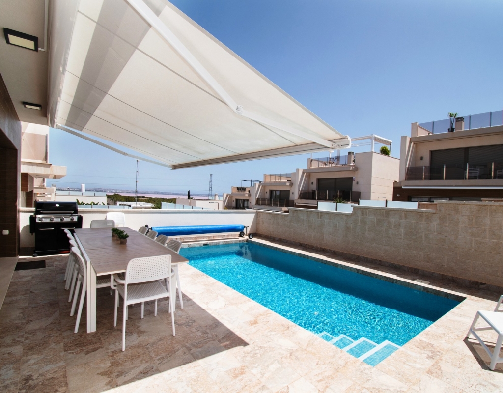 This East Facing, Five Bedroom, Detached Villa in Villamartin is located in the highly sought-after area of Orihuela Costa, Costa Blanca South, within just a 10 minute walk of local facilities and amenities, and only a 5 minute drive to the beautiful sandy beaches of the coast. Built in 2021, this modern and stylish villa boasts a generous build size of 190m2, designed with family living and entertaining in mind. The main level features a fully fitted open plan kitchen, a bright and spacious lounge/dining room with air conditioning, and direct access through sliding doors to a large tiled patio area with an impressive 8x4 private pool. Of the five bedrooms, three benefit from air conditioning and all have fitted wardrobes. Three of the bedrooms also have access to private terraces with stunning salt lake views. There are four contemporary shower rooms throughout the home. The underbuild offers fantastic additional space, including a separate utility room, a storeroom, and a second living and entertainment area — ideal for guests or family activities. A spacious solarium crowns the property, offering panoramic views over the salt lakes, perfect for relaxing or enjoying the Spanish sun. Outside, the low maintenance tiled garden provides ample space for outdoor living, and the property also benefits from off-road gated parking. This superb home is a perfect choice as a permanent residence, luxury holiday retreat, or investment opportunity in a prime location on the Costa Blanca South.