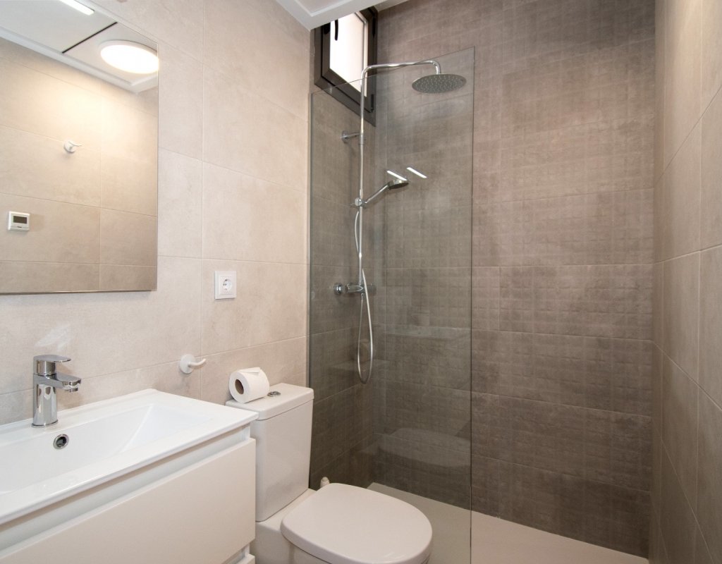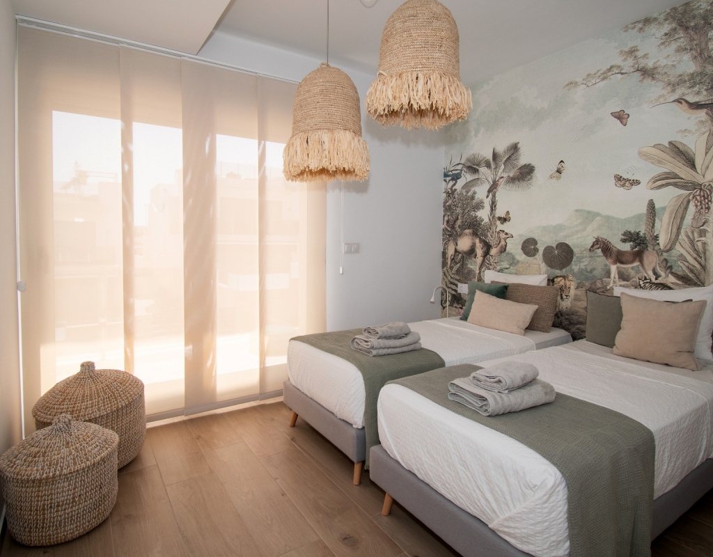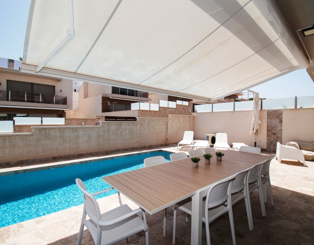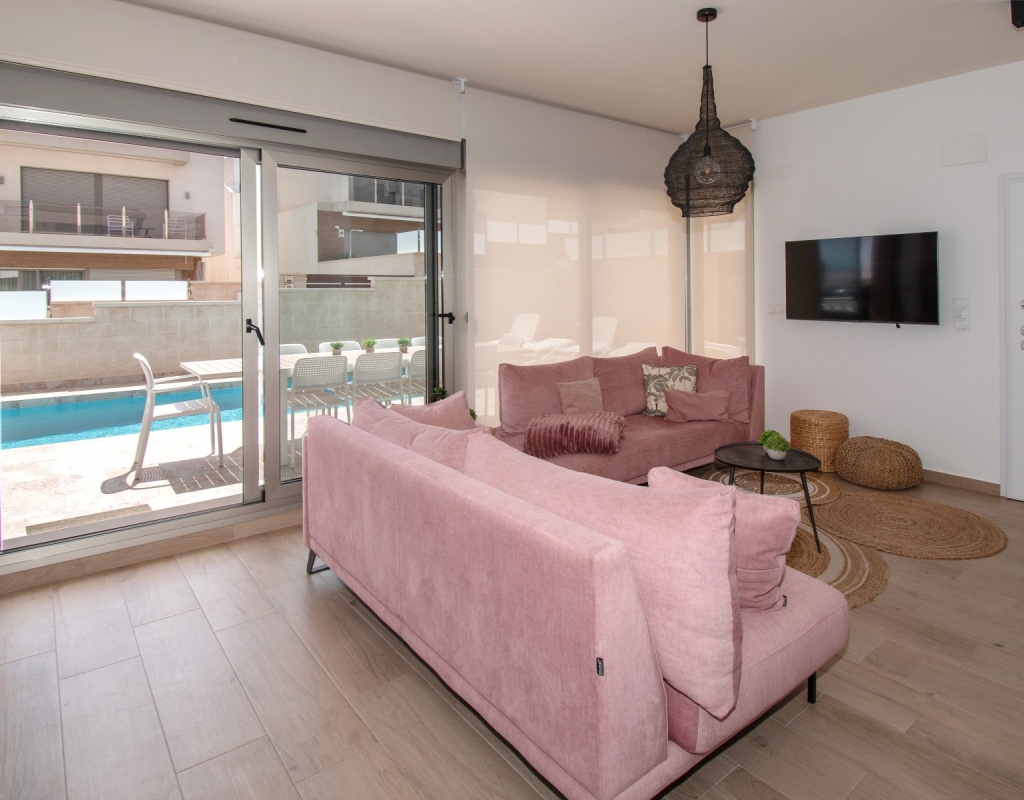 This East Facing, Five Bedroom, Detached Villa in Villamartin is located in the highly sought-after area of Orihuela Costa, Costa Blanca South, within just a 10 minute walk of local facilities and amenities, and only a 5 minute drive to the beautiful sandy beaches of the coast. Built in 2021, this modern and stylish villa boasts a generous build size of 190m2, designed with family living and entertaining in mind. The main level features a fully fitted open plan kitchen, a bright and spacious lounge/dining room with air conditioning, and direct access through sliding doors to a large tiled patio area with an impressive 8x4 private pool. Of the five bedrooms, three benefit from air conditioning and all have fitted wardrobes. Three of the bedrooms also have access to private terraces with stunning salt lake views. There are four contemporary shower rooms throughout the home. The underbuild offers fantastic additional space, including a separate utility room, a storeroom, and a second living and entertainment area — ideal for guests or family activities. A spacious solarium crowns the property, offering panoramic views over the salt lakes, perfect for relaxing or enjoying the Spanish sun. Outside, the low maintenance tiled garden provides ample space for outdoor living, and the property also benefits from off-road gated parking. This superb home is a perfect choice as a permanent residence, luxury holiday retreat, or investment opportunity in a prime location on the Costa Blanca South.