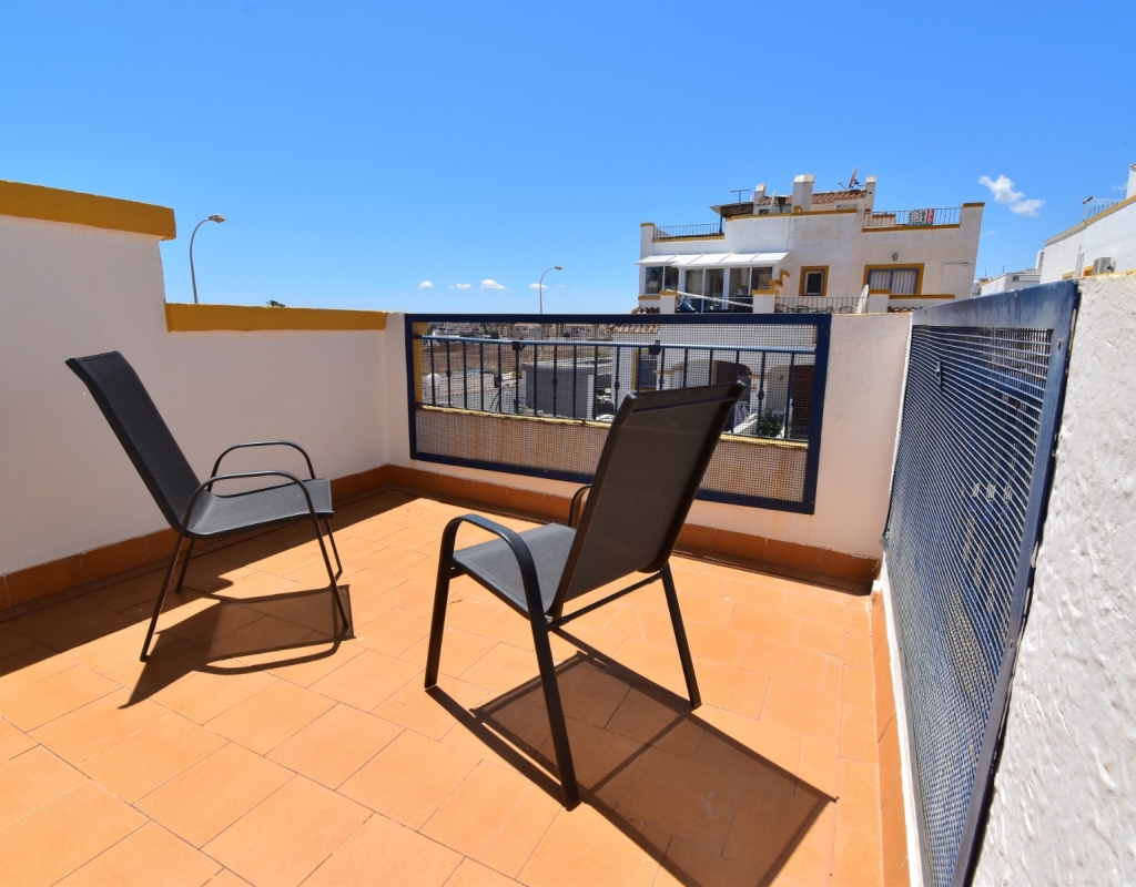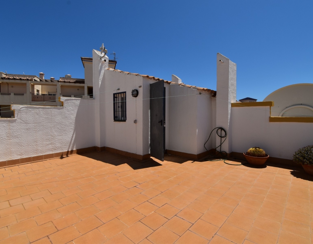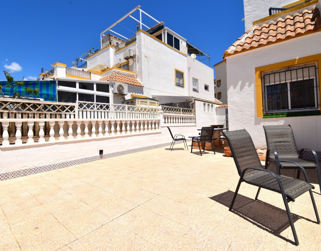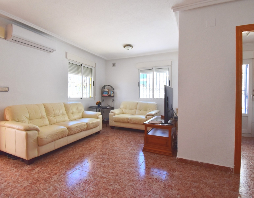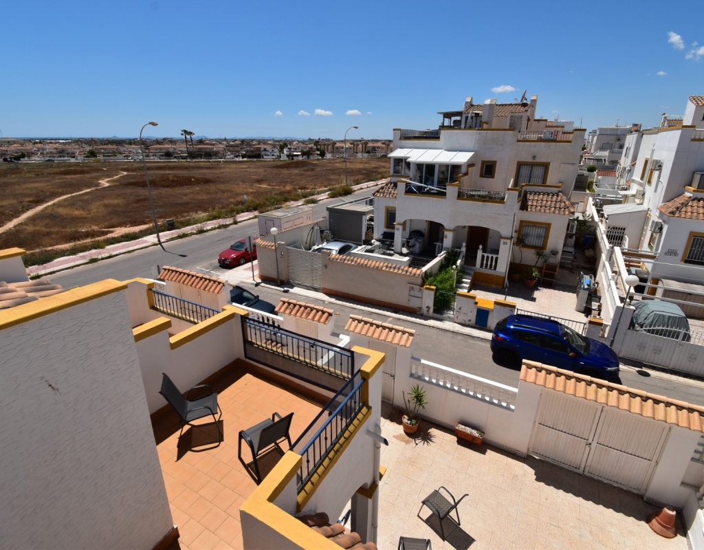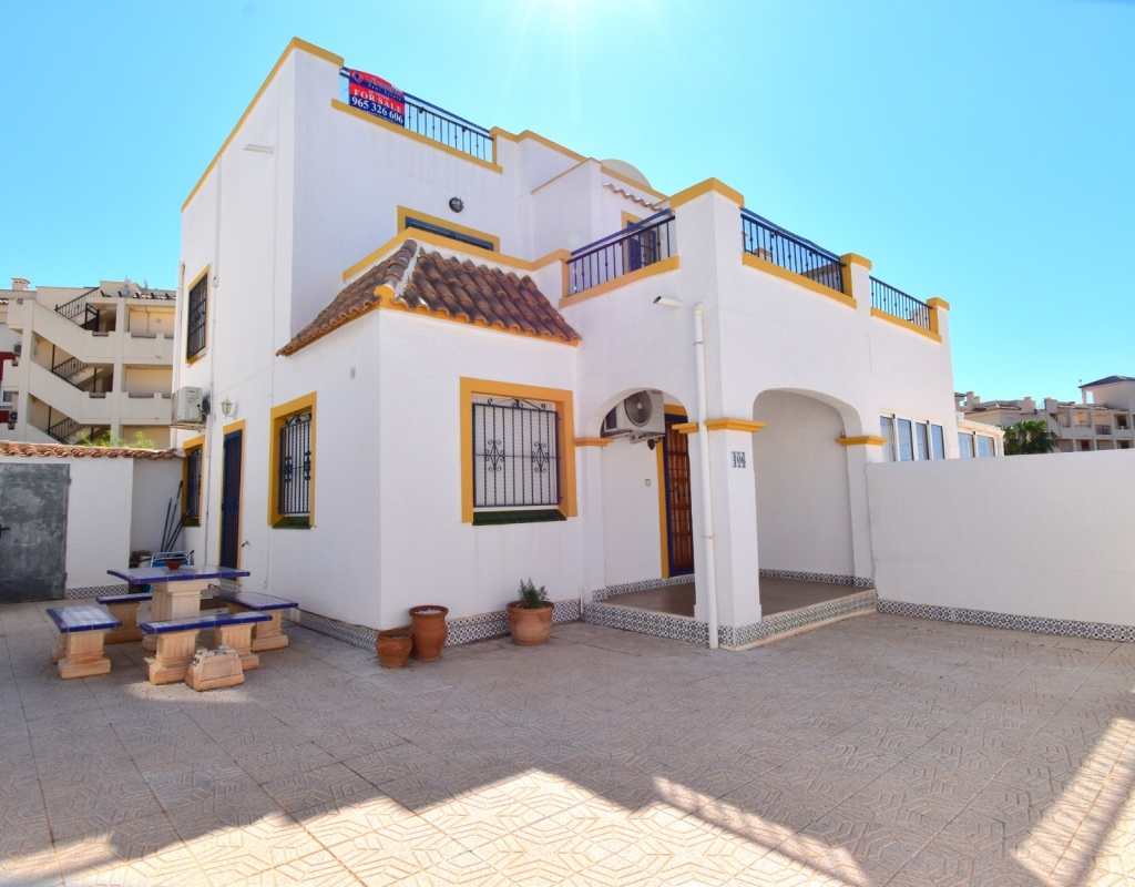 This South-West Facing, Three Bedroom, Semi Detached Villa in Playa Flamenca is located within just a five minute walk of a wide range of local facilities and amenities, and only a five minute drive from the stunning beaches of the Orihuela Costa. This spacious villa is in very good condition, featuring a separate fully fitted kitchen and security window and door grills throughout. All three bedrooms are doubles, with fitted wardrobes, and the master bedroom boasts access to a private terrace on the first floor. The property includes one bathroom and one shower room, with air conditioning throughout for year-round comfort. At the entrance, a small covered terrace provides a welcoming outdoor space, while internal stairs lead up to the private solarium, offering area views and distant sea views. Outside, the villa benefits from a tiled, low-maintenance garden with off-road parking, a useful storeroom, and access to a lovely communal swimming pool. Located in the heart of Costa Blanca South, this home offers an ideal blend of convenience, comfort, and coastal living.