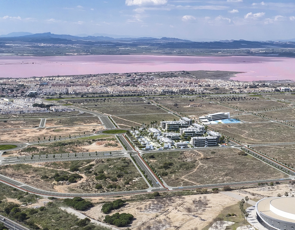 These East or West Facing, Brand New, Two Bedroom, Bungalow style Apartments in La Siesta are located on the edge of the stunning salt lakes, just a 5-minute drive to the Habaneras shopping centre, Carrefour superstore, and a wide choice of café bars and restaurants. Set on the outskirts of Torrevieja, known for its promenade, International Marina and sandy beaches, plus a selection of popular golf courses are all within a 20-minute drive, offering the perfect blend of natural beauty and modern convenience on the Costa Blanca South. This stylish new complex, one of various being built by this exceptional constructor, offers a variety of apartment layouts from 79m2 across ground and top floors — all arranged around a beautifully designed, feature heated communal pool area. Ground floor properties boast private gardens, while top floor units benefit from spacious solariums, perfect for soaking up the Mediterranean sun. Each apartment features a bright, modern, open-plan living area with direct access to a private terrace overlooking the pool, lagoon and landscaped gardens. The fitted kitchen includes a separate utility area for added convenience. There are two double bedrooms with built-in wardrobes, master including an en suite shower room and access to the private terrace. There is also a further family shower room. Additional features include, intercom system, and air conditioning throughout. Residents of the complex also enjoy access to an exclusive sport and spa club offering facilities such as a sauna, gym, and jacuzzi — ideal for both relaxation and wellbeing. Whether you’re looking for a permanent home, a stylish holiday getaway, or a solid investment, these brand new homes in La Siesta offer outstanding value in a well-connected location.